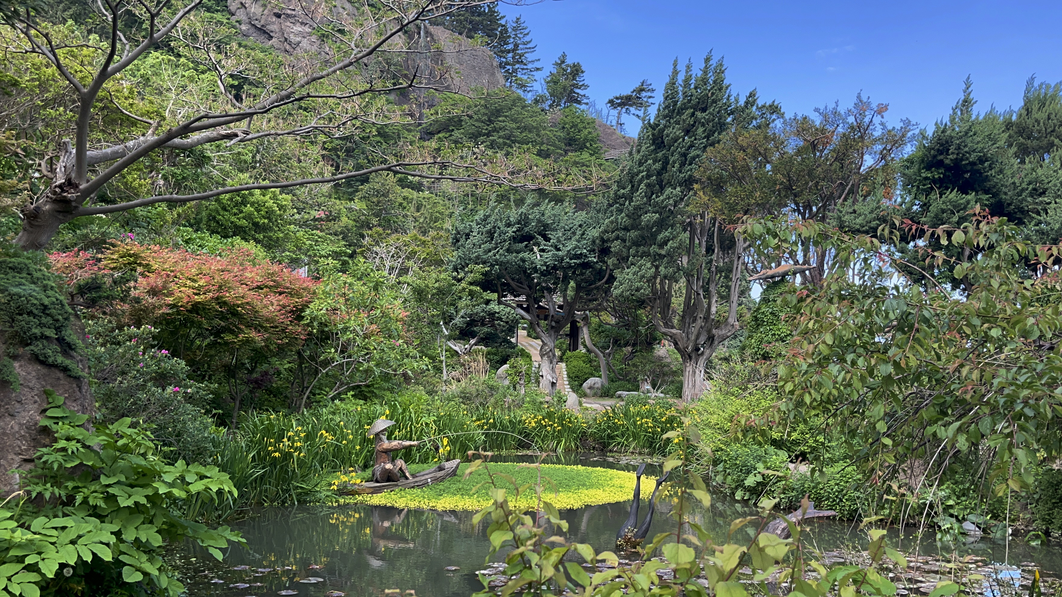 사람이 만든 무릉도원이라고 설명해야 할까요? 예림원은 울릉도 최초의 분재 식물원이자 국내 최초의 문자조각에술공원입니다. 울릉도 자생 분재 300여 점과 울릉도 자연석을 이용한 대형 바위 조형물 70여 점, 향나무 등 울릉도 자생 수목 400여 그루가 심겨 있는 또 하나의 나라 같은 곳인데, 드리워진 수목을 따라 걷다 하늘 위로 시선을 돌리면 시원하게 떨어지는 폭포수가 눈에 들어옵니다.