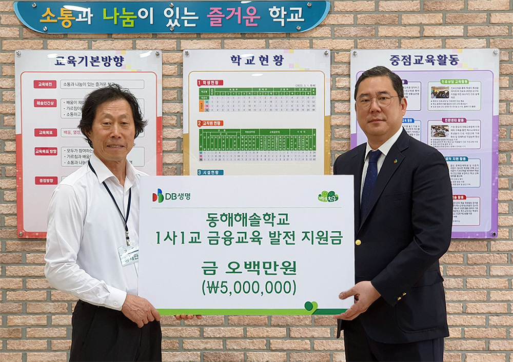 DB생명(대표이사 사장 김영만)은 지난 6월 강원도 지역 4개 학교(동해해솔, 묵호초, 창호초, 삼척중앙초)에 1사1교 금융교육 발전 지원금으로 각 500만 원씩 전달했다고 7월 18일 밝혔다.