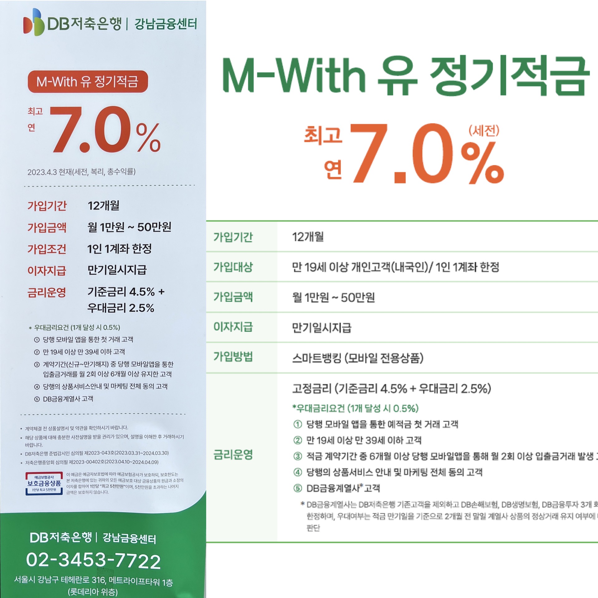 2022년 10월 금리 경쟁으로 예금 금리가 5%대 까지 올랐을 때 본점에서 한 명을 지원 받아 창구 네 곳에서 하루 10억 원 예치를 업무시간 내에 잘 마무리 한 적도 있었다. 2023년 6월에는 온라인에서 우대요건을 충족하면 최고 연 7% 금리를 적용 받는 DB저축은행 ‘M-With 유 정기적금’가 ‘청년도약계좌’와 비교해 가입조건과 금리혜택에 더 좋다고 소개돼 화제가 되기도 했다.