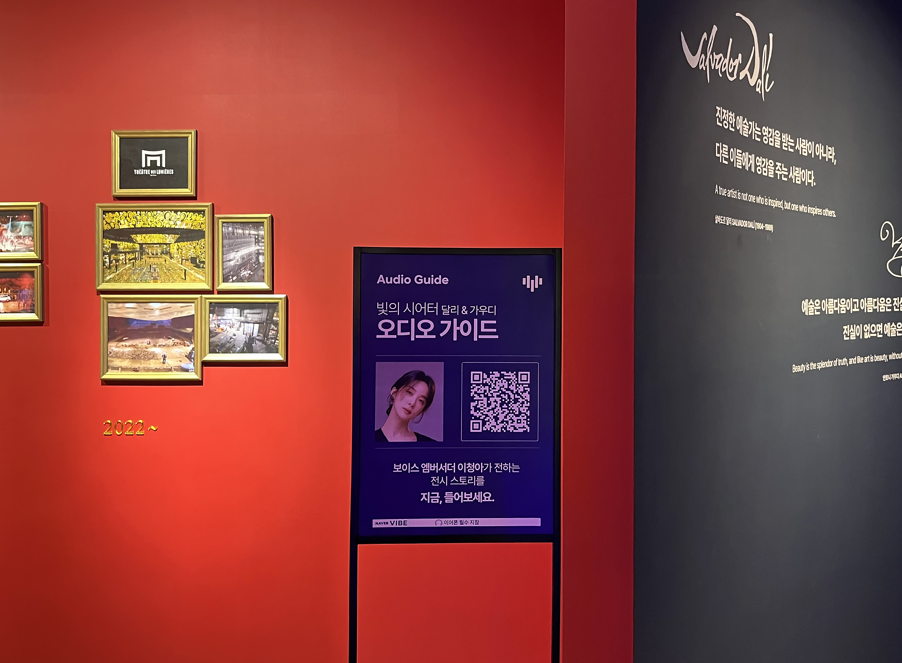빛의 시어터 전시는 약 35분의 Long Show 와 10분의 Short Show, 그리고 별도로 마련된 공간인 스튜디오 룸에서 약 10분의 Contemporary Show 총 3가지 전시로 이루어져 있습니다. 또한 개별적인 공간에서 들을 수 있는 1:1 유료 도슨트 프로그램도 함께 운영 중인데요. 유료 도슨트를 이용하지 않더라도 바이브 앱을 통해 무료 도슨트를 들을 수 있습니다. 특히 이번 달리와 가우디의 전시는 배우 이청아 님이 직접 도슨트 녹음에 참여해 더욱 특별한 전시를 즐길 수 있습니다.