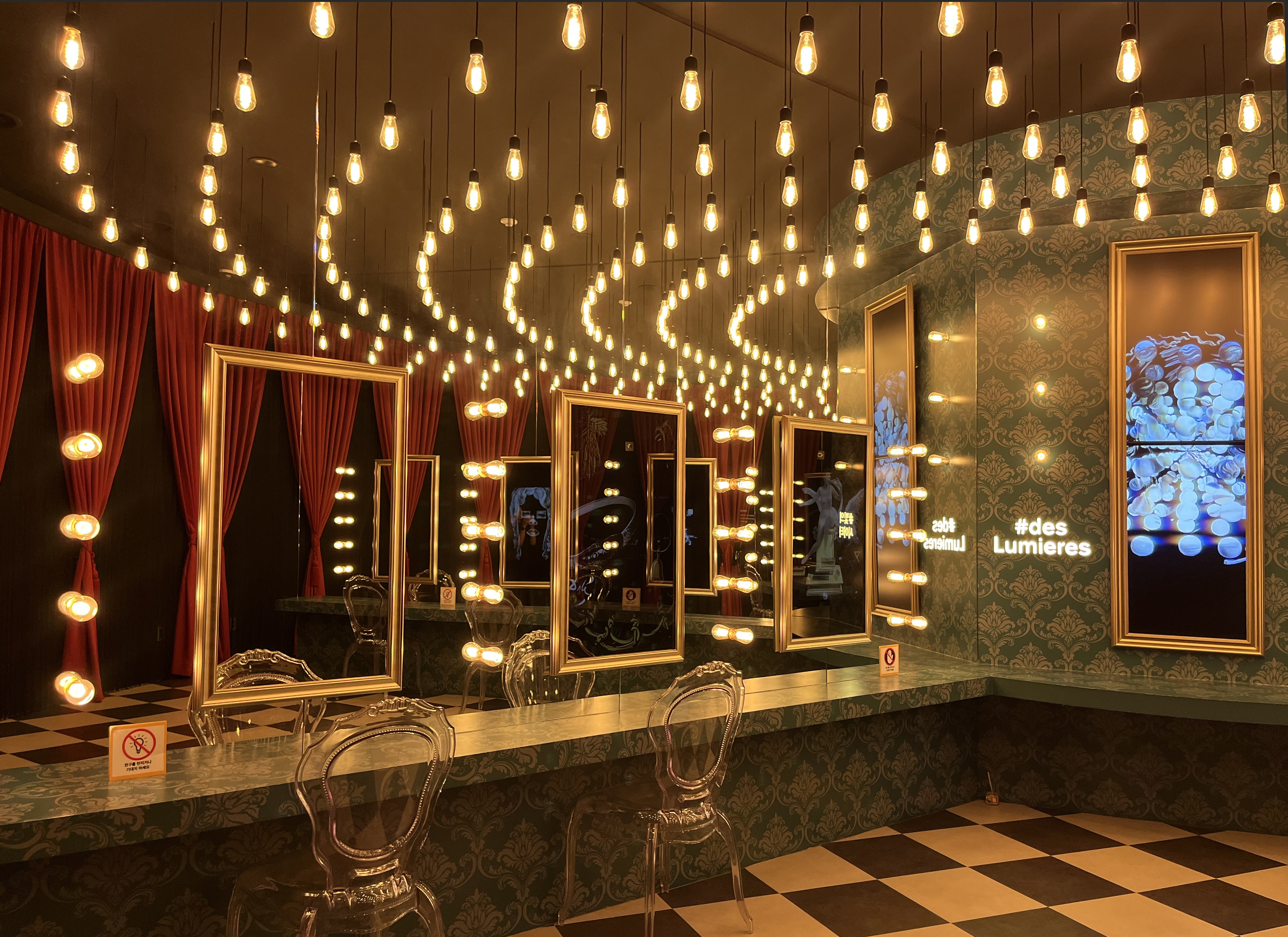 빛의 시어터에는 Contemporary Show가 상영되는 스튜디오 룸 외에 또 하나의 숨겨진 공간, 그린룸이 있습니다. 분장실 또는 대기실을 뜻하는 그린룸은 극장에서 배우의 분장실이나 휴게실 벽을 마음의 안정을 주는 녹색으로 칠한 것에서 유래한 단어라고 하는데요. 조명이 화려한 이곳에서 예쁜 사진을 남기며 공연을 준비하는 주인공을 상상해 보는 것도 좋을 것 같습니다.