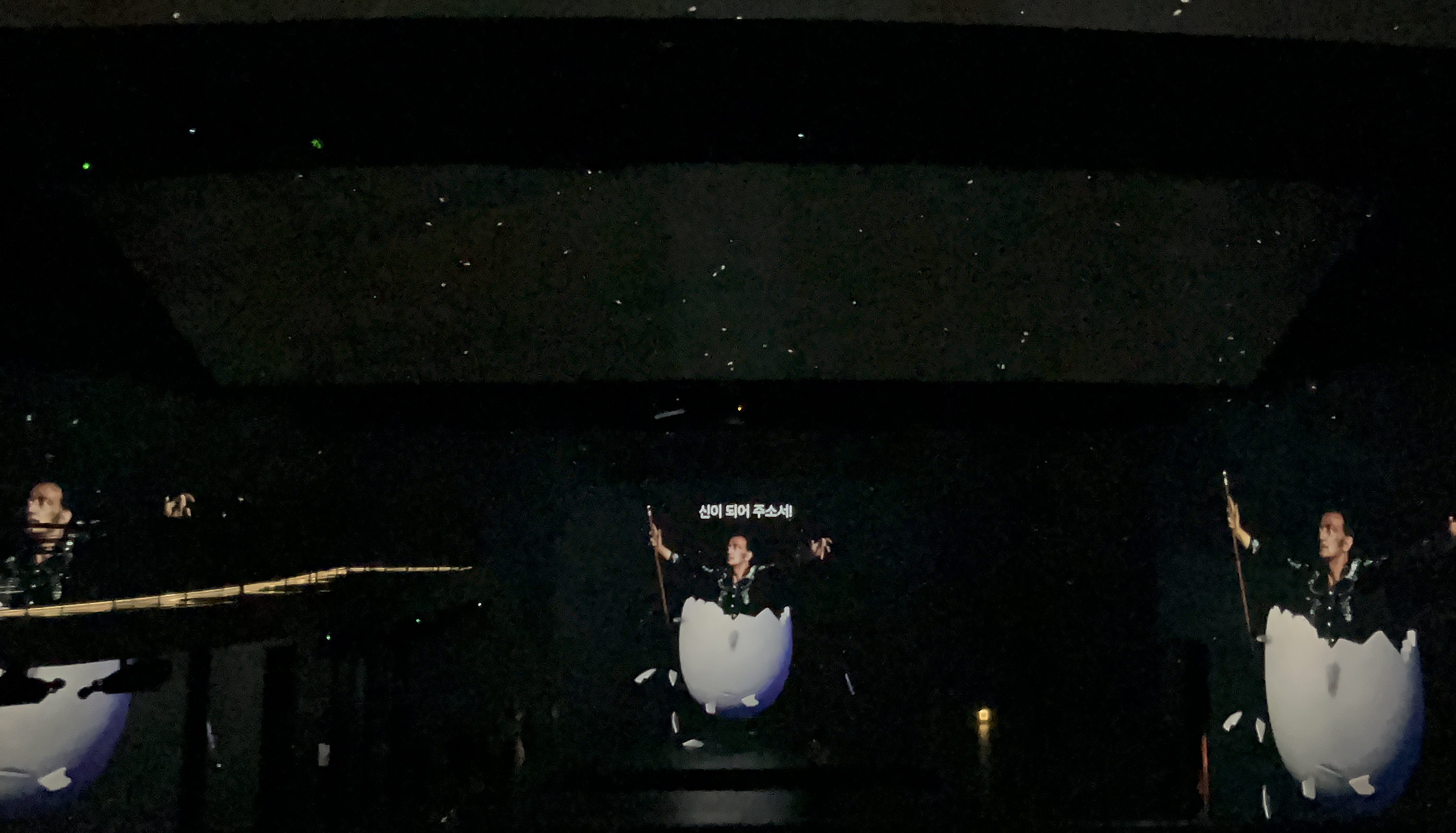전시가 시작되면 이윽고 검은 화면 속 떠다니는 작은 흰 물체들 사이로 달걀이 나타나요. 달리에 게 달걀은 중요한 상징물로서 새로운 탄생이나 소중한 생명을 의미한다고 하는데요. 달리의 부활과 함께 전시는 시작됩니다.