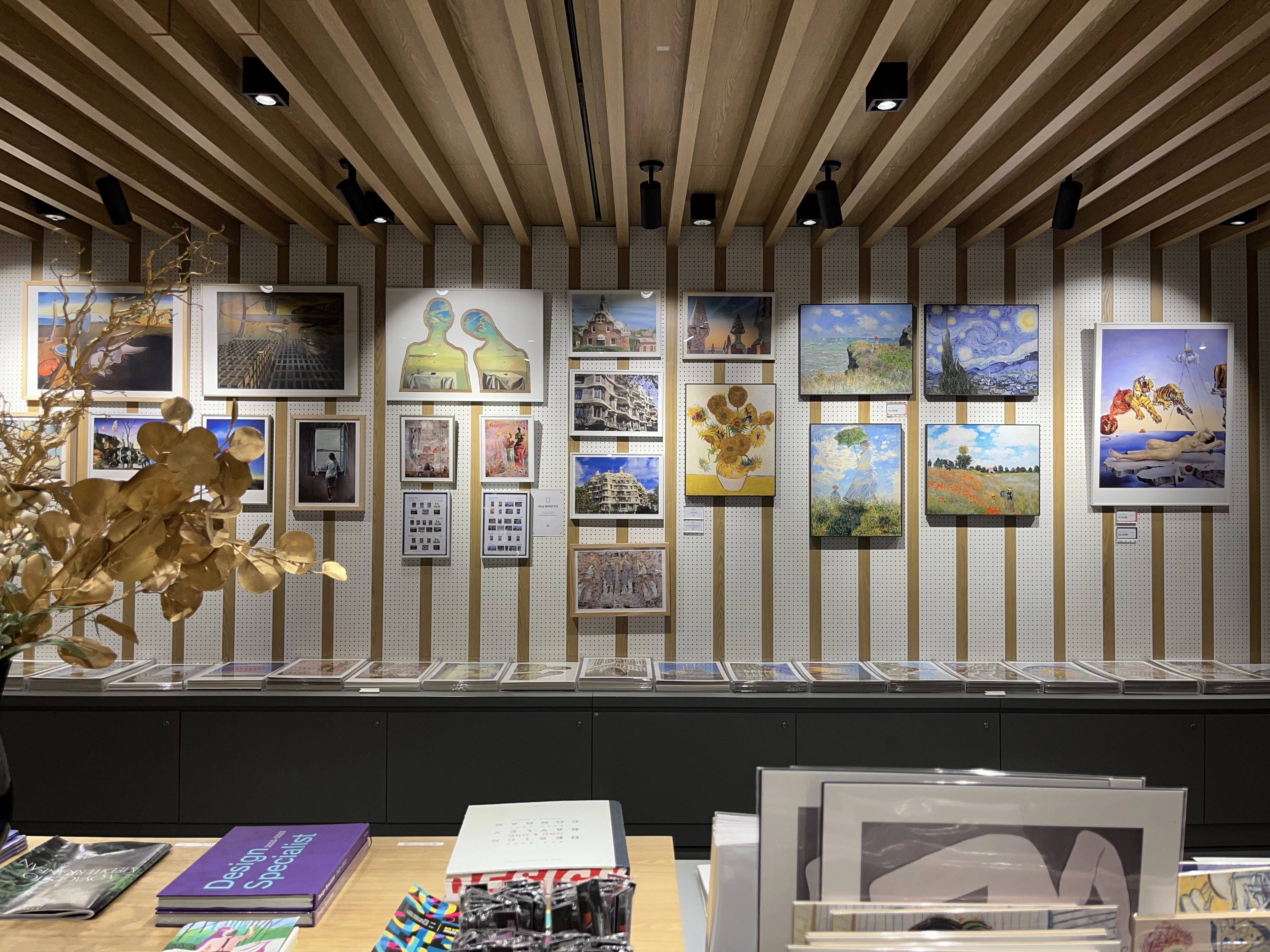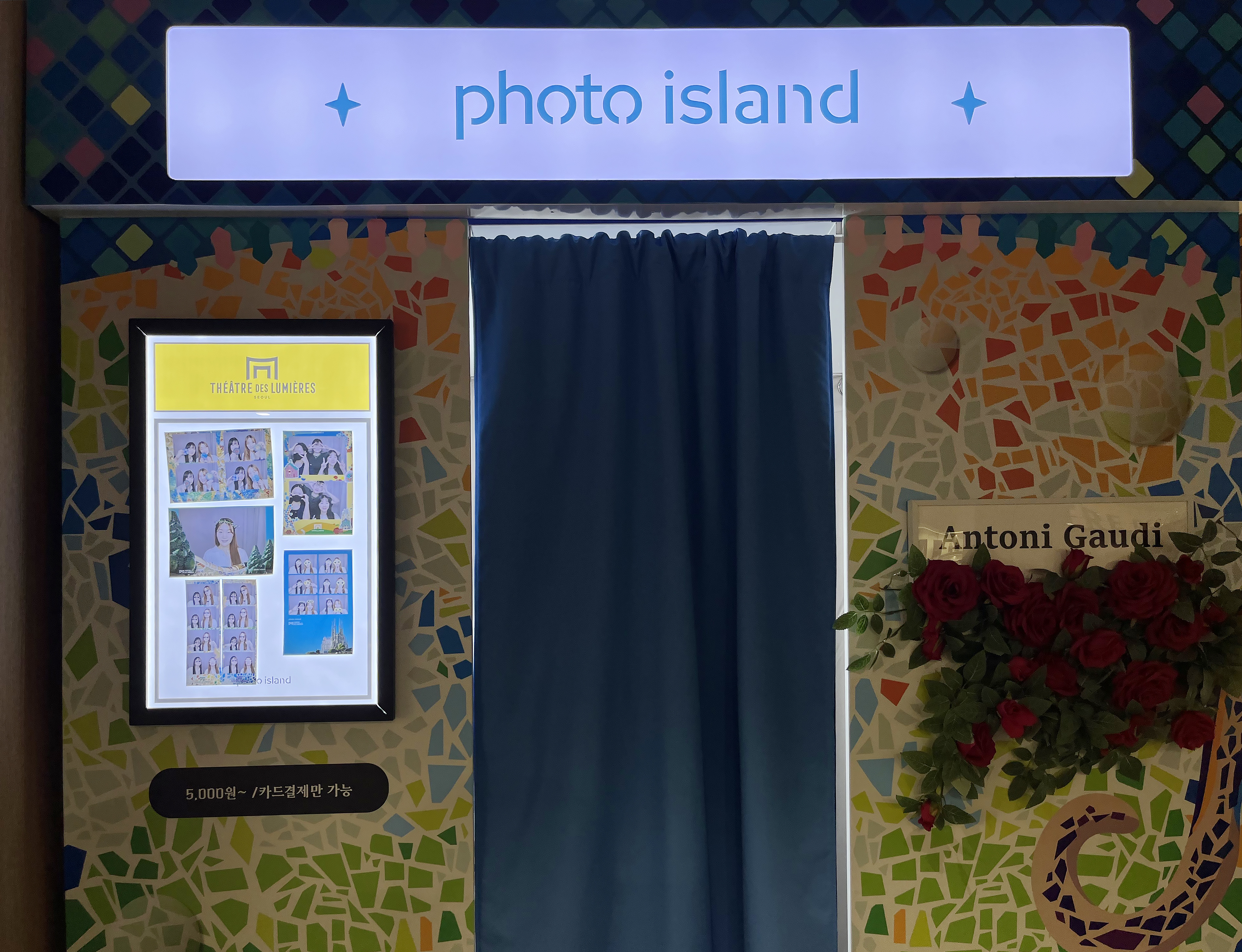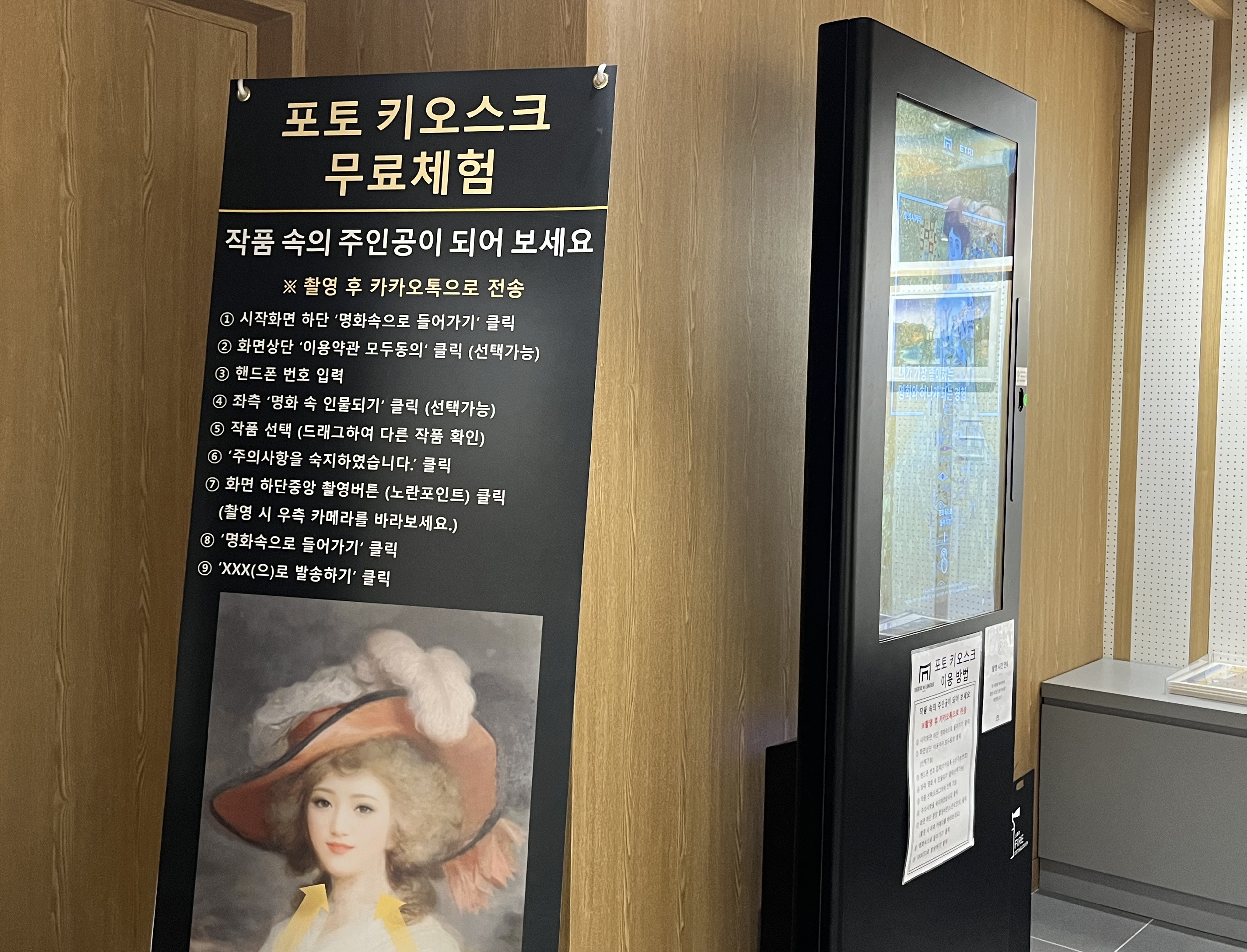 아트샵의 한켠에는 전시를 기억할 수 있는 포토부스와 키오스크가 마련되어 있었는데요. 포토부스에서는 가우디의 건축물을 배경으로 한 즉석 사진을 찍을 수 있고, 무료 체험이 제공되는 포토 키오스크에서는 즉석에서 촬영한 내 모습을 명화 속 인물로 만들어 카카오톡으로 발송할 수 있습니다. 얼굴의 방향이나 표정을 명화 속 인물과 유사하게 조정해 재미있는 추억들을 남겨보세요.