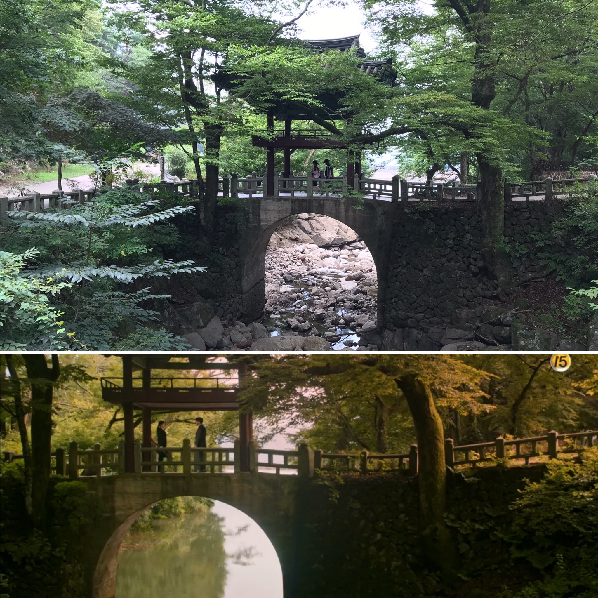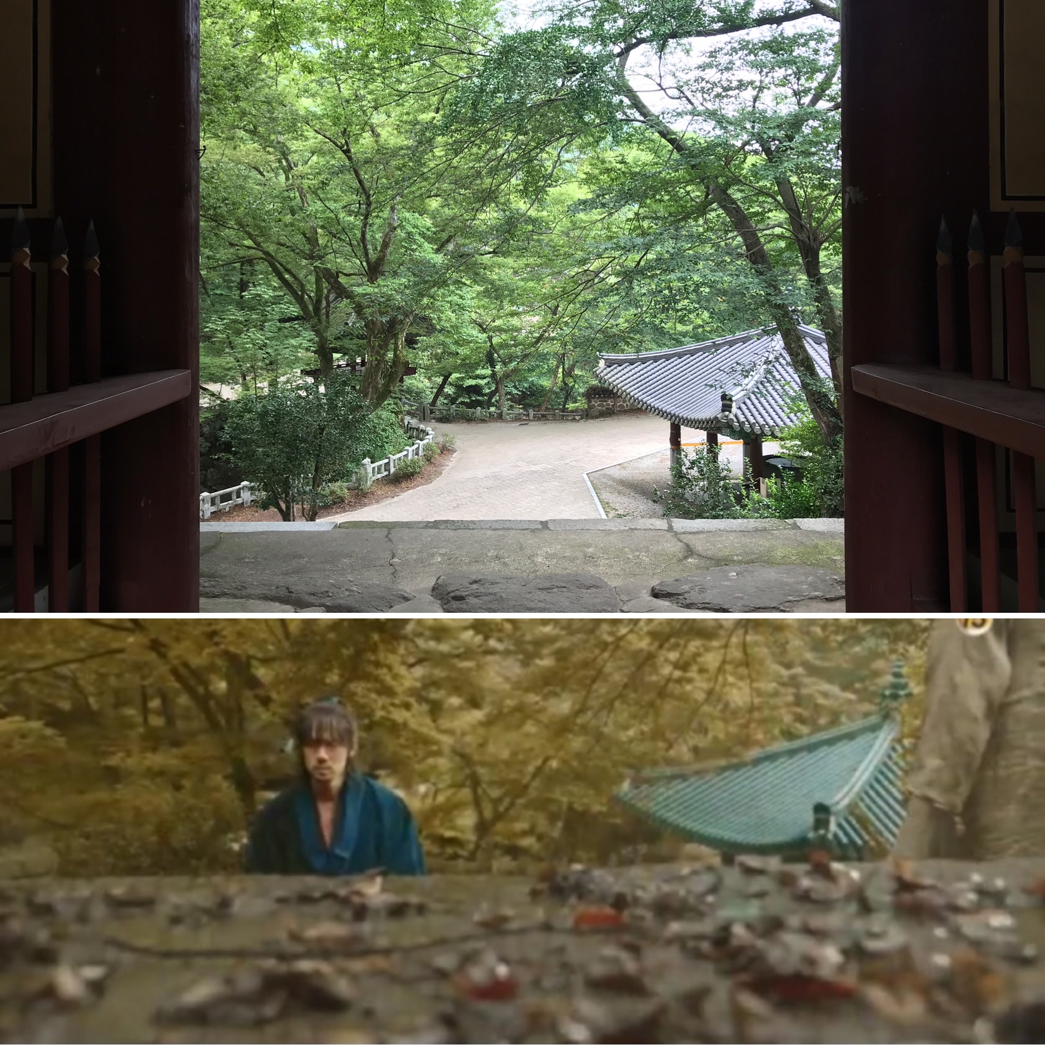 일주문을 지나면 곧바로 예쁜 무지개다리와 수홍루가 보여요. 천은사의 아름다움은 드라마 <미스터 션샤인> 에서, 애신이 수홍루에서 희성을 응원하는 장면, 구동매가 극락보전에서 애신 부모에게 애절하게 고백하는 장면을 통해 소개되기도 했죠.