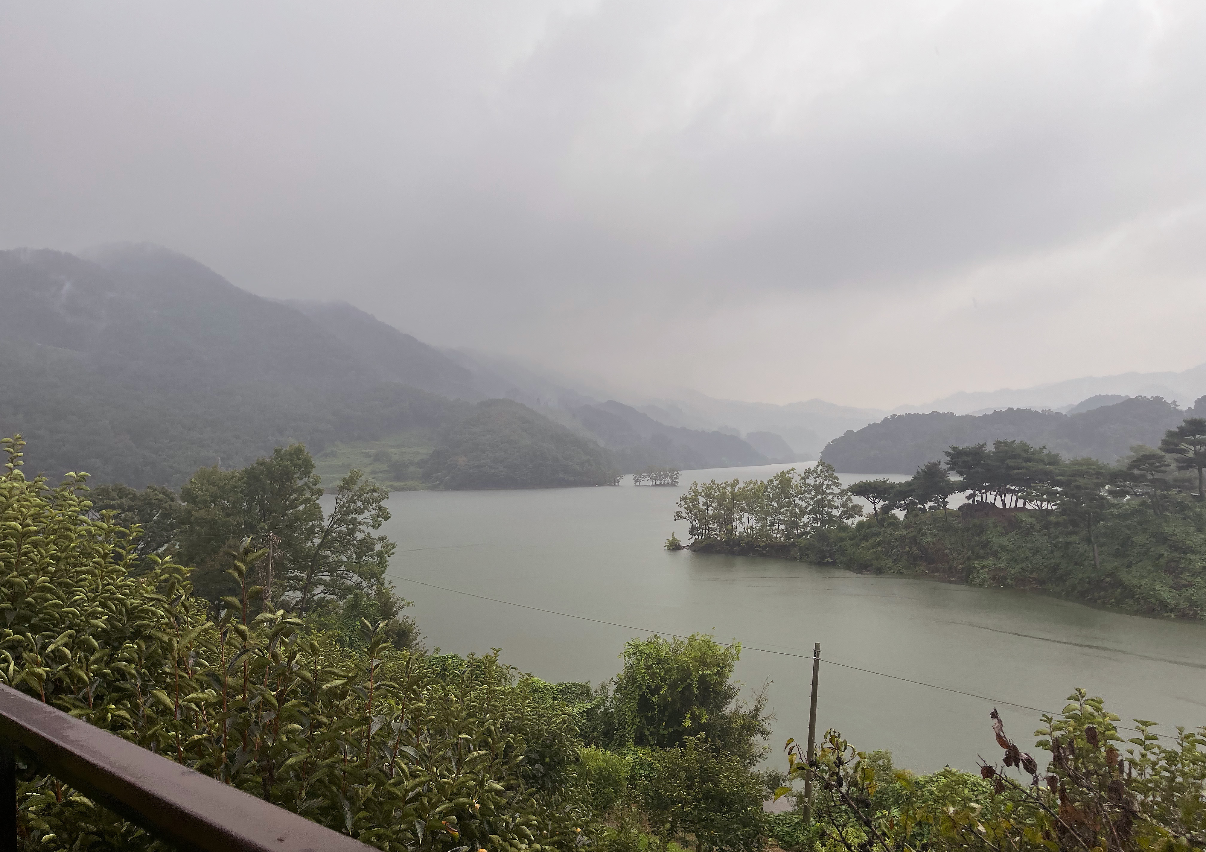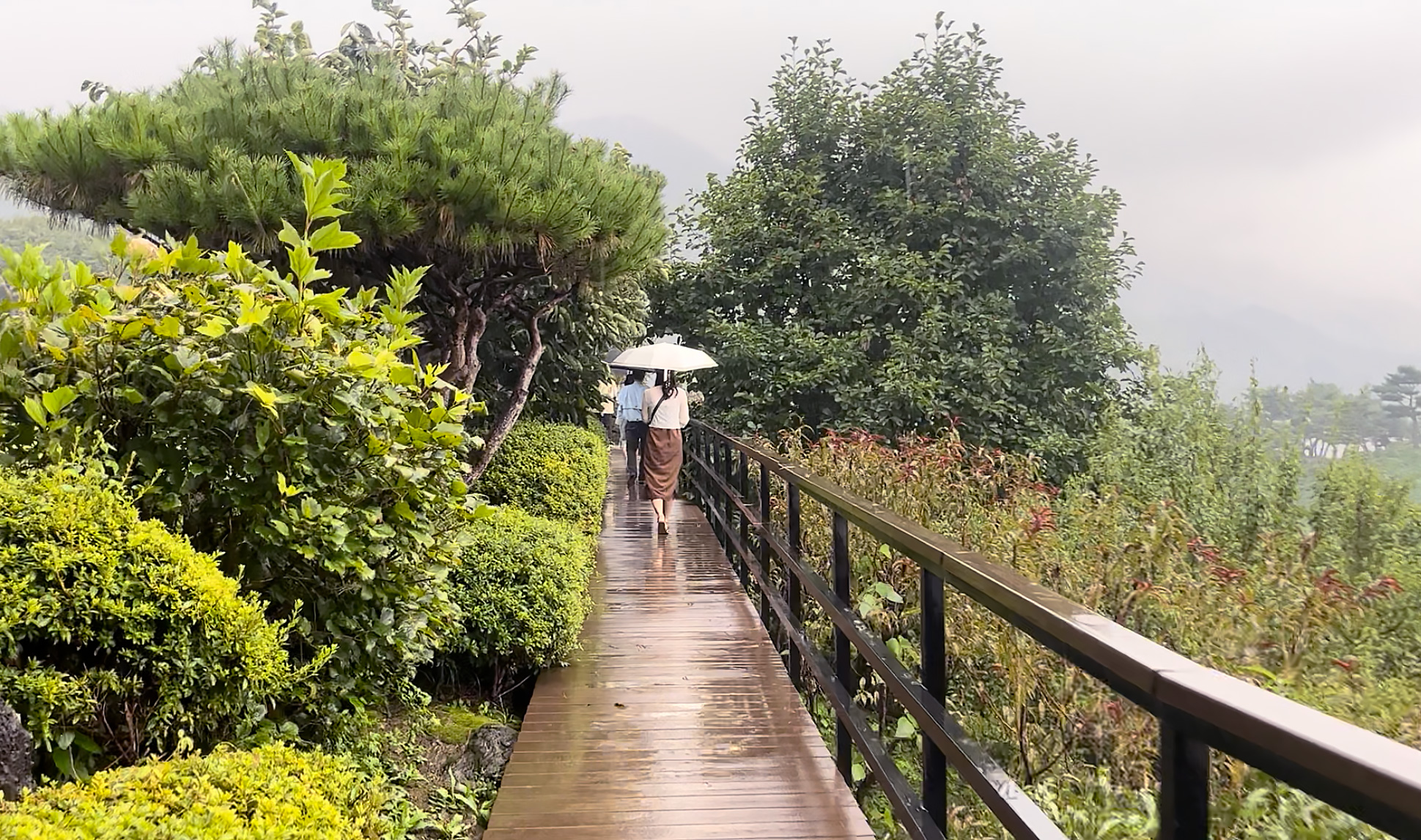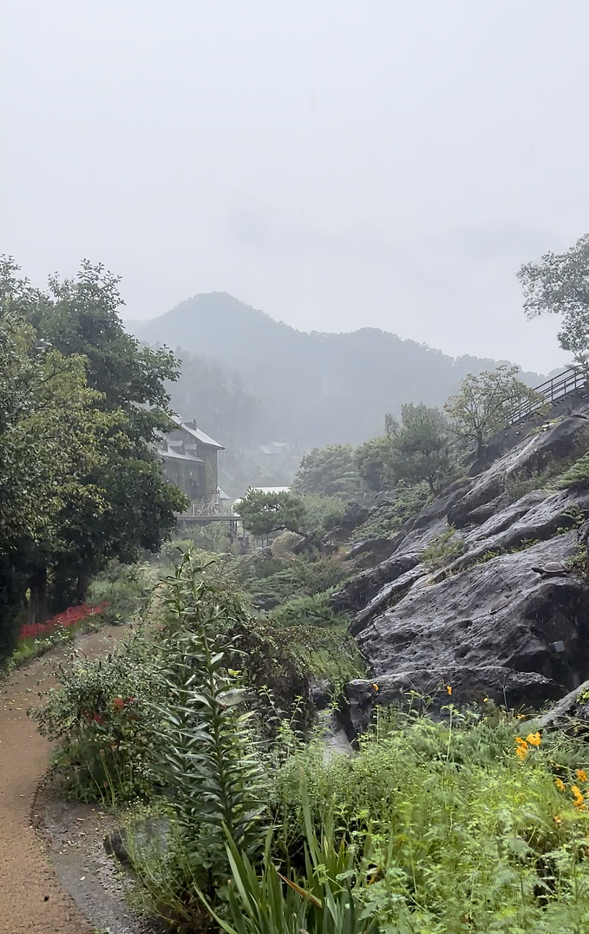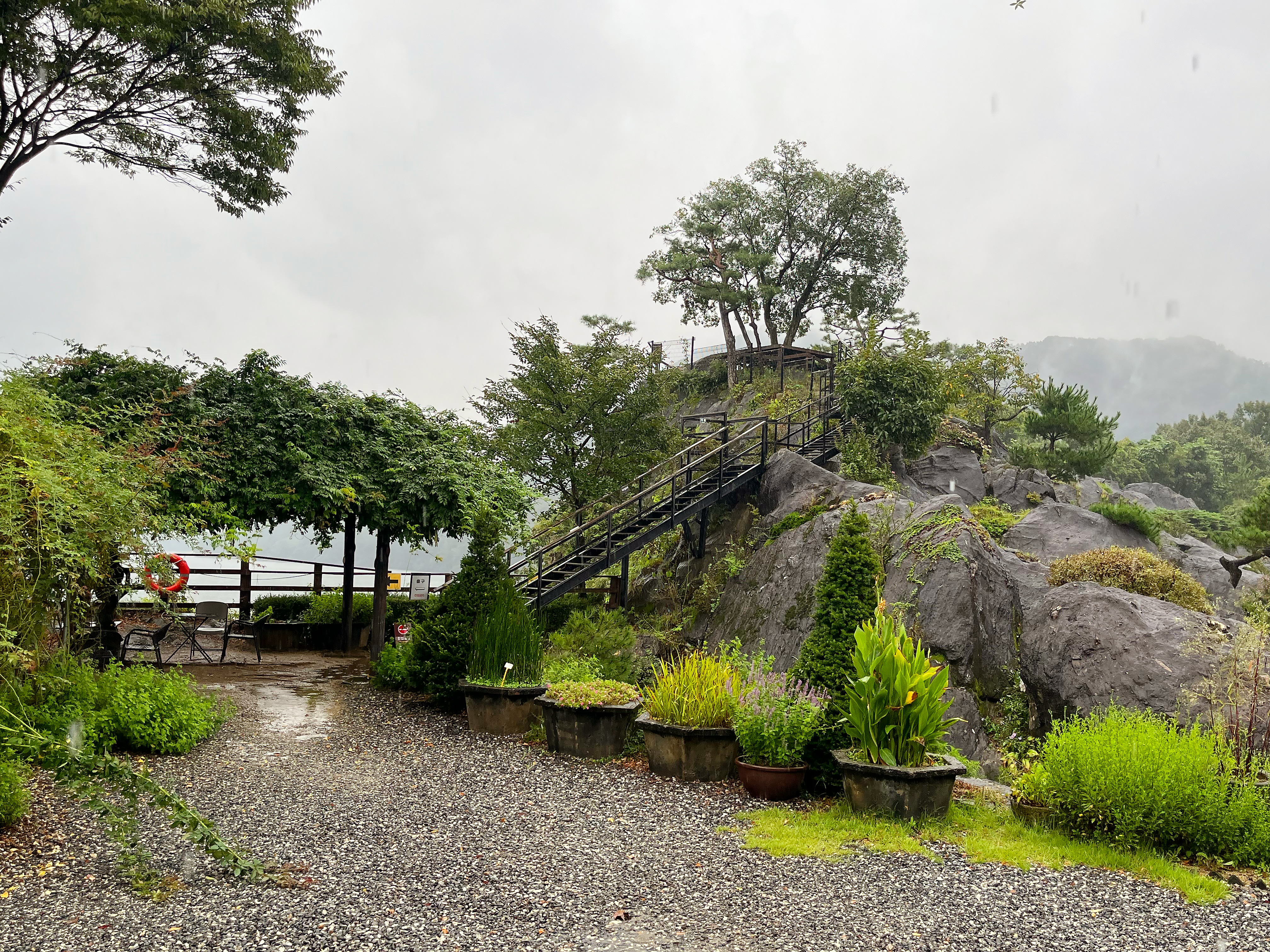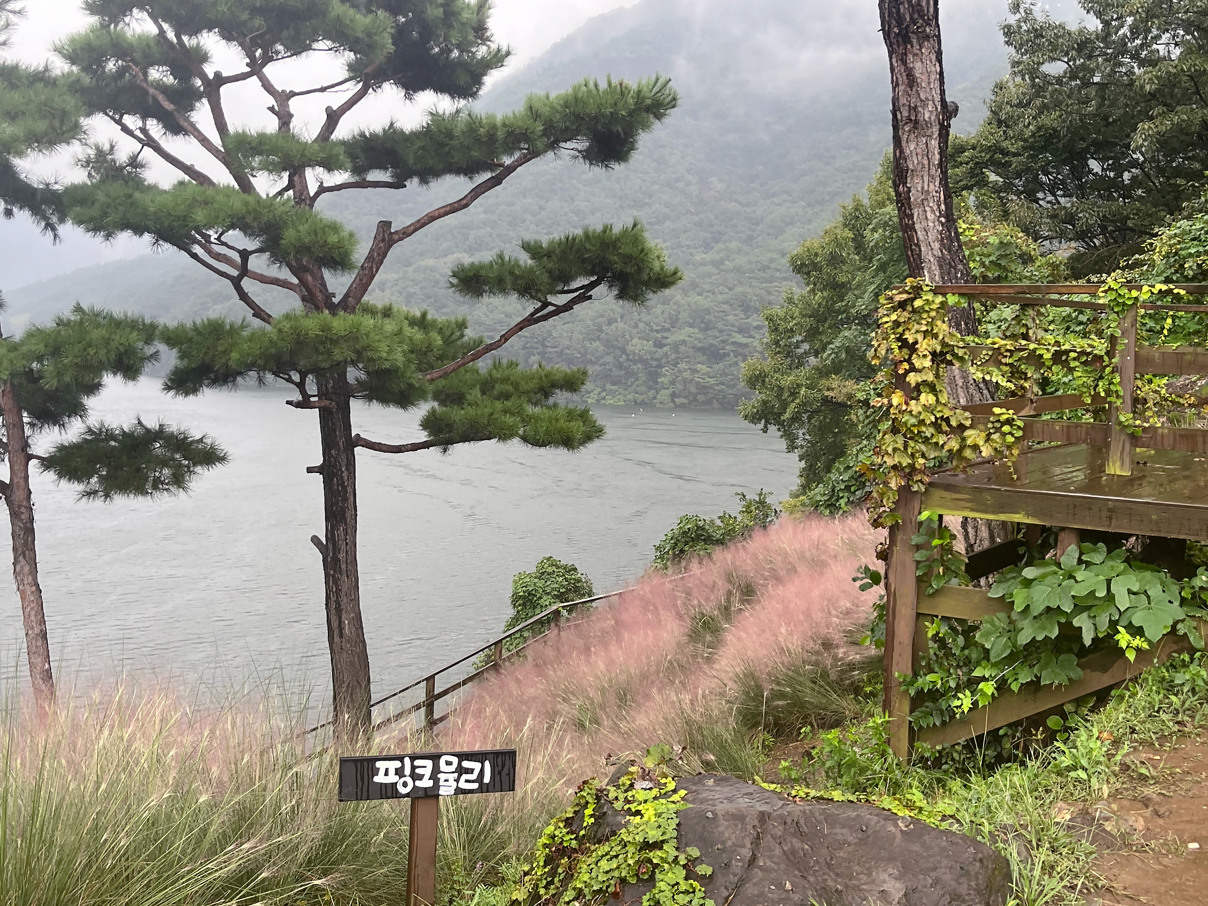 대청호를 품은 천상의 정원, 옥천 수생식물학습원은 사전 예약을 통해 이용이 가능합니다. 산책길을 따라 굽이굽이 휘돌아 내려오는 대청호의 물줄기와 능선을 볼 수 있습니다. 비가 오는 날 방문하여 낮게 내려앉은 안개가 아쉬웠는데요. 날이 화창한 날 방문한다면 짙은 녹음과 가을에는 단풍으로 절경을 관람할 수 있을 것 같습니다. 산책로를 따라 여러 종류의 과일나무와 야생화, 분재와 희귀식물들이 둘레에 자라고 있어 주변을 둘러보는 재미가 상당해 특히 부모님과 함께 방문하신다면 더욱 좋은 시간을 보내실 수 있을 것 같습니다.