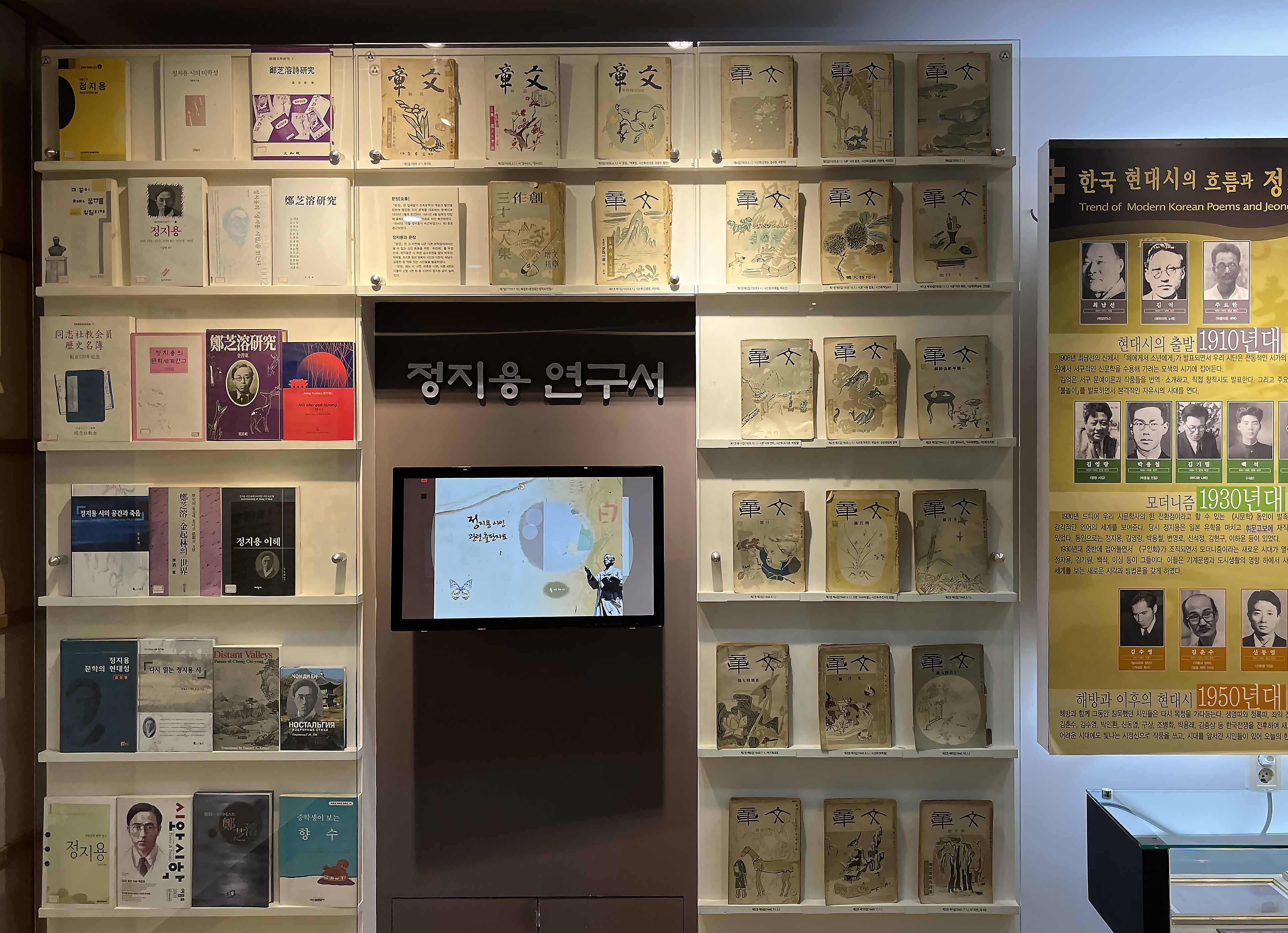 생가 옆으로는 작은 소공원과 정지용 문학관이 함께 있습니다. 역시 무료 관람이 가능해 부담 없이 가볍게 둘러볼 수 있지요. 한국 현대시의 흐름과 정지용 시인, 연보와 문학 지도, 산문집 초간본 등 정지용 시인의 문학세계와 발자취에 대한 것들이 잘 구분되어 있어 홀로 둘러보아도 어렵지 않게 관람이 가능하답니다.