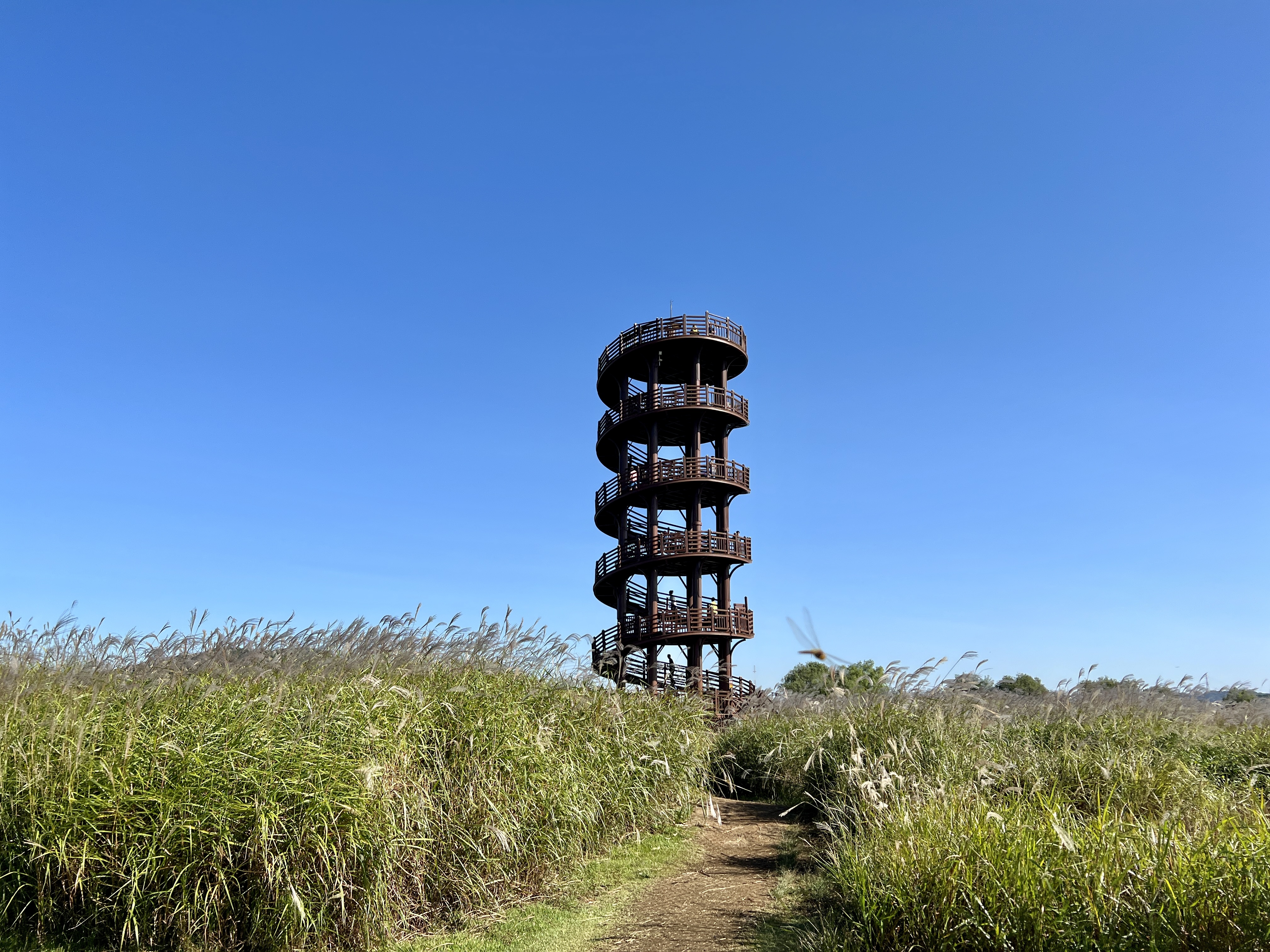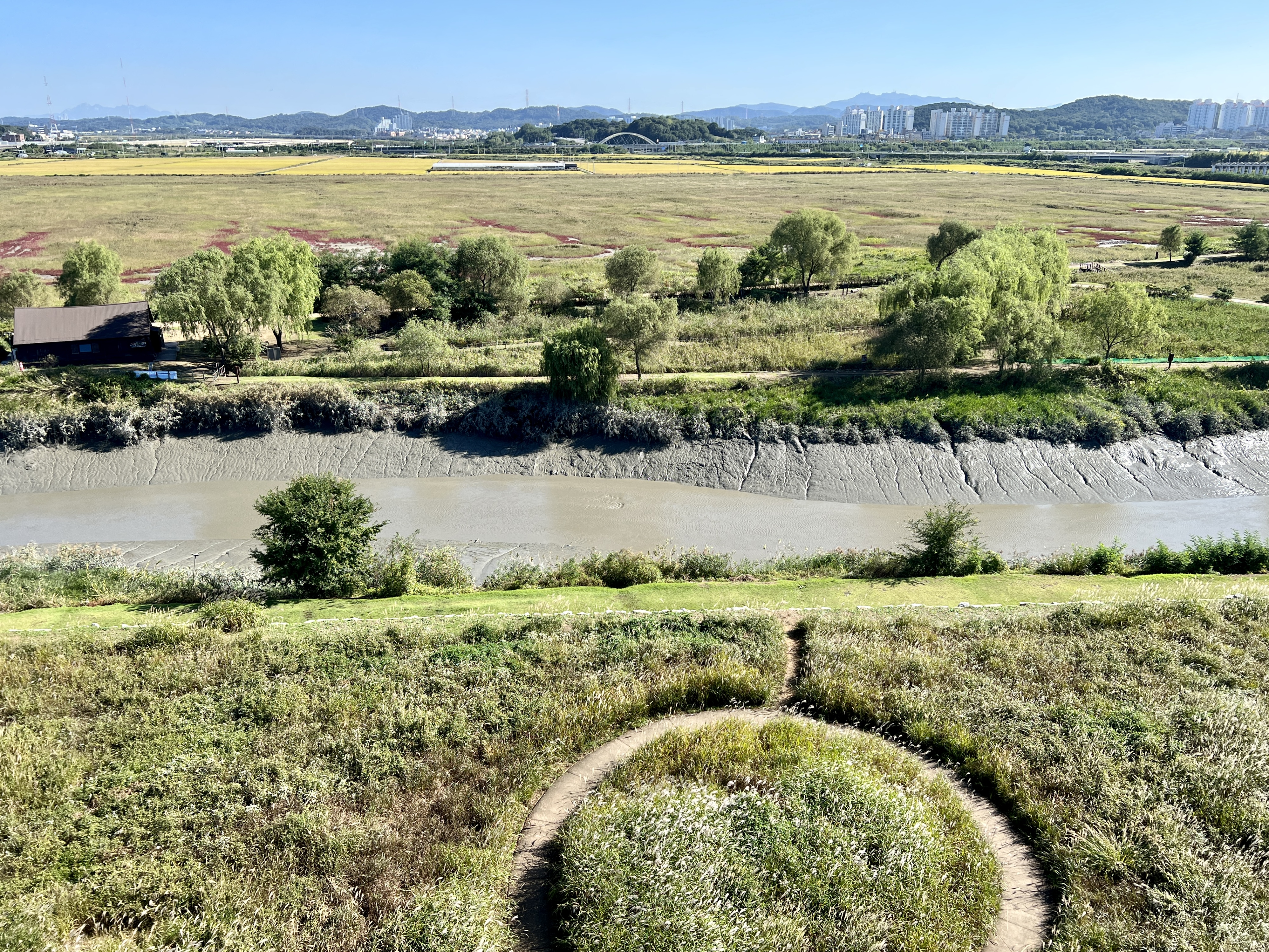 갯골생태공원의 랜드마크인 흔들전망대는 염전체험장을 지나 잔디밭 끝에 있어요. 6층 높이의 목조 원형 전망대로 이곳에 오르는 동안 공원 주변의 시흥갯골이 점차 또렷하게 윤곽을 드러냅니다.
