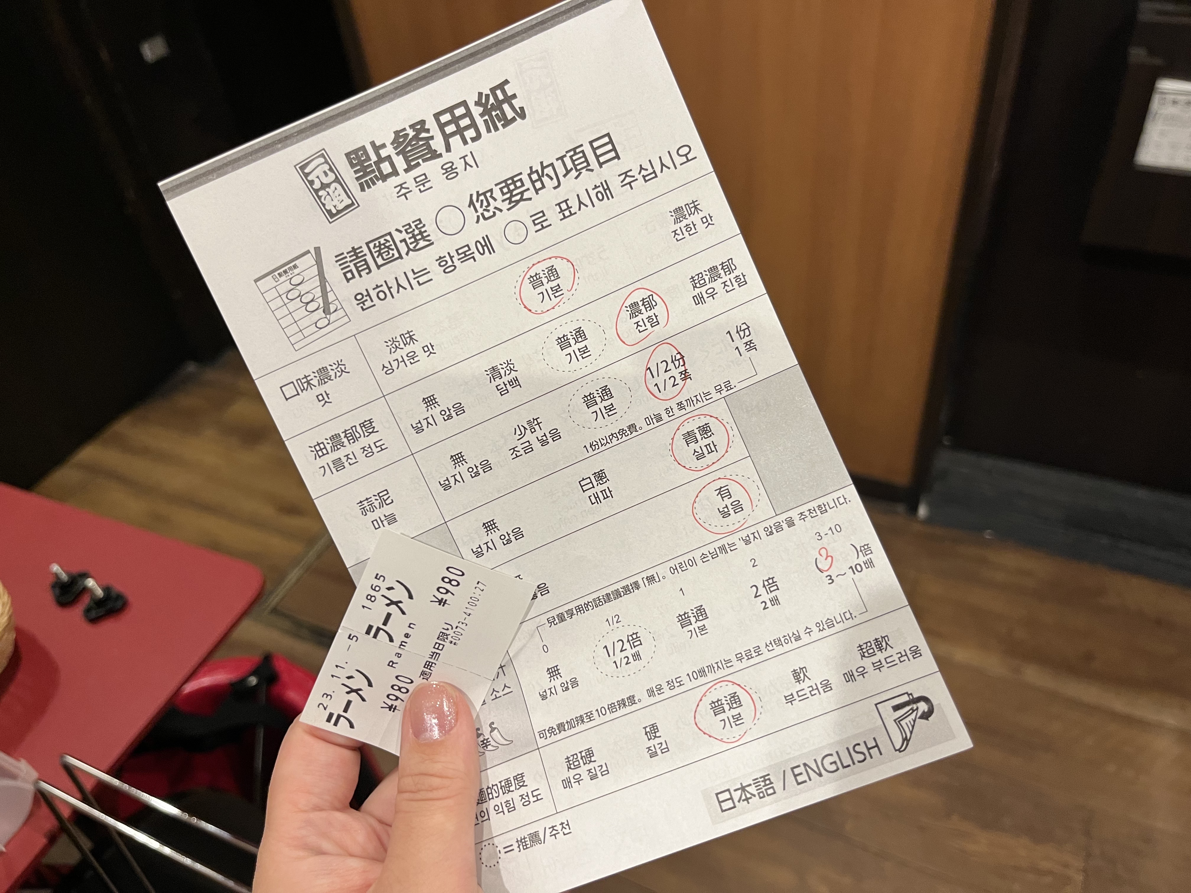 혼밥 하기에 가장 좋은 1인석으로만 구성되어 있고, 주문 및 음식 서빙까지 직원과 마주할 일이 없다는 점이 가장 편한 요소 중 하나인 것 같아요. 국물의 진하기와 매운 정도, 마늘 후레이크와 파의 양을 하나하나 결정할 수 있어 본인만의 시그니처 라멘을 주문할 수 있다는 것이 최고 매력적인 부분이었습니다. 저는 한국인의 매콤한 입맛에 맞춘 레시피로 주문했습니다. 저의 레시피를 함께 공유해 드릴게요!