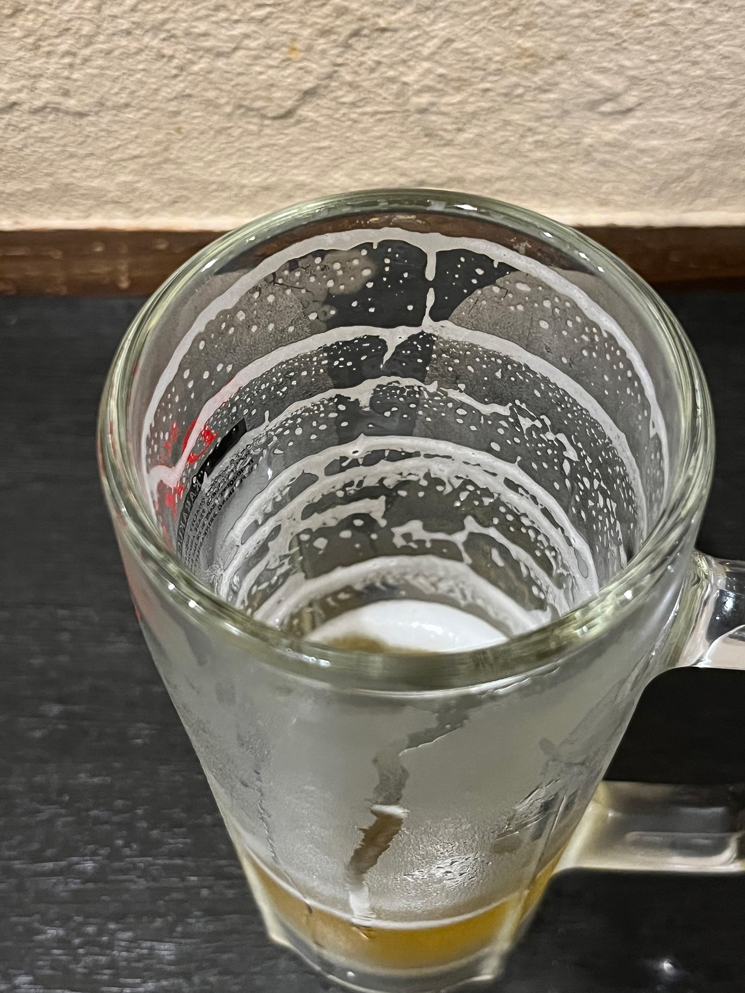 하지만 이마카츠의 진면목은 사실 숨어 있습니다. 바로 슈퍼 드라이 생맥주인데요. 이날 마신 맥주는 일본 여행에서는 물론 여태 먹어 본 맥주 중 1등을 줘도 부족하지 않을 만큼 맛이 좋았습니다. 포장을 기다리며 가게에서 맥주를 마시고 나왔는데요. 풍부한 거품이 만들어내는 엔젤링이 보이시나요? 맥주의 쓴맛 하나 없이 정말 시원하고 맛있는 생맥주를 즐길 수 있었습니다. 아쉽게도 맥주는 포장이 되지 않기 때문에 포장을 하시더라도 꼭 맥주는 맛보시는 걸 추천드립니다.