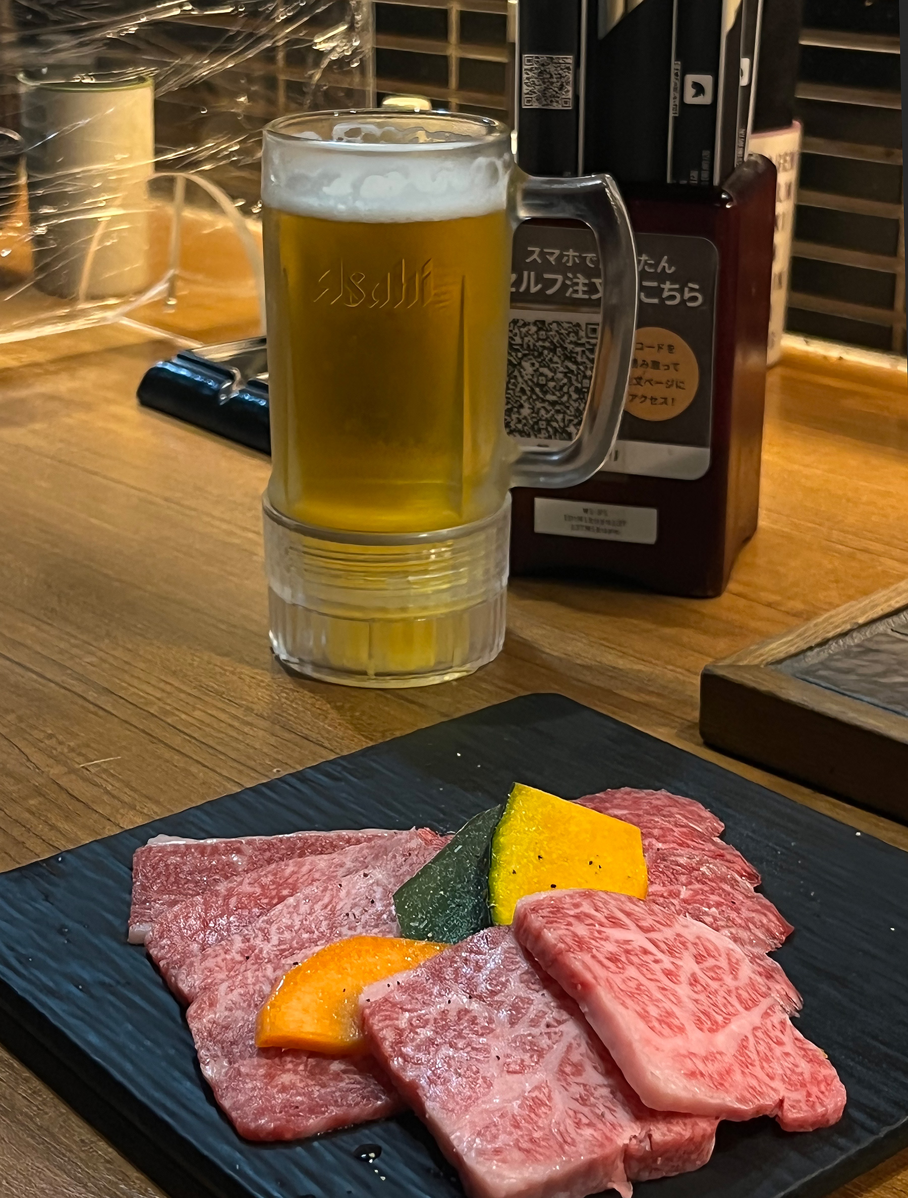 처음에는 냉동이 아닌 추천 와규들을 한 접시로 모아 가져다주시고요. 그다음부터는 큐알코드를 통해 먹고 싶은 부위들을 골라서 자유롭게 주문할 수 있습니다. 고기 외에 해산물이나 콘버터, 마늘과 같은 메뉴들도 있어 함께 주문이 가능한데요, 역시 고기에는 주류가 빠지면 섭섭하겠죠, 1,700엔에 맥주 무제한인 노미호다이가 있어 2잔 이상 맥주를 마실 예정이라면 노미호다이로 주문해 보세요.
