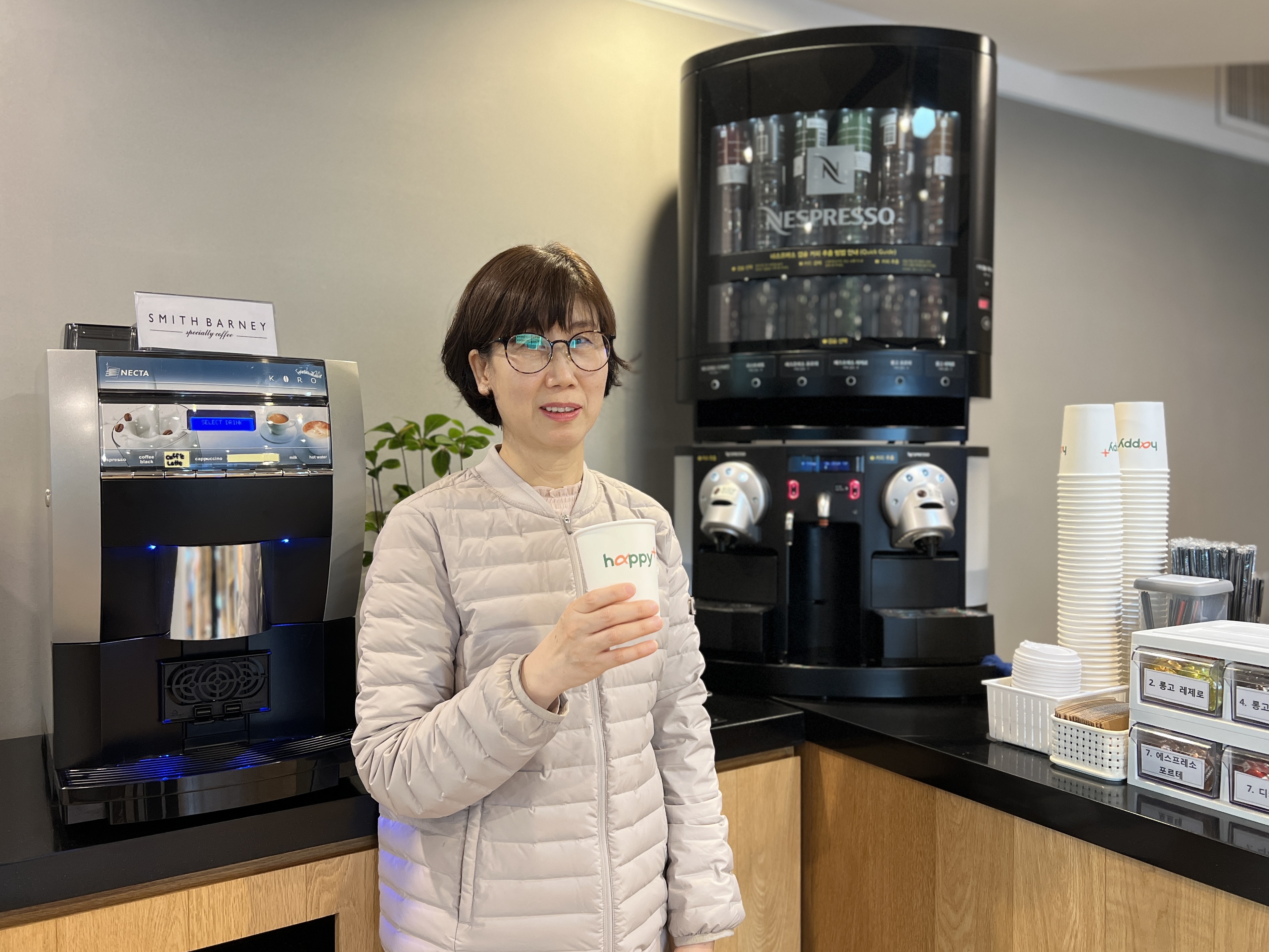 “유레카의 색조가 주황색인데 주황은 평화를 상징하는 색이에요. 유레카의 평화로운 분위기가 좋습니다. 각 부서나 임직원이 기부하는 양서들이 비치되어 있고 안마의자도 있어서 직원들이 안락한 휴식 시간을 보내곤 합니다. 커피값이 1천원인데 네스프레소, 스미스바니(Smith Barney)와 탐앤탐스 원두를 사용하는 커피머신이 있어 직원들이 애용하고 있어요.” 특히 출근 시간이나 점심 시간, 비 오거나 궂은 날에는 직원들의 발걸음이 몰리기도 한다. “유레카는 생각을 많이 할 수 있는 공간이에요. 좋은 환경을 마련해 준 회사에 고마운 마음입니다.”
