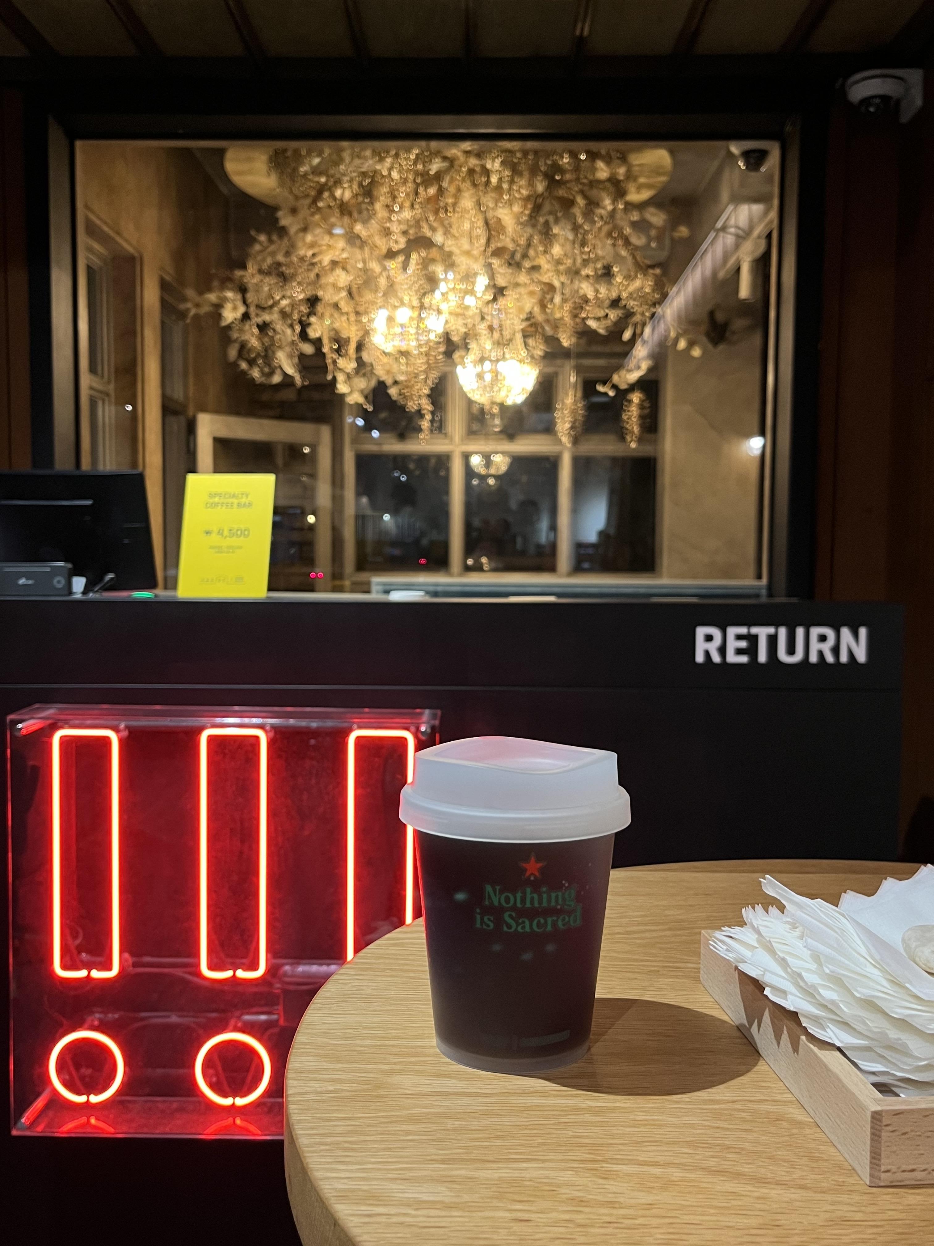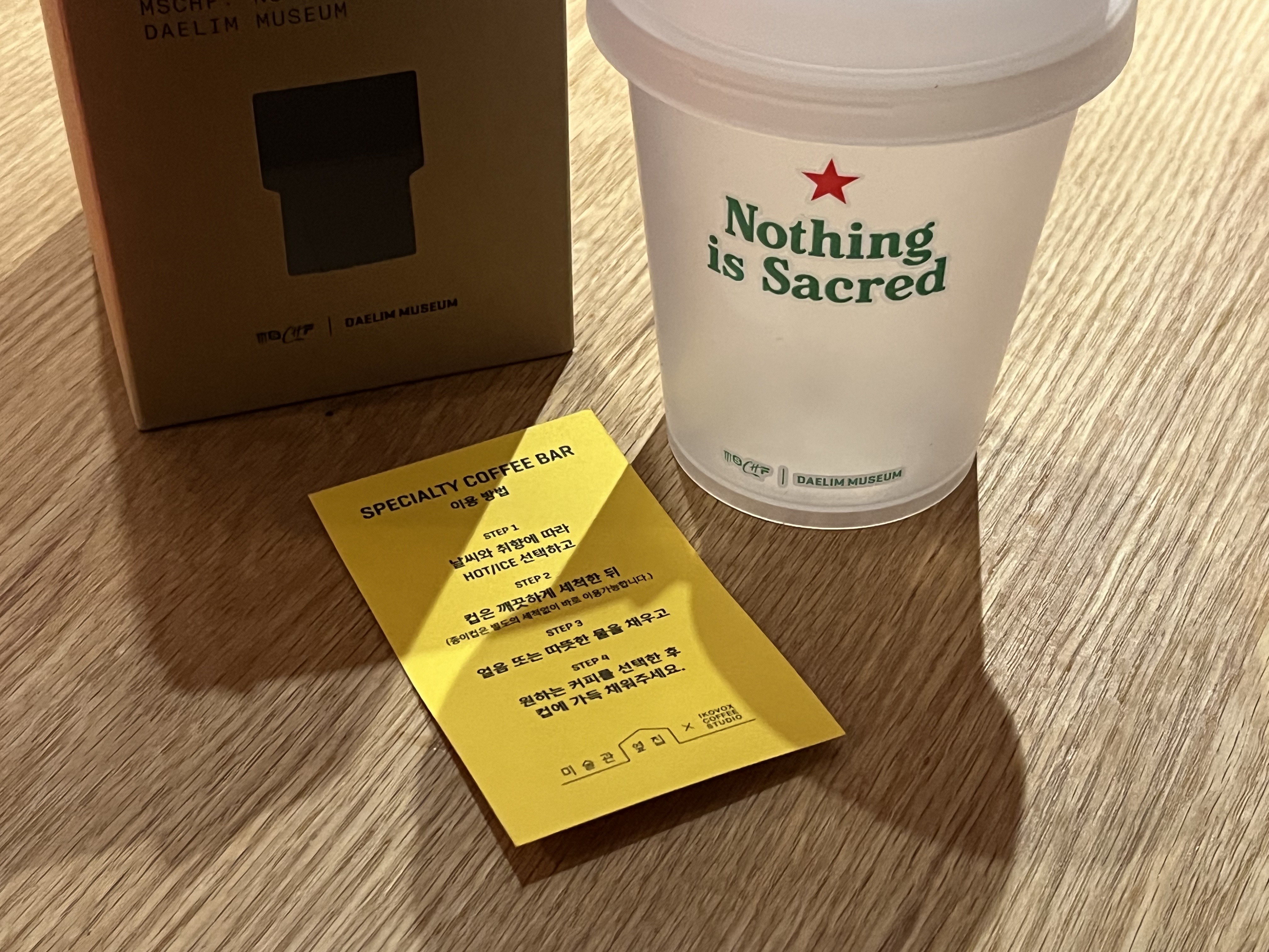 전시의 시작에 앞서 받았던 리유저블 컵과 쿠폰으로 전시장 출구 바로 옆의 카페, [미술관 옆집]에서 커피 한 잔을 마셨는데요. 30% 할인된 1만 원 초반대의 티켓 가격에 리유저블 컵과 커피 한 잔이 포함되어 있어 가격적인 매력도도 놓치지 않는 전시였습니다.