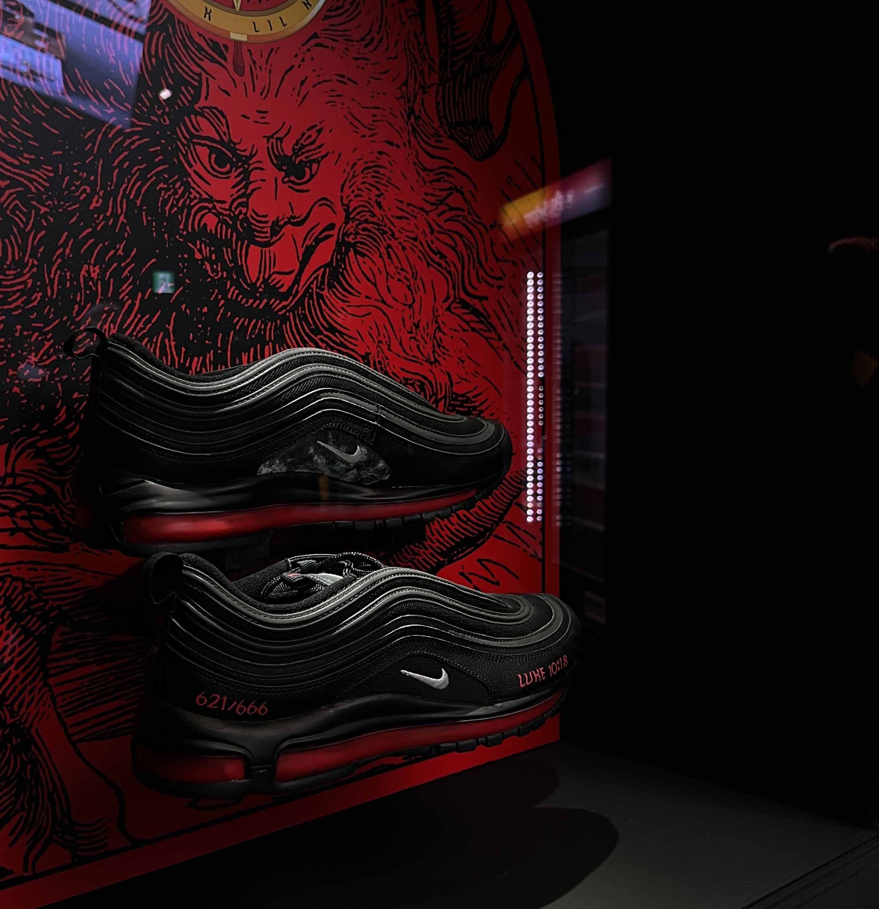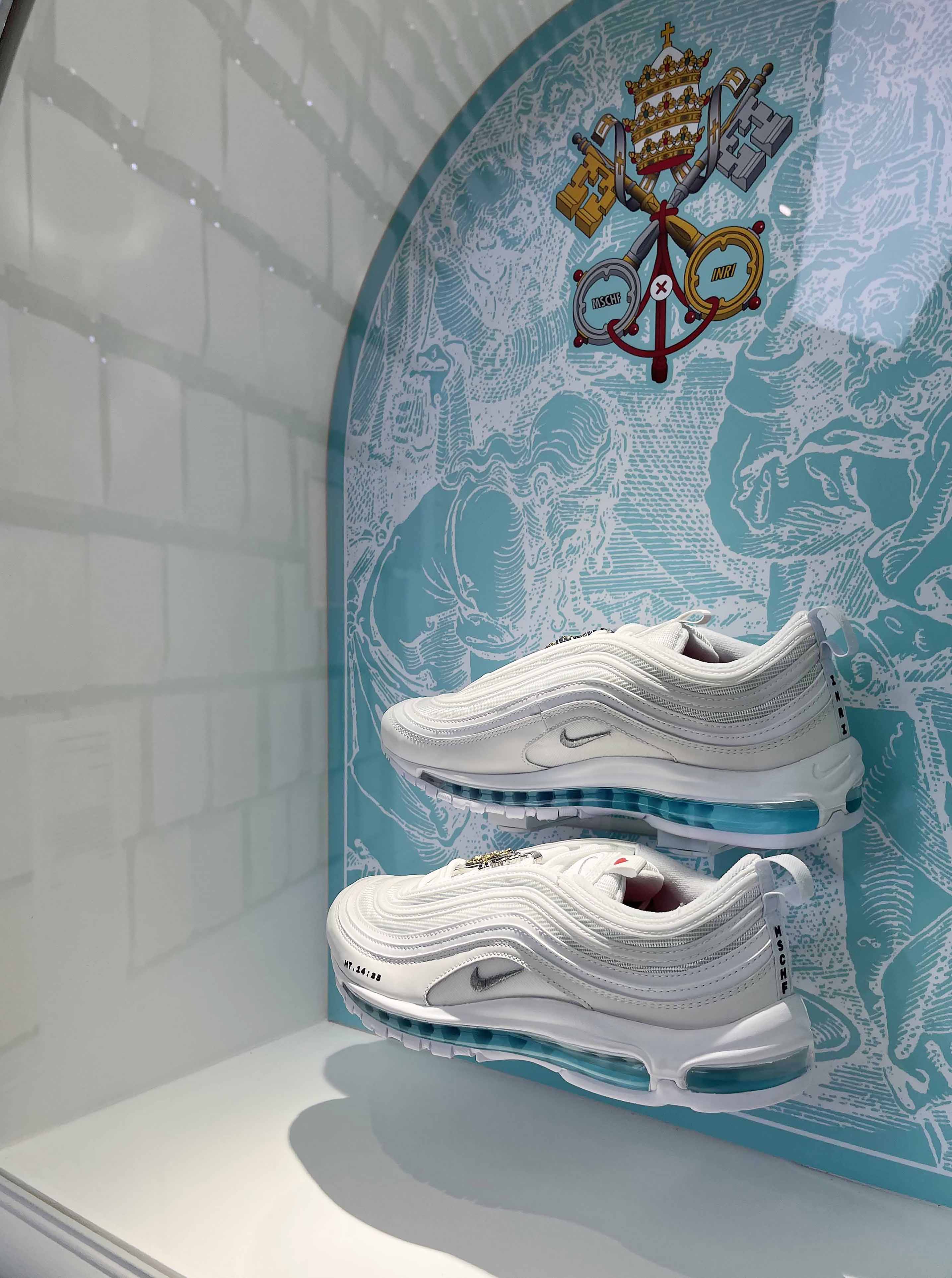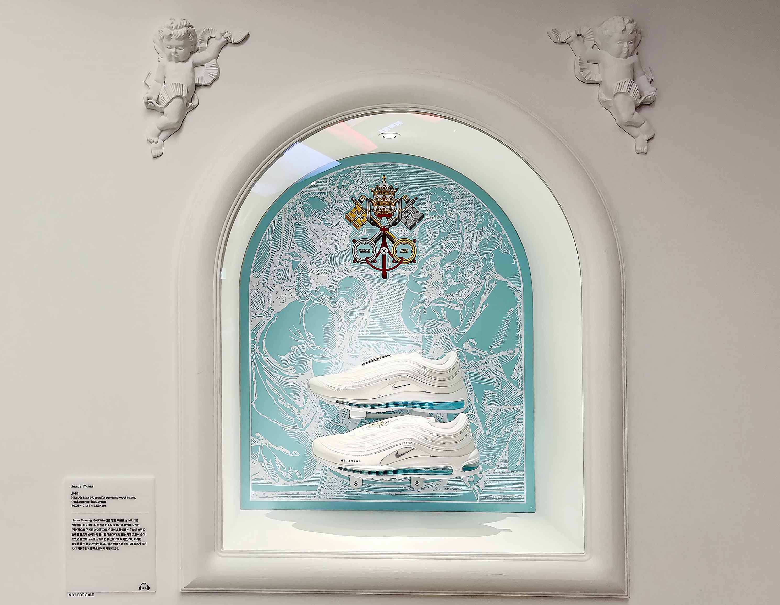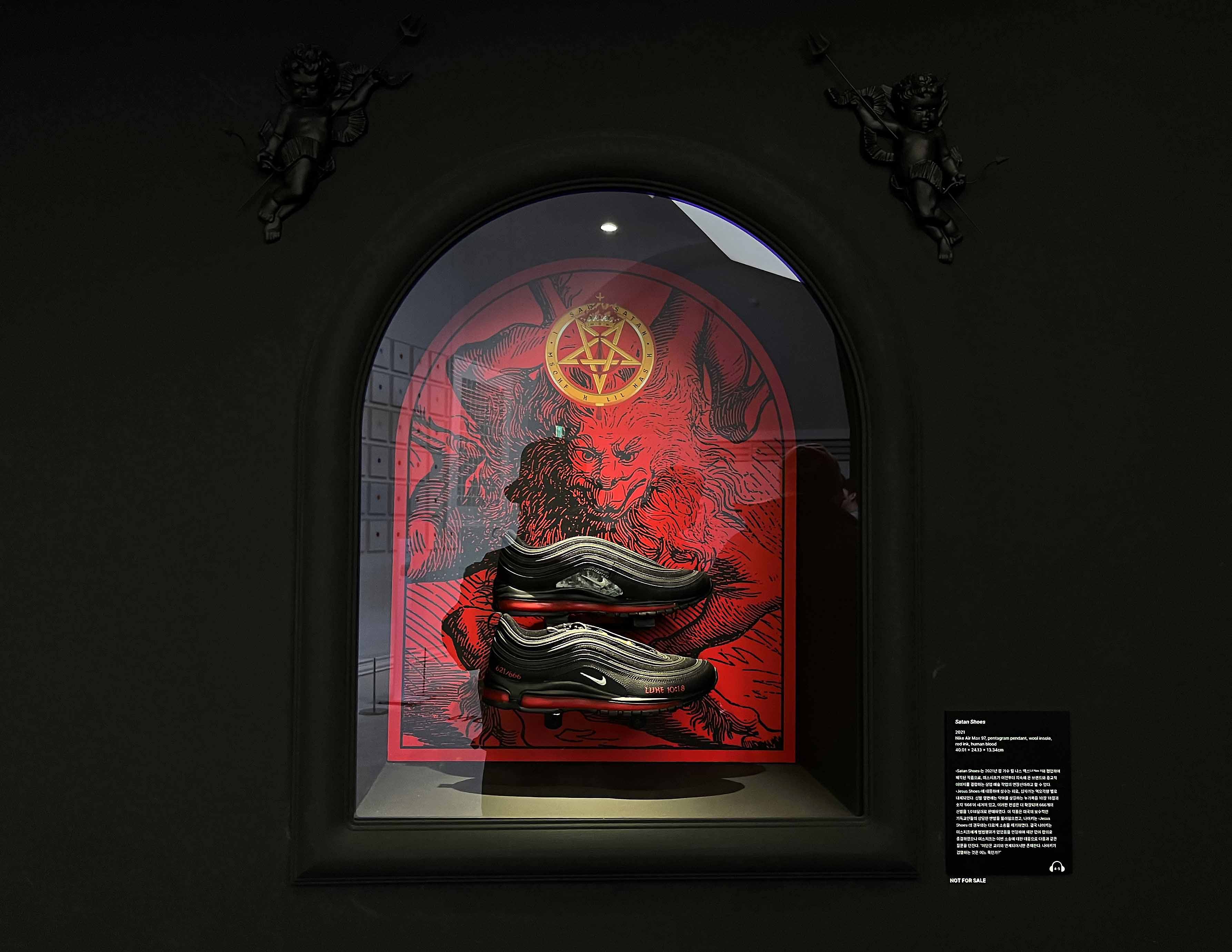 나이키 에어맥스 97 커스텀을 나이키와의 콜라보 없이 독단적으로 발매를 하였는데요. 무분별적인 콜라보를 비웃듯 미스치프는 세계관 최강자인 예수와 사탄과의 콜라보를 선보입니다. 축복받은 요르단 강의 성수를 담은 는 나이키와 가톨릭교회와의 콜라보레이션을 실현시킨 것이라고 표현했으며, 브랜드를 향한 숭배 현상을 종교에 대한 신앙과 결합해 셀럽과의 무분별한 콜라보를 비웃었습니다.