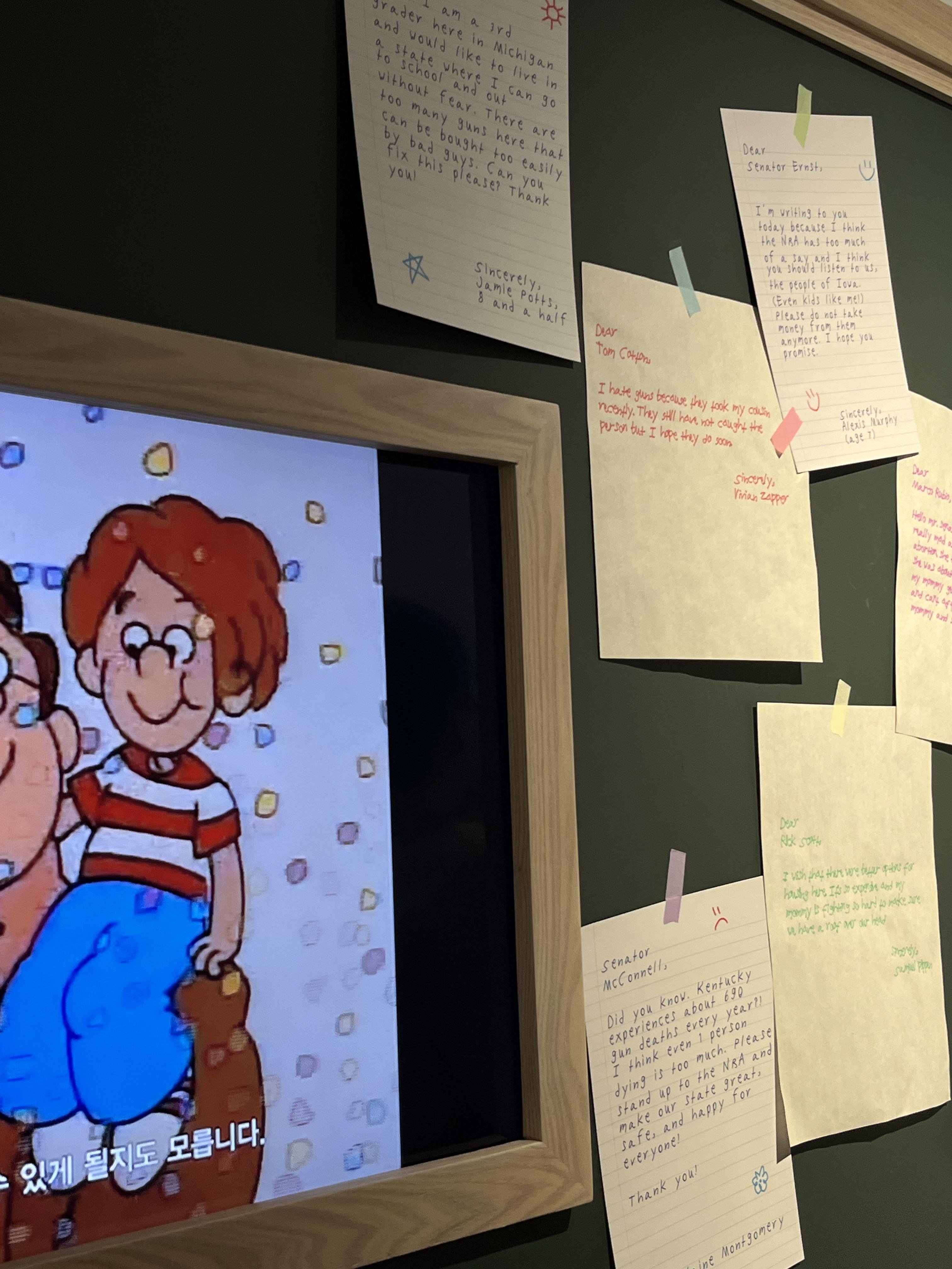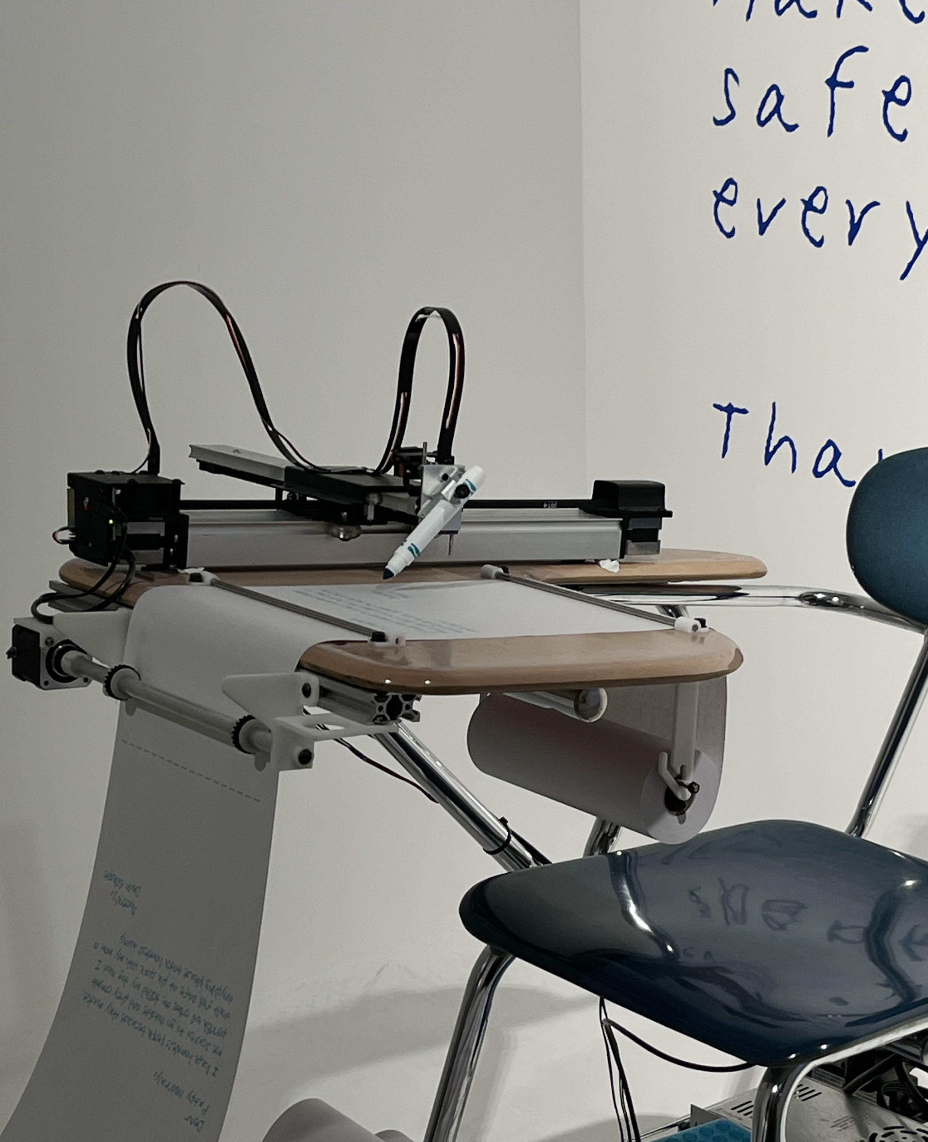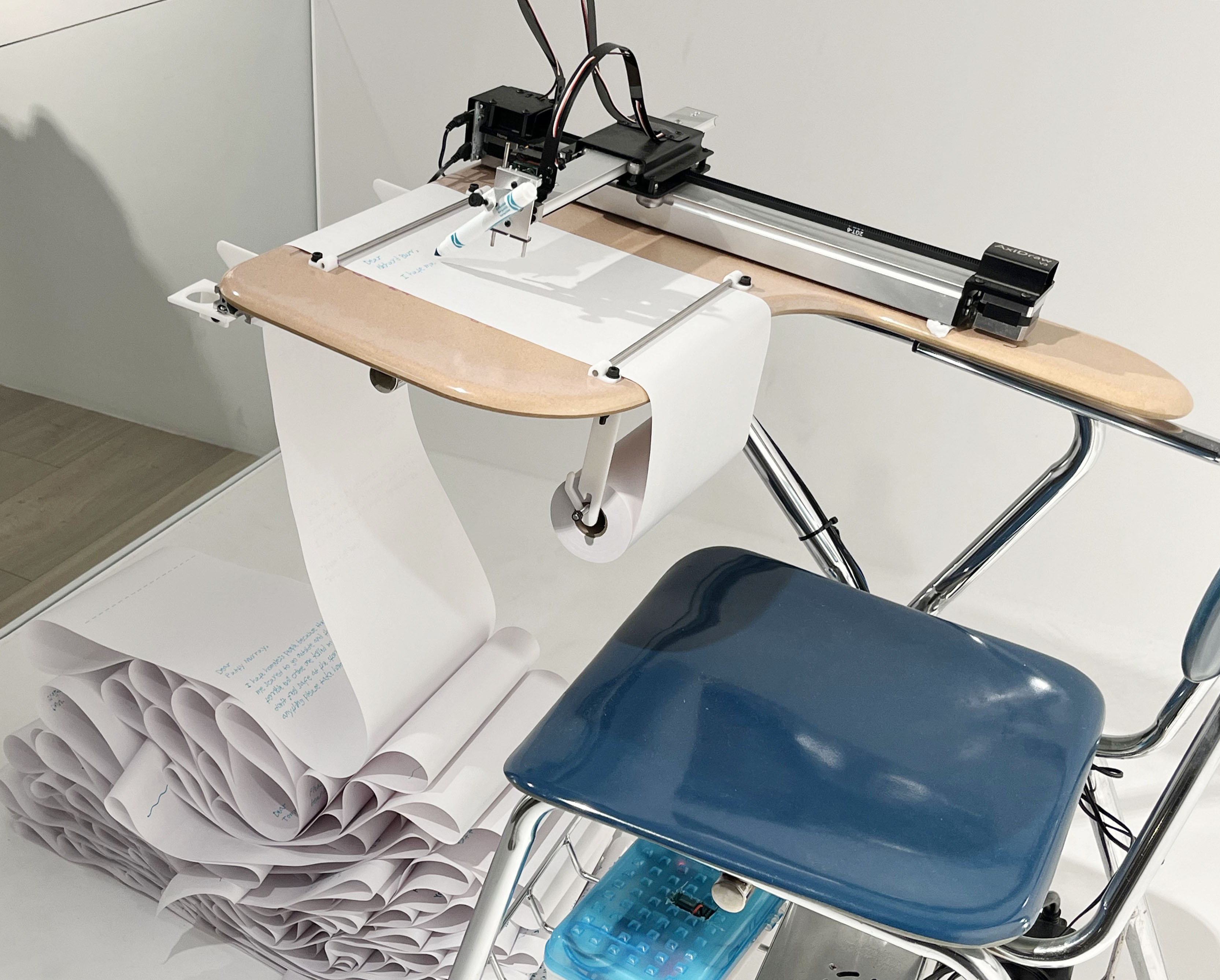 길게 편지를 쓰고 있는 이 로봇은 [Children’s Crusade] 작품입니다. 정부를 향한 불만을 보내는 메시지를 아이의 필체로 바꿔 보내는 로봇인데요. 이메일로 오는 건의는 쉽게 무시되지만, 아이들의 편지는 탁월한 SNS 홍보용 게시글이 될 수 있어 해결하려고 드는 정치인이 많다는 점을 우습게 비꼬는 것에서 발상이 시작되었다고 합니다.