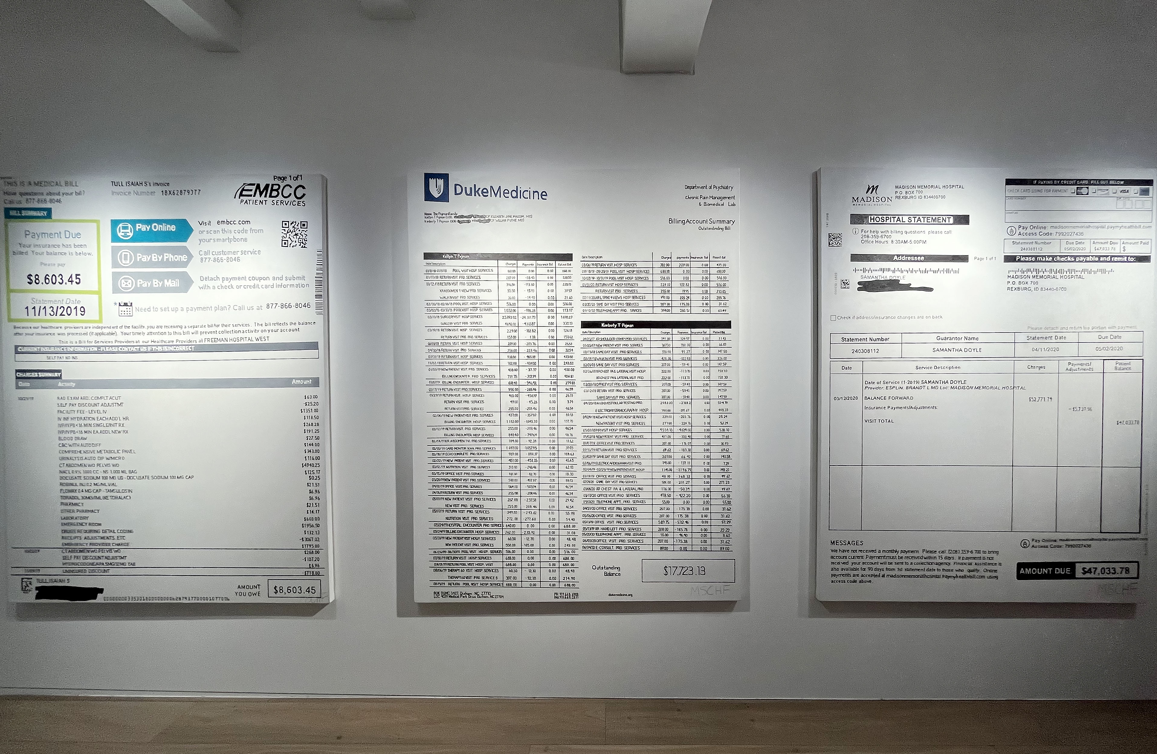 미스치프는 현대 사회의 불합리한 구조에 저항하는 의미의 프로젝트들도 상당히 정성껏 기획합니다. 미국에서 발생하는 의료 절차로 인한 막대한 의료비와 그로 발생하는 빚의 액수는 상상을 초월한다고 합니다. 미스치프는 빚을 상환하기 위해 이 청구서를 그림으로 그려 예술 시장에 판매했고, 이 작품은 실제 청구된 병원비의 비용과 동일한 비용으로 판매해 의료비를 상환했다고 하죠. [Medical Bill Art]이 바로 청구서를 그린 유화 그림인데요. 이 작업은 미국 의료 부채의 시스템적 문제에 대해 다시 한번 생각해 보게 합니다.
