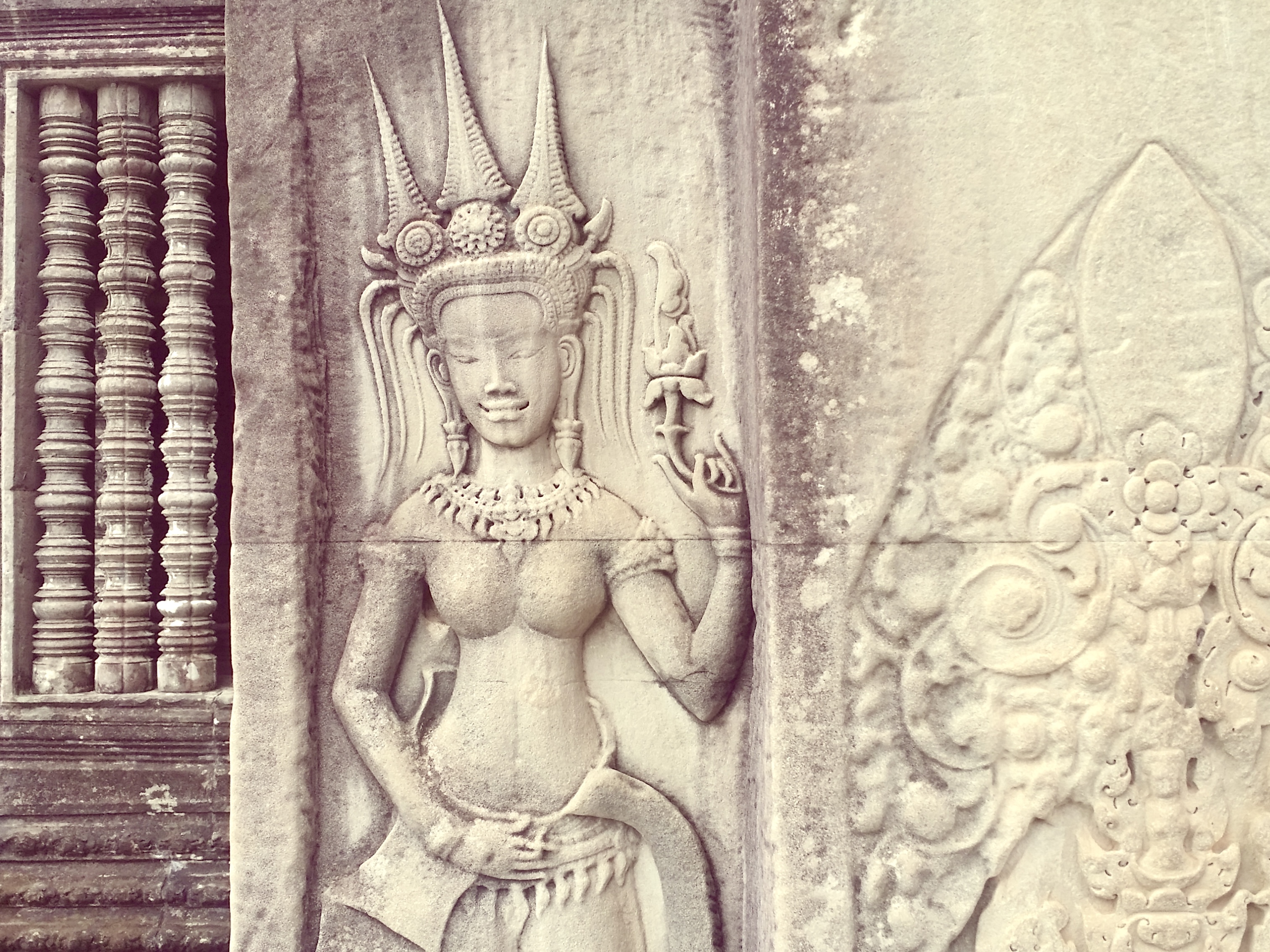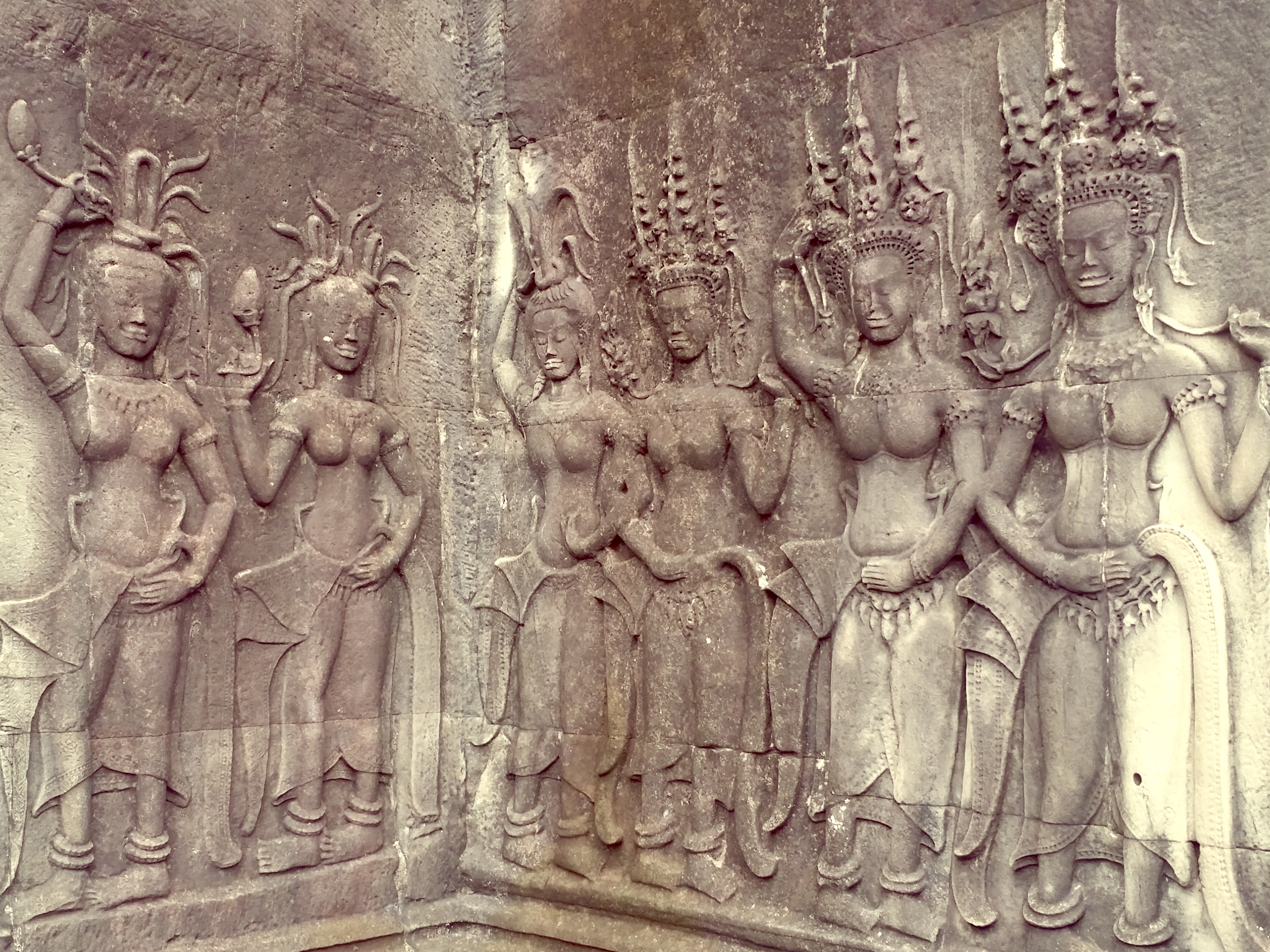 벽면에도 천상의 무희 압사라들이 꽉 채워져 있는데요. 이 모습은 크메르 여인의 현실적인 모습을 담고 있어요. 압사라 춤의 전승 속에 오늘날까지 그대로 보존되어 있죠.