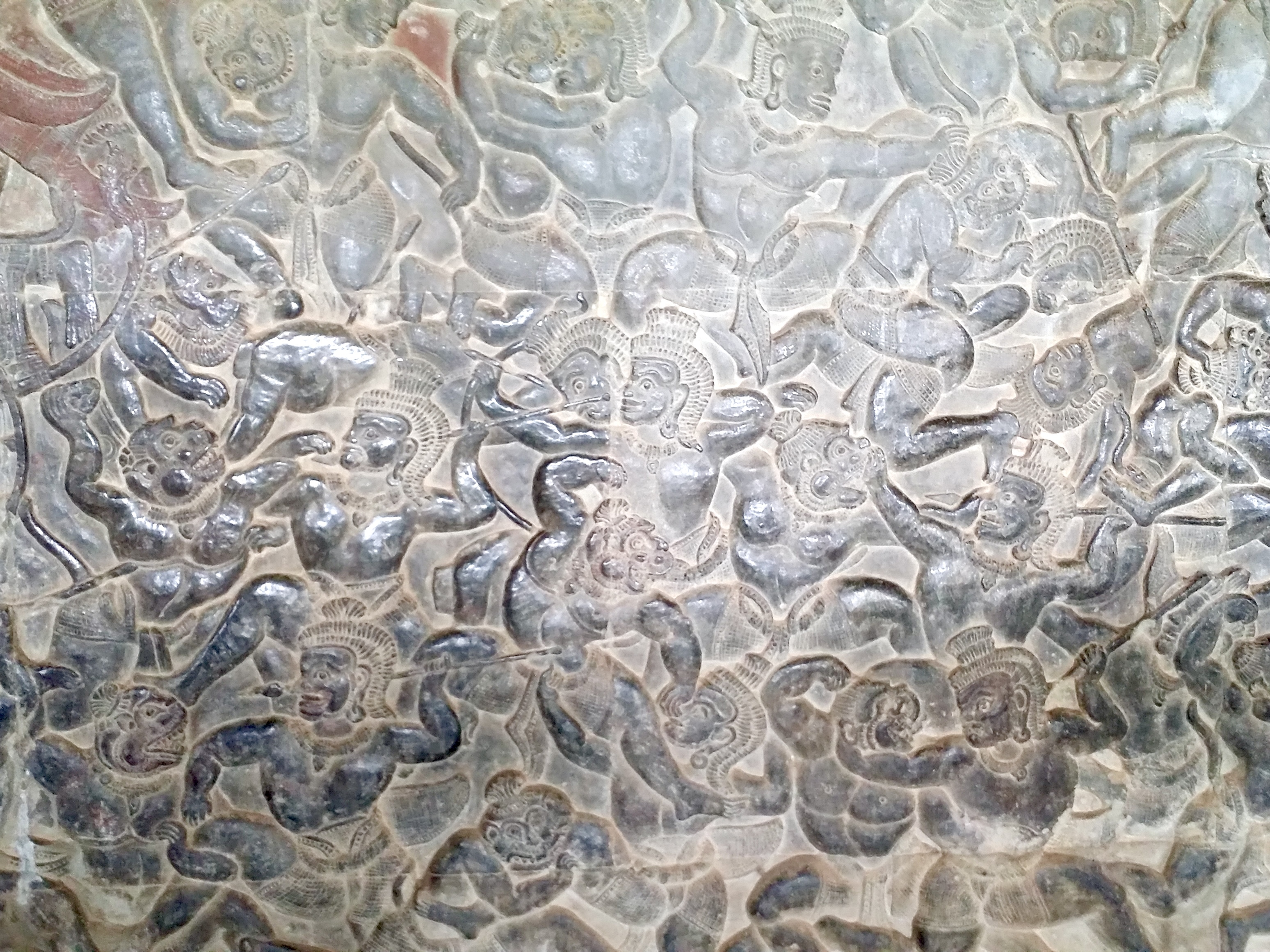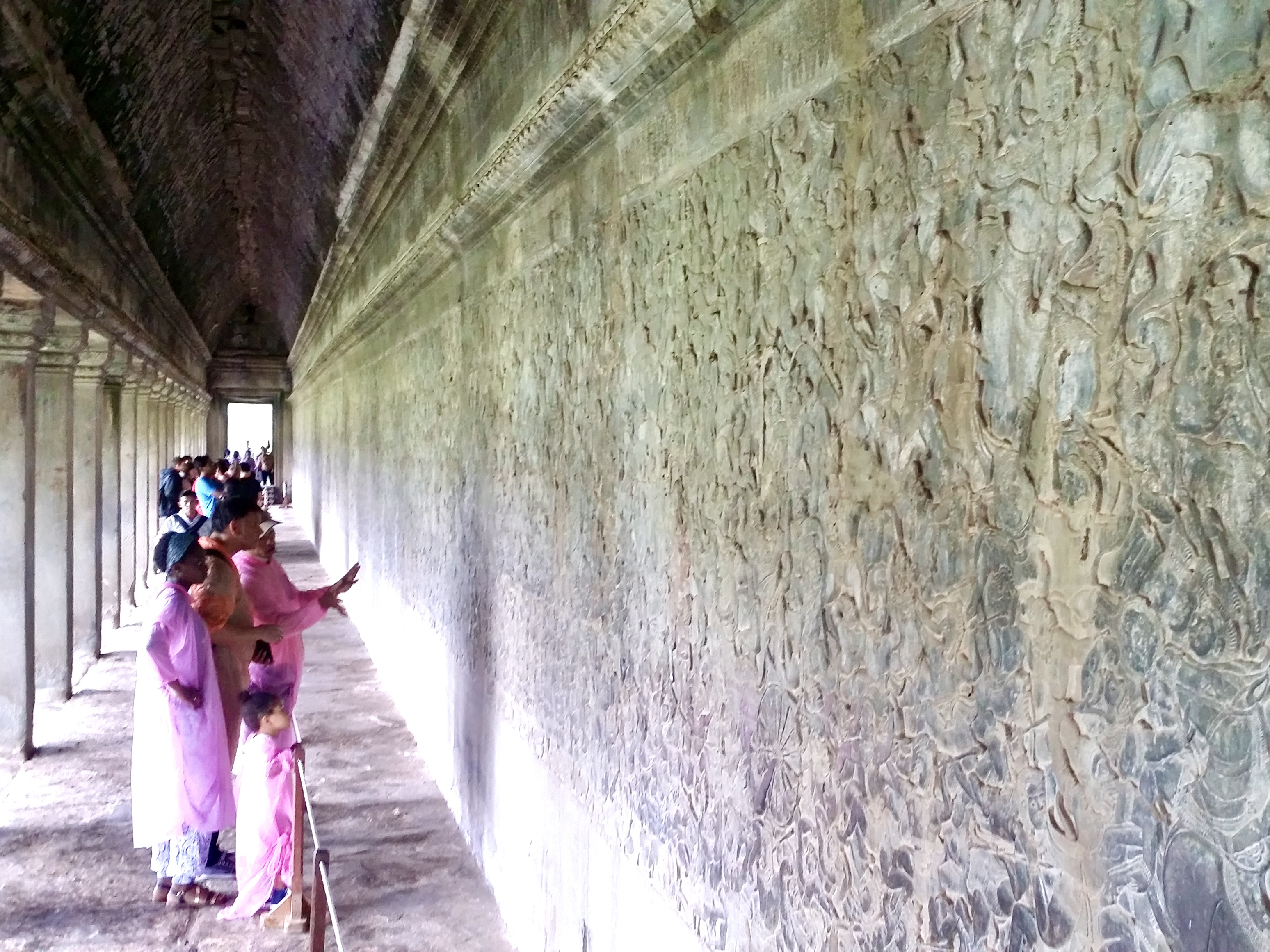 앙코르 와트는 수백 칸에 이르는 돌 회랑으로 둘러싸여 있어요. 크메르인들은 역사적 사실을 신화적 세계와 함께 회랑 벽면에 빼곡하게 새겨 놓았답니다.