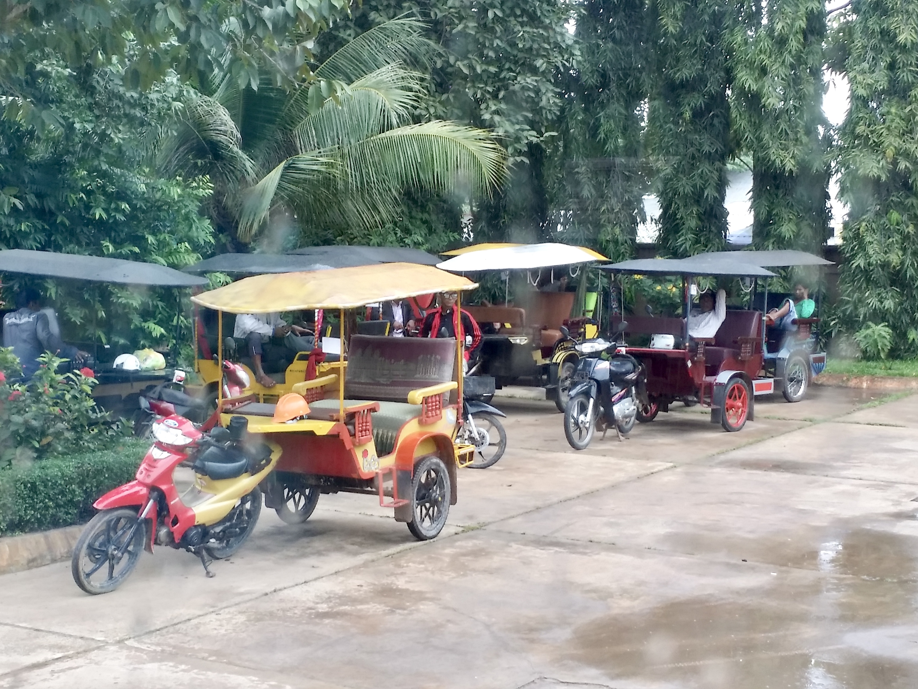 숙소 앞에는 일찍부터 캄보디아의 택시라고 할 수 있는 툭툭이(Tuk-Tuk)들이 대기하고 있습니다. 열대 밀림에 고운 비가 내리고 있었지만 앙코르 패스(Angkor Pass)를 준비해 앙코르 유적군을 둘러보기로 했어요.