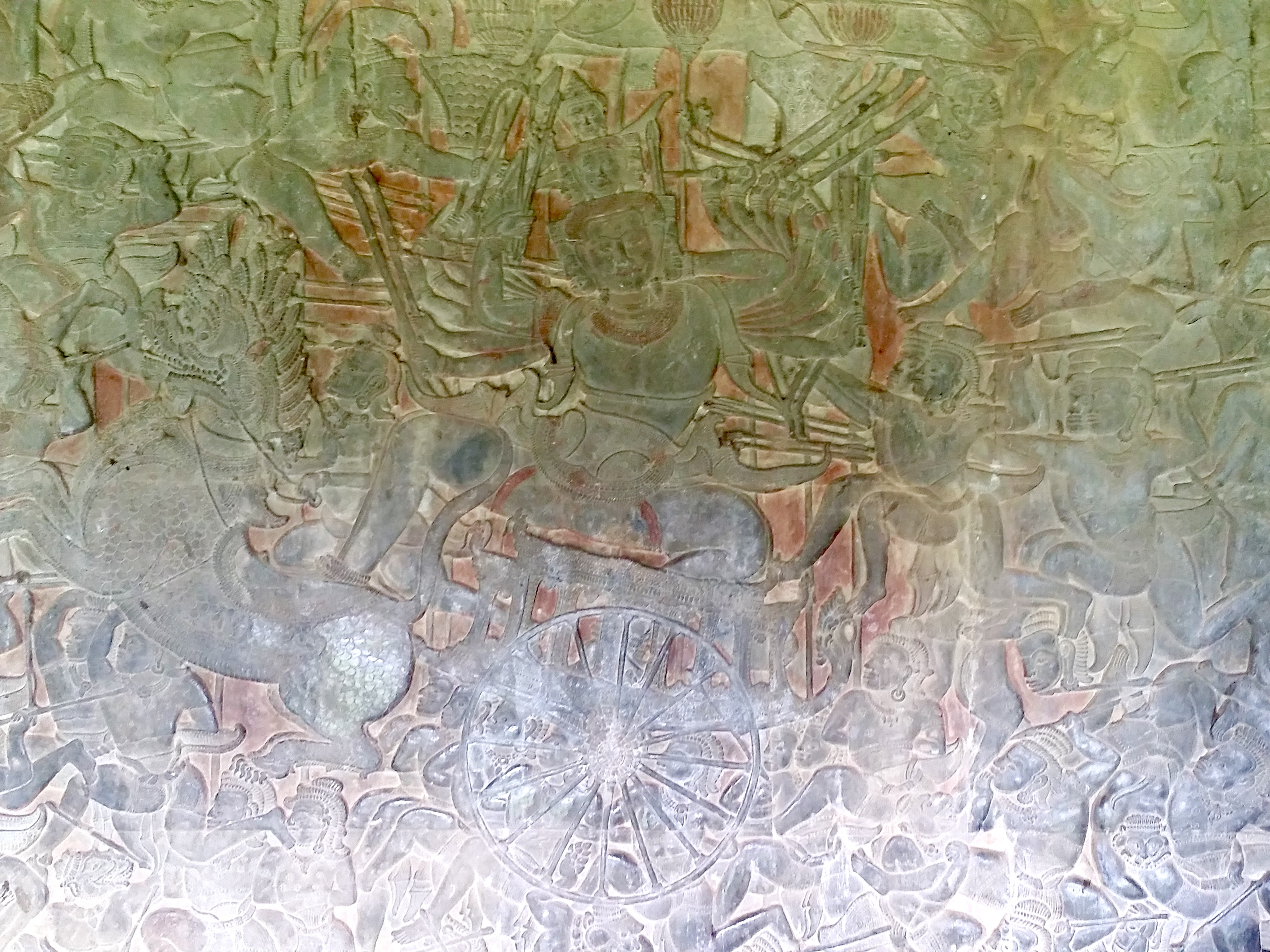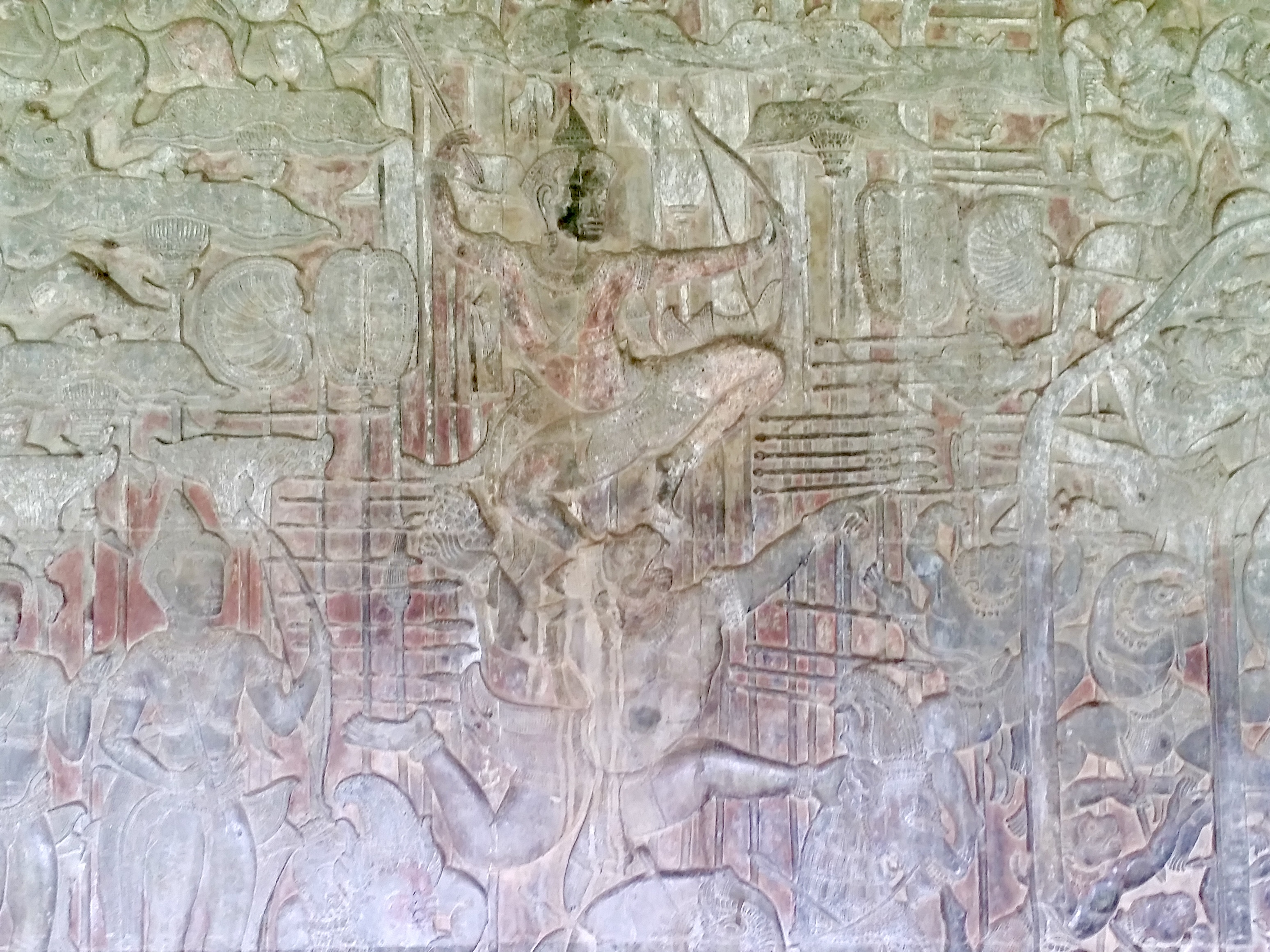 앙코르 와트에서 모든 것은 신들이 거주하는 천계로 변화되는 기능을 가지고 있어요. 왕도 신이며, 지상에서의 왕의 업적도 신화에 나오는 신들의 행적과 동일한 차원의 이야기로 승화되면서 신성과 영원성을 획득하게 되죠.