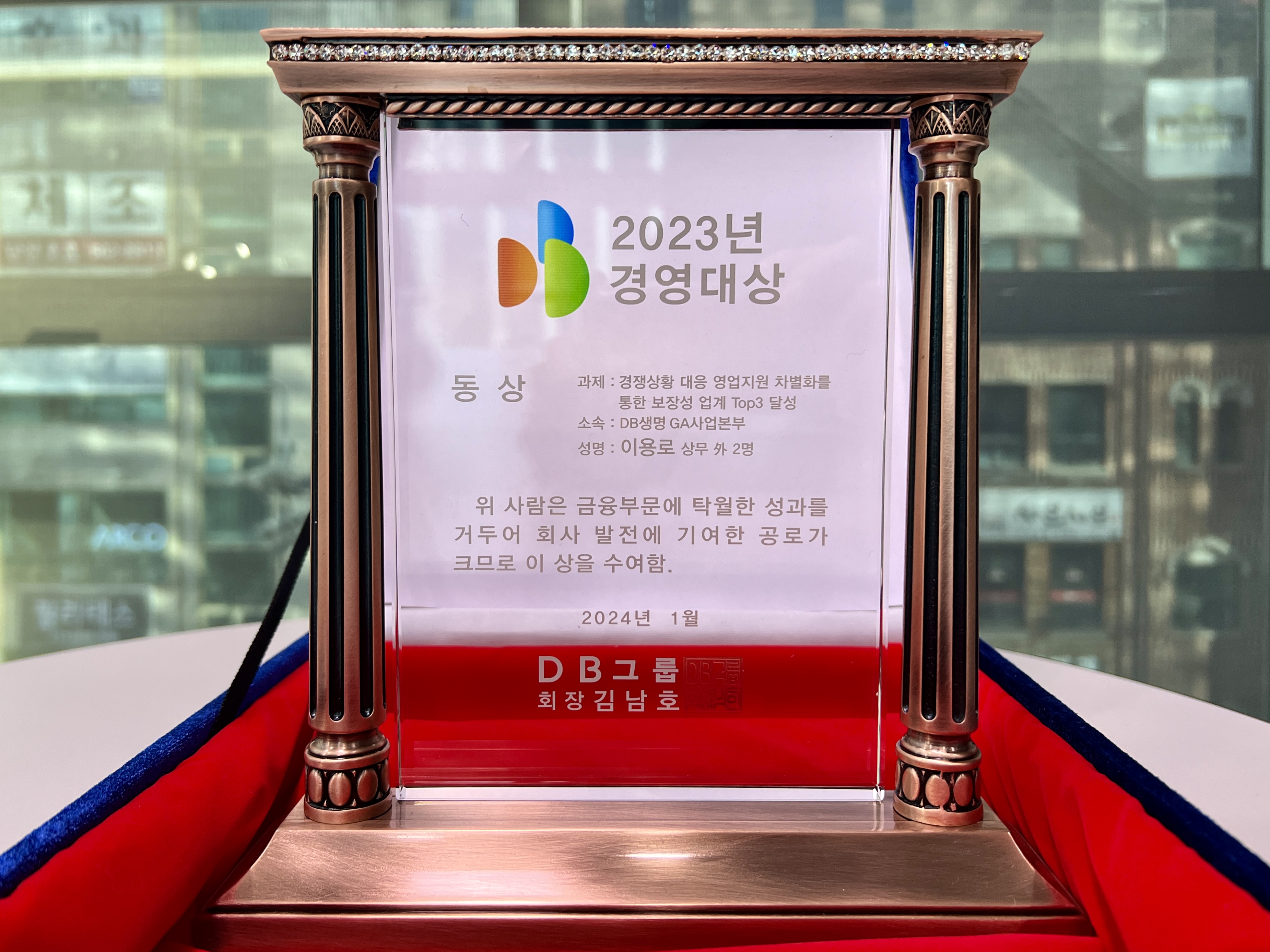 GA사업본부가 집중한 '영업지원 차별화를 통한 보장성 업계 Top3 달성' 과제는 이 같은 탁월한 성과와 회사 발전에 기여한 공로를 인정 받아 DB그룹 ‘2023년 경영대상’ 동상을 수상하기도 했다.