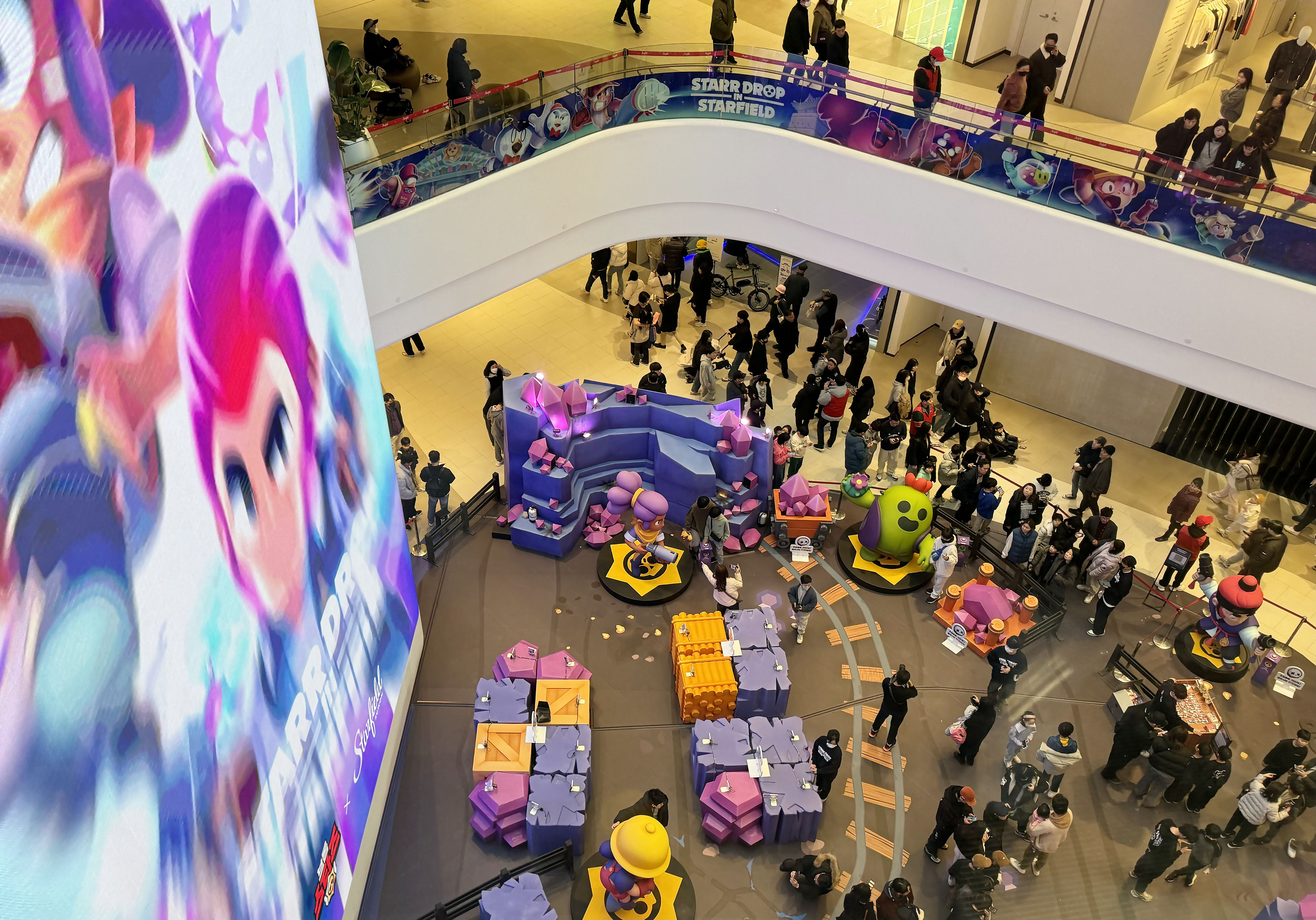 화면 속에서만 보던 작은 게임 캐릭터들을 큰 크기로 즐길 수 있다니, 아이들의 시선을 제대로 잡아끌었는데요. 1층의 곳곳에 마련된 공간들을 이용해 게임존과 포토존, 굿즈샵 세 가지의 테마로 팝업이 진행 중이었음에도 오픈런을 통해 미리 예약하지 않으면 즐기기 힘들다고 하니 브롤스타즈를 현실감 있게 즐기고 싶은 분들은 오픈에 맞춰 빠른 방문으로 즐길 수 있으셨으면 좋겠어요. 워낙 넓은 공간을 사용한 팝업이다 보니 몰입도가 상당했던 것 같아요. 덕분에 스타필드에서 다음에 준비할 컨텐츠가 무엇일지 더 궁금하네요