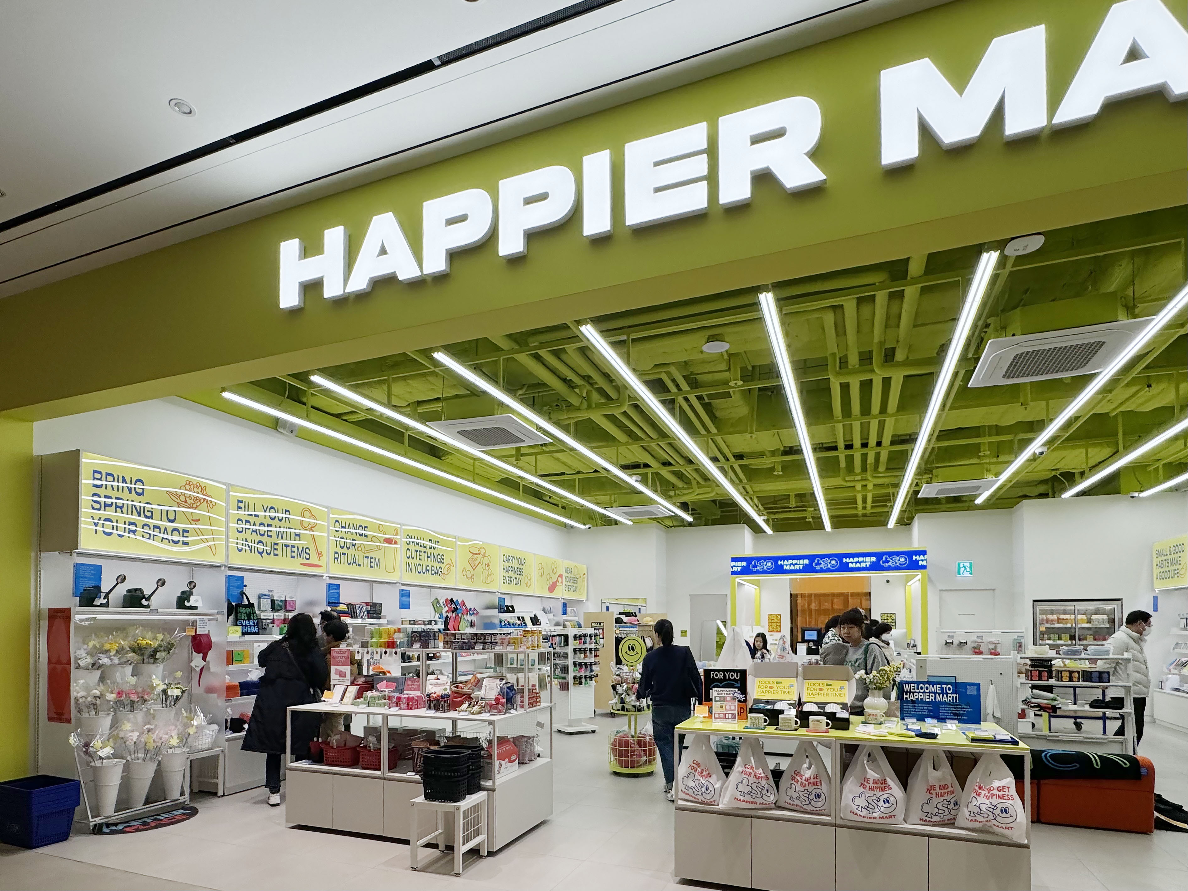 복합 쇼핑몰의 쇼핑 거리, 평범한 문구류는 없습니다. 어딘가 한끝 다른 아기자기한 문구류를 포함해 디테일이 있는 굿즈들, 지나가며 한 송이씩 쉽게 사기 좋은 꽃다발까지 모두 있는 요즘 편의점 happier mart도 입점해 있었는데요. 스타필드 수원에 입점해 있는 여러 브랜드들은 단순히 제품들을 ‘진열’만 해놓은 게 아니라 이 매장에서만 얻어 갈 수 있는 ‘경험’에 집중해 디스플레이와 체험형 시설들을 갖추고 있어 만족도가 높은 쇼핑을 즐길 수 있습니다.