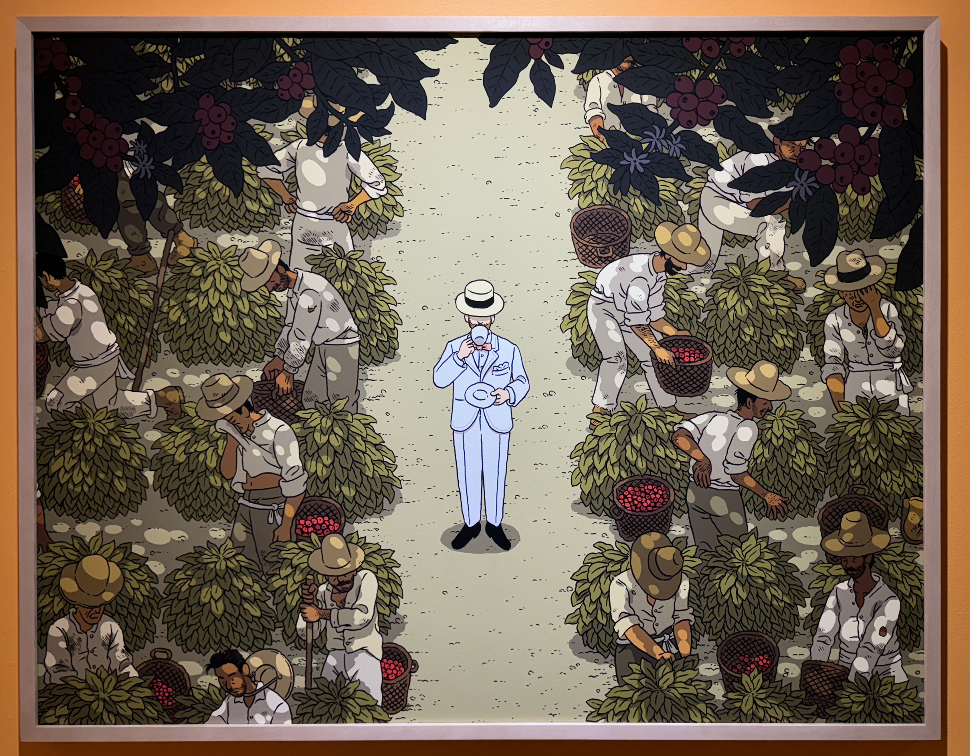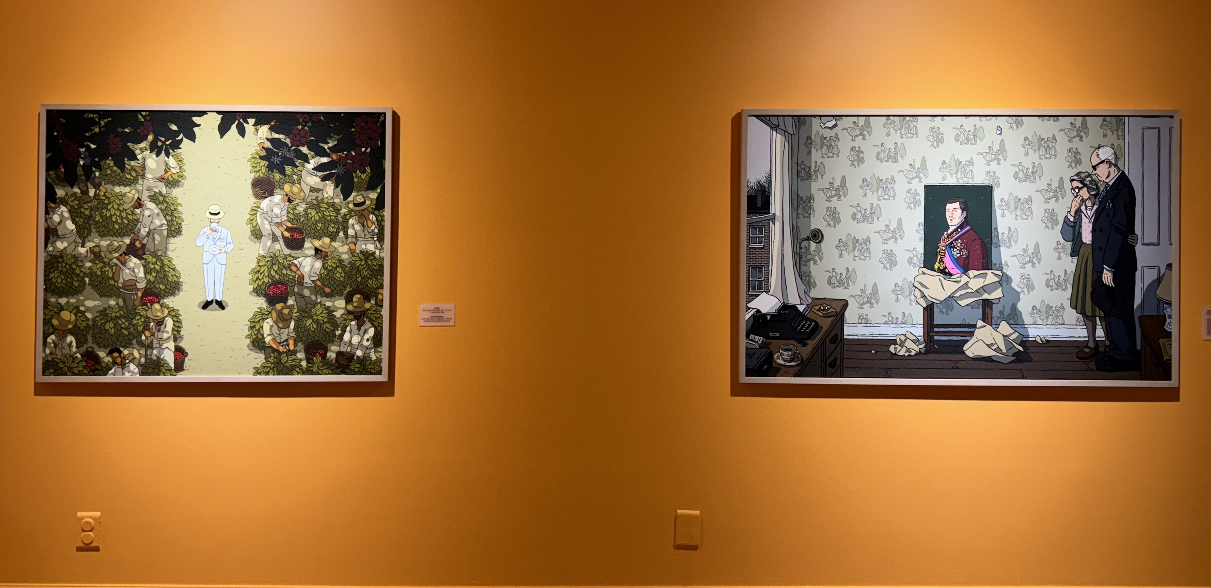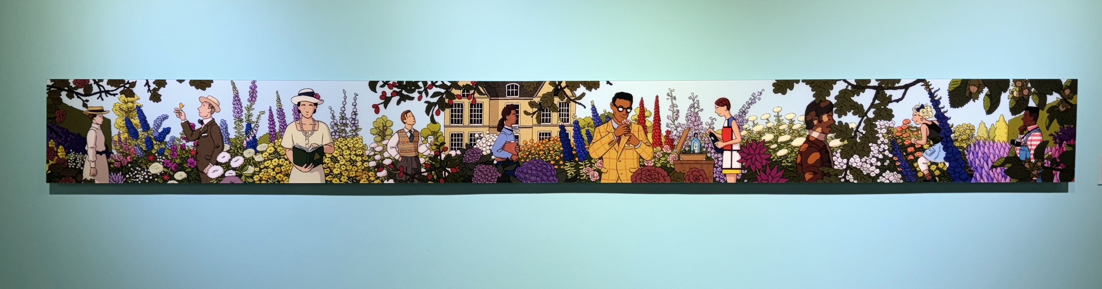 그래서인지 이 섹션에서의 작품들은 더욱 따스한 느낌과 생동감이 가득한데요. 특히 아래쪽의 길게 이어진 ‘봄베이 사파이어’라는 작품은 파노라마로 이어지는 작품의 왼쪽부터 각각 10년 단위로 변화하는 20세기를 인물의 의복을 통해 상징적으로 보여주며 하나의 연대기를 한눈에 보여줍니다. 사람들의 생활과 여가, 기술의 변천사와 달리 변함없는 사랑을 받는 정원의 모습을 아름답게 묘사된 것을 대표적으로 보여준답니다.