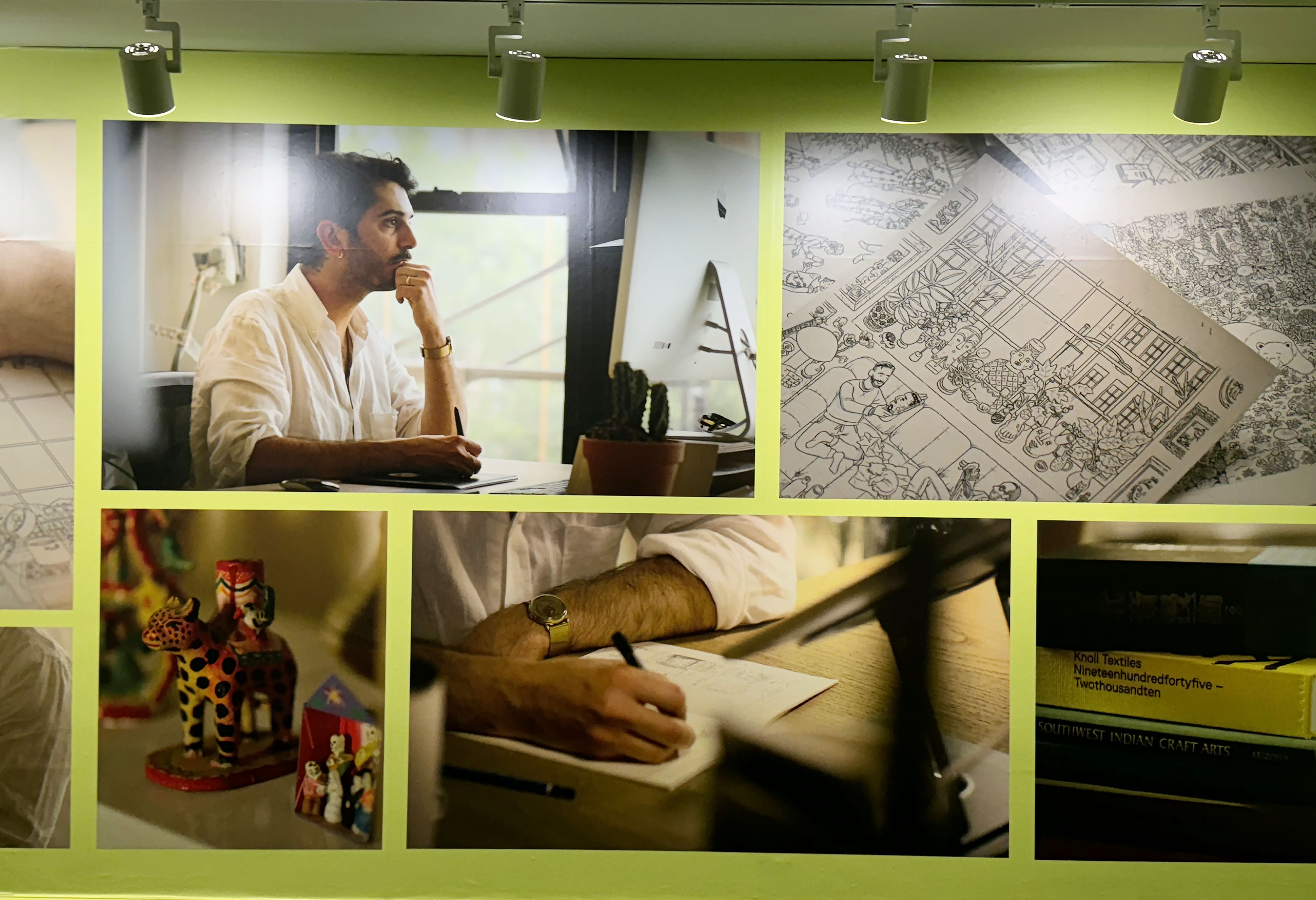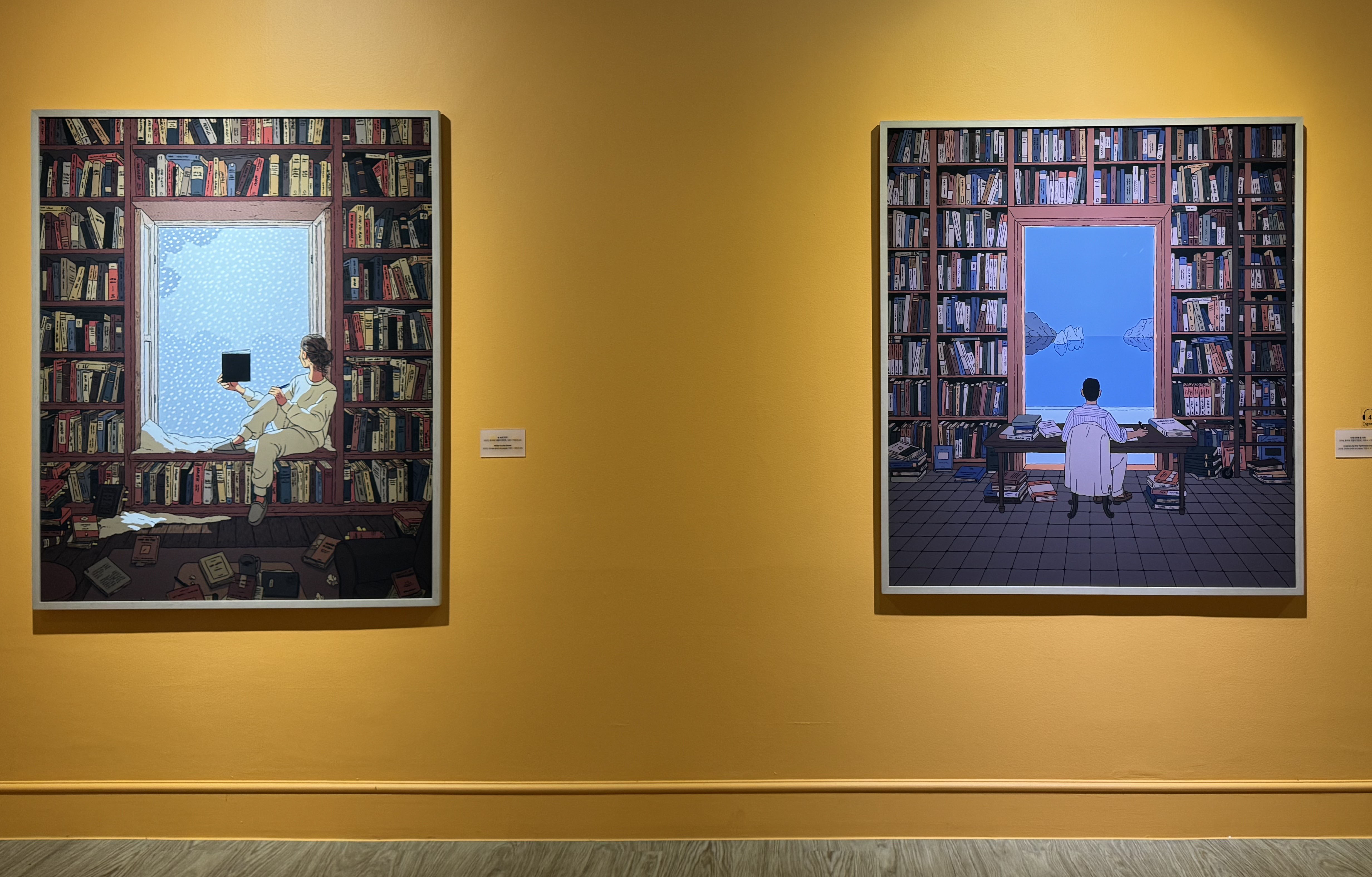섹션의 중간에 특별한 공간을 발견해 보세요. <책거리>라고 마련된 이 공간에서는 이전에 공개되지 않았던 원화 드로잉을 포함해 채색되지 않은 작품들을 볼 수 있습니다. 일반적으로 머릿속에서 이미지를 그리는 것으로 시작해 머릿속에 있는 이미지를 종이 위에 펼쳐내는 방식으로 작업을 한다고 하는데요. 이 디테일한 드로잉 속에서 작가의 컬렉션과 취향을 엿볼 수 있습니다. 또한 책거리의 중간에는 ‘티레니아해 옆 서재’를 접목해 특별한 포토존이 마련되어 있어 직접 책상에 앉아 작품 속 작가의 모습에 몰입해 인증샷을 남길 수 있습니다.