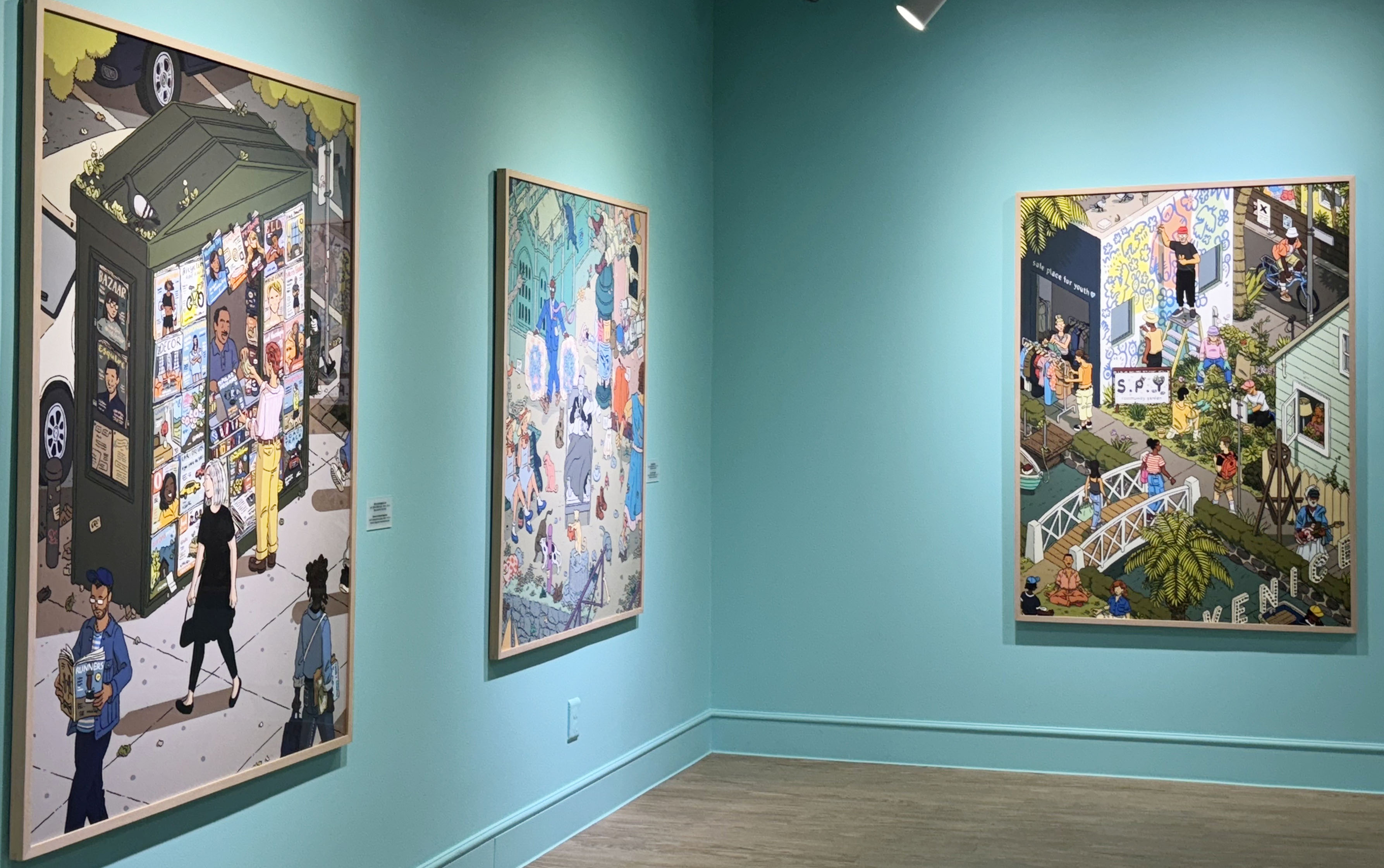공동의 장소, 군중, 번화가 등 더 큰 외부 세계를 배경으로 한 작품들이 등장합니다. 이 섹션에서는 밀스타인이 표현하는 군중의 양면성을 확인해 볼 수 있습니다. 특히 일리야 밀스타인을 세상에 알리는 데 큰 계기가 되었던 뉴욕 타임즈와 협업한 작품 시리즈가 대표적입니다. 소호, 트라이베카, 할렘, 이스트 빌리지 등 뉴욕 맨해튼의 주요 구역에 거주했던 실제 인물이 경험한 과거의 기억들을 참고하여 그린 이 시리즈에서는 흔히 볼 수 있을법한 거리 풍경을 작가 특유의 예리하고 위트 있는 통찰력으로 표현합니다. 작은 부분이지만 표지판과 상징성이 있는 요소들을 바탕으로 위치와 시기를 짐작할 수 있는 재미를 느낄 수 있습니다.