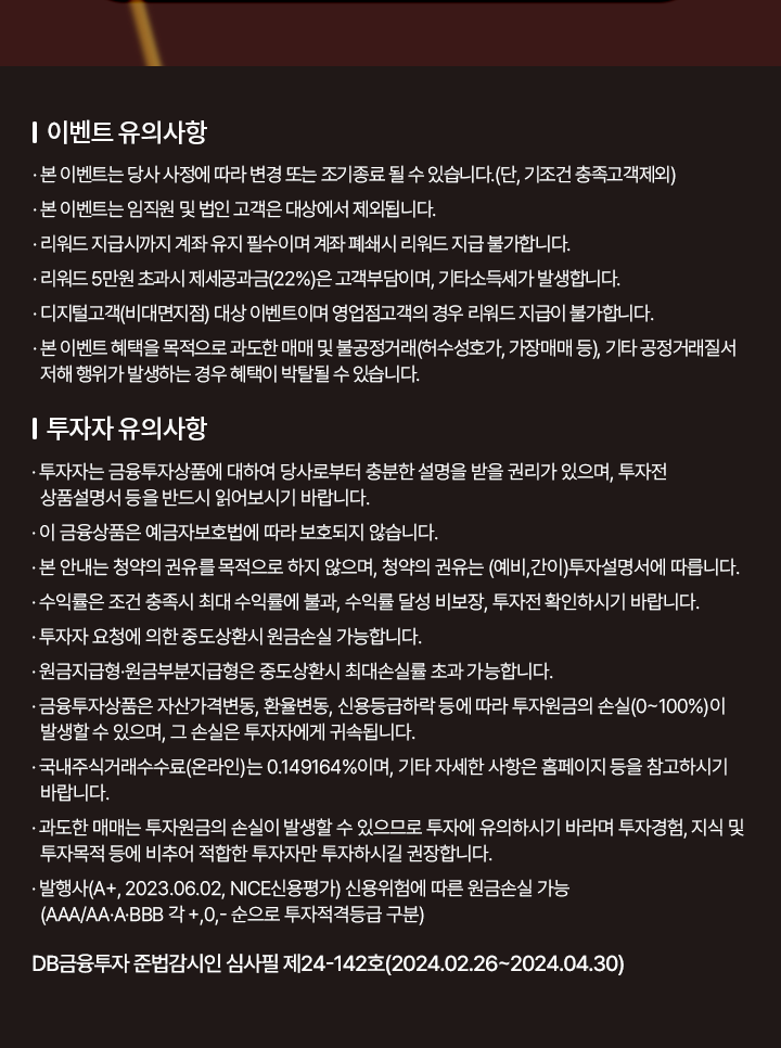 | DB금융투자, 신규/휴먼대상 웰컴 이벤트 (0) | 2024.03.05 |