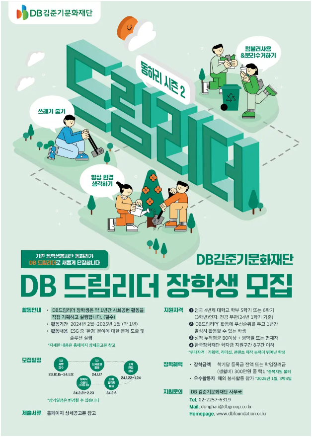 2024 DB 드림리더 장학생들은 2024년 1월까지 팀별로 ESG 중 ‘환경’ 분야의 문제를 도출하고 현장에서 솔루션을 실행하게 된다. 이를 위해 3월, 7월, 10월에는 팀별로 함께 기획하고 실행하는 ‘팀미션’과 매월 수행하는 ‘개인미션’, 5월과 12월에는 60명 장학생 전체가 함께 실행하는 ‘연합미션’을 수행한다.