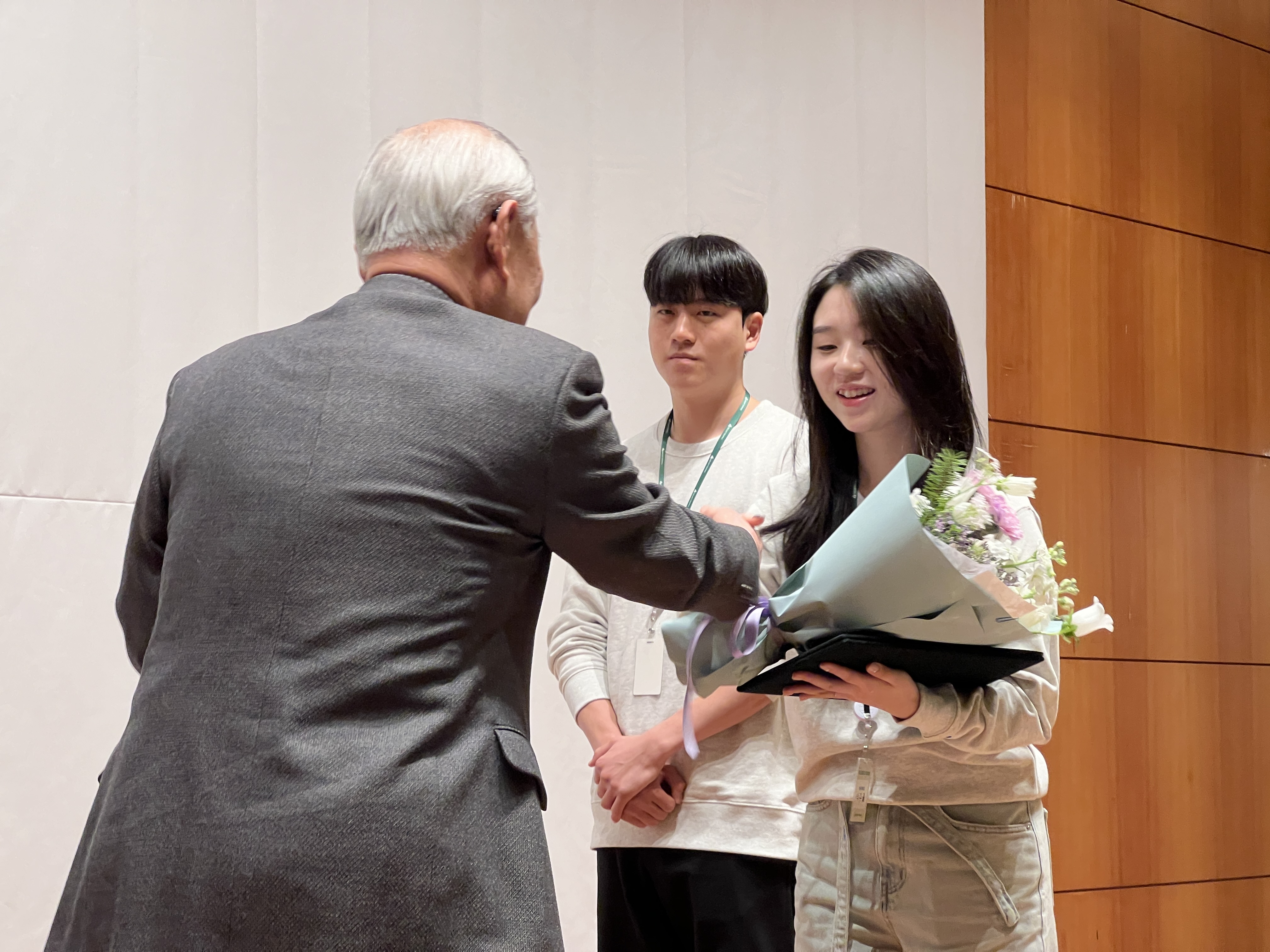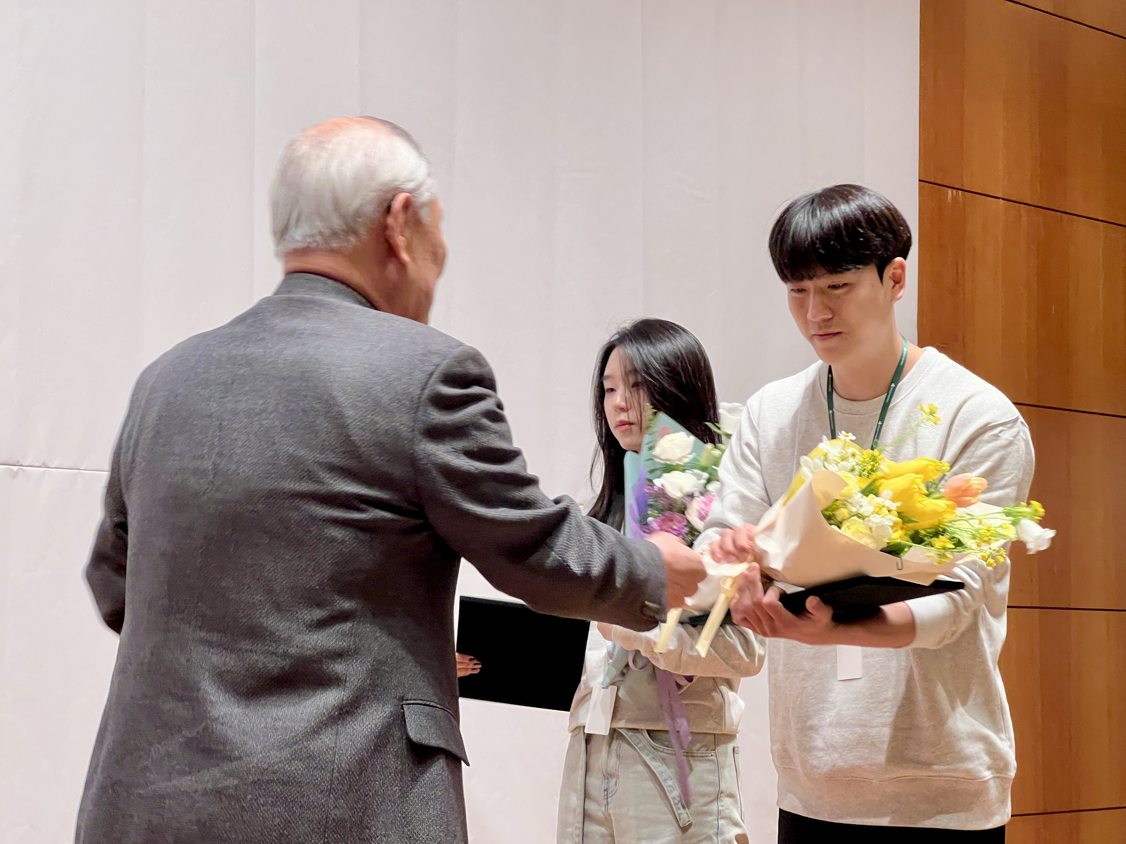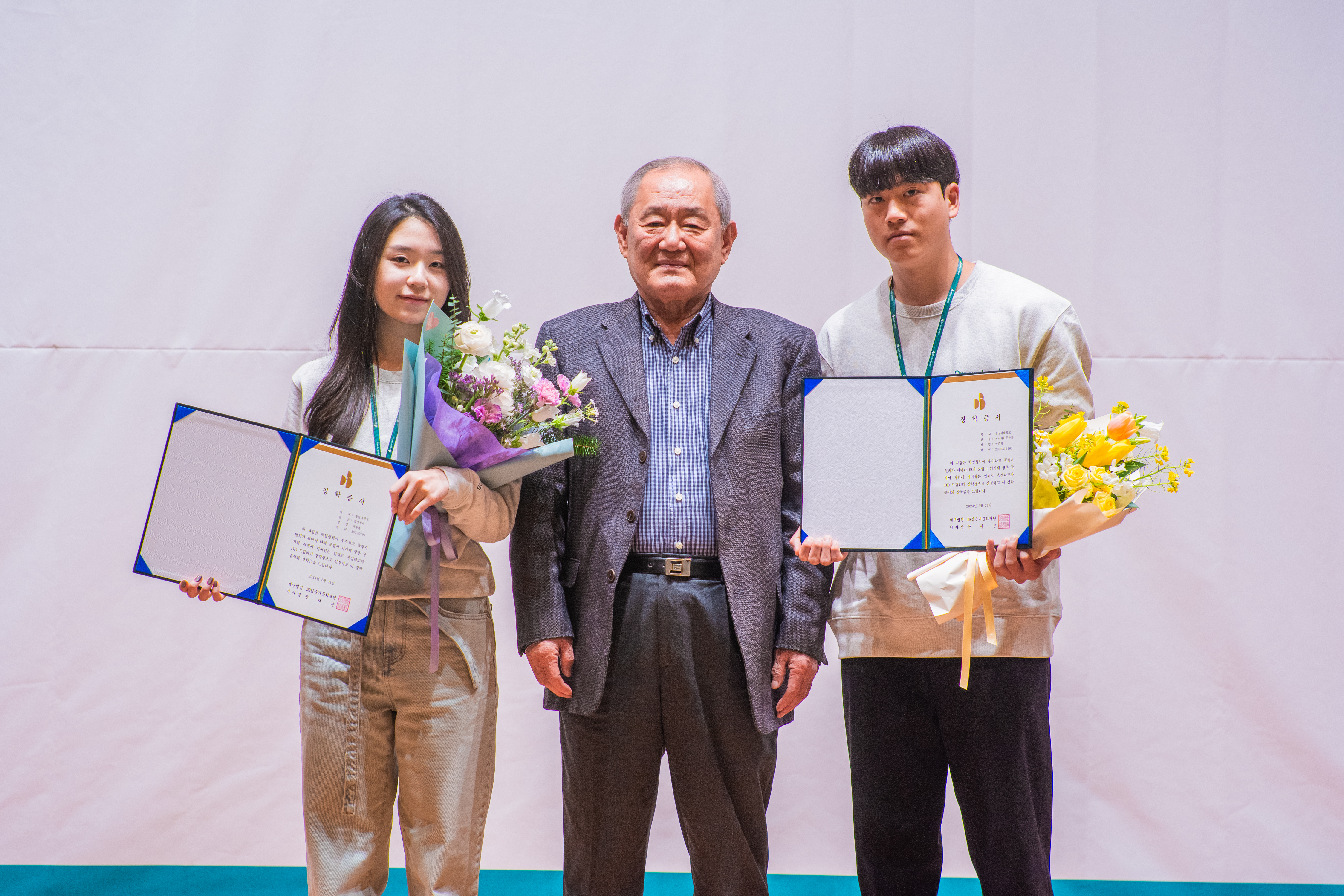이어 장학생 대표로 숭실대 박주율 학생과 성균관대 안준혁 학생이 단상에 올라 윤대근 이사장으로부터 ‘DB 드림리더 장학증서’와 꽃다발을 수여 받았다.