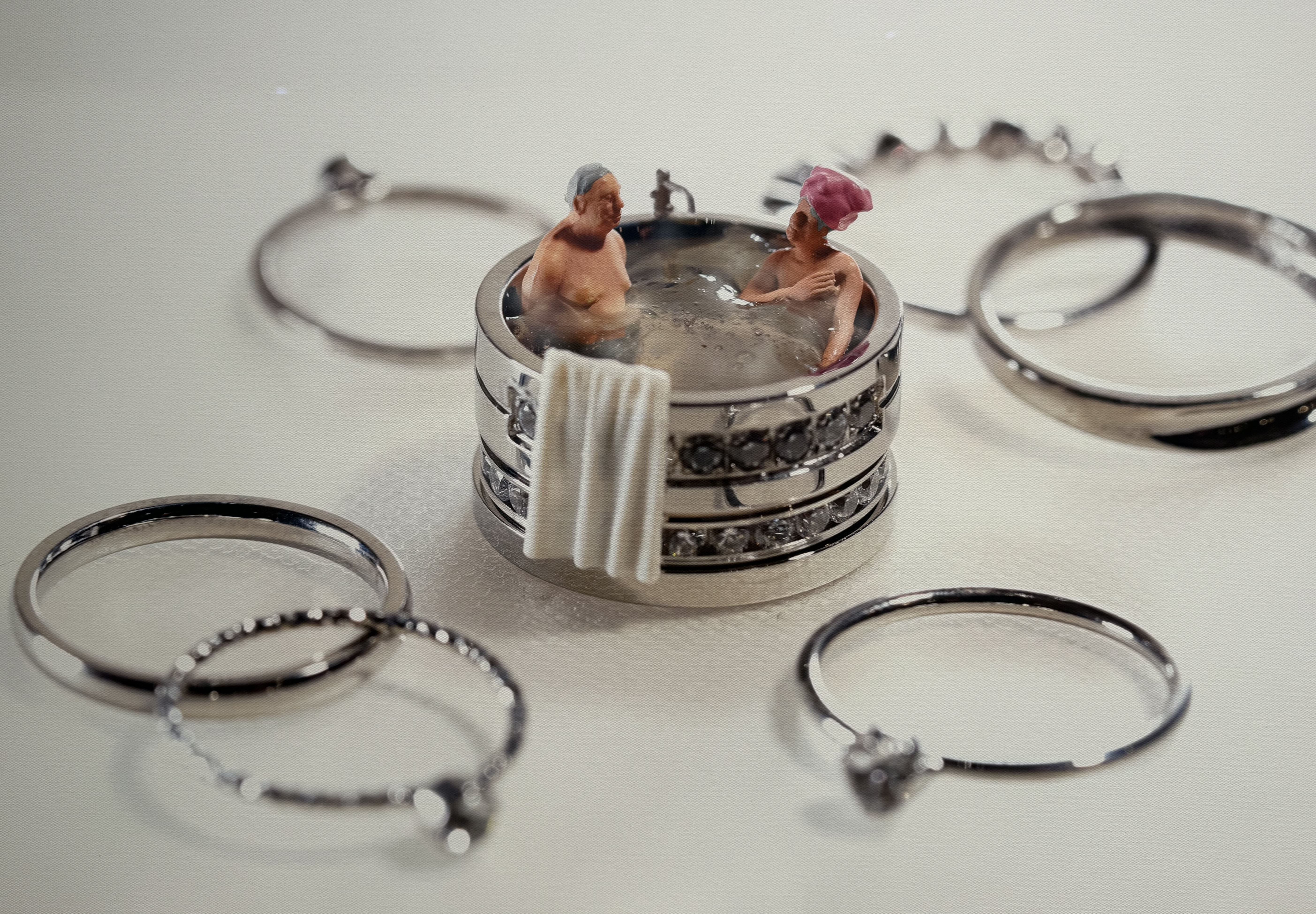 아이폰의 카메라 렌즈가 목욕탕이 될 정도의 사이즈라면? 비행기에 앉아 있는 승객들이 사실은 아이폰의 화면 속에 모두 담길 정도의 규모라면? 미니어처로 이루어진 작품들의 세상은 얼마나 조그마한지 짐작이 가시나요? 타나카 츠타야의 미니어처 작품의 매력은 단지 조그마한 사이즈로 만드는 것이 끝이 아니라, 일상생활에 너무나 익숙해 우리 모두가 그 크기를 짐작할 수 있는 사물들이 함께 등장해 평소와는 다른 사이즈감과 사용방법으로 등장한다는 것에서 흥미로움을 자아냅니다.