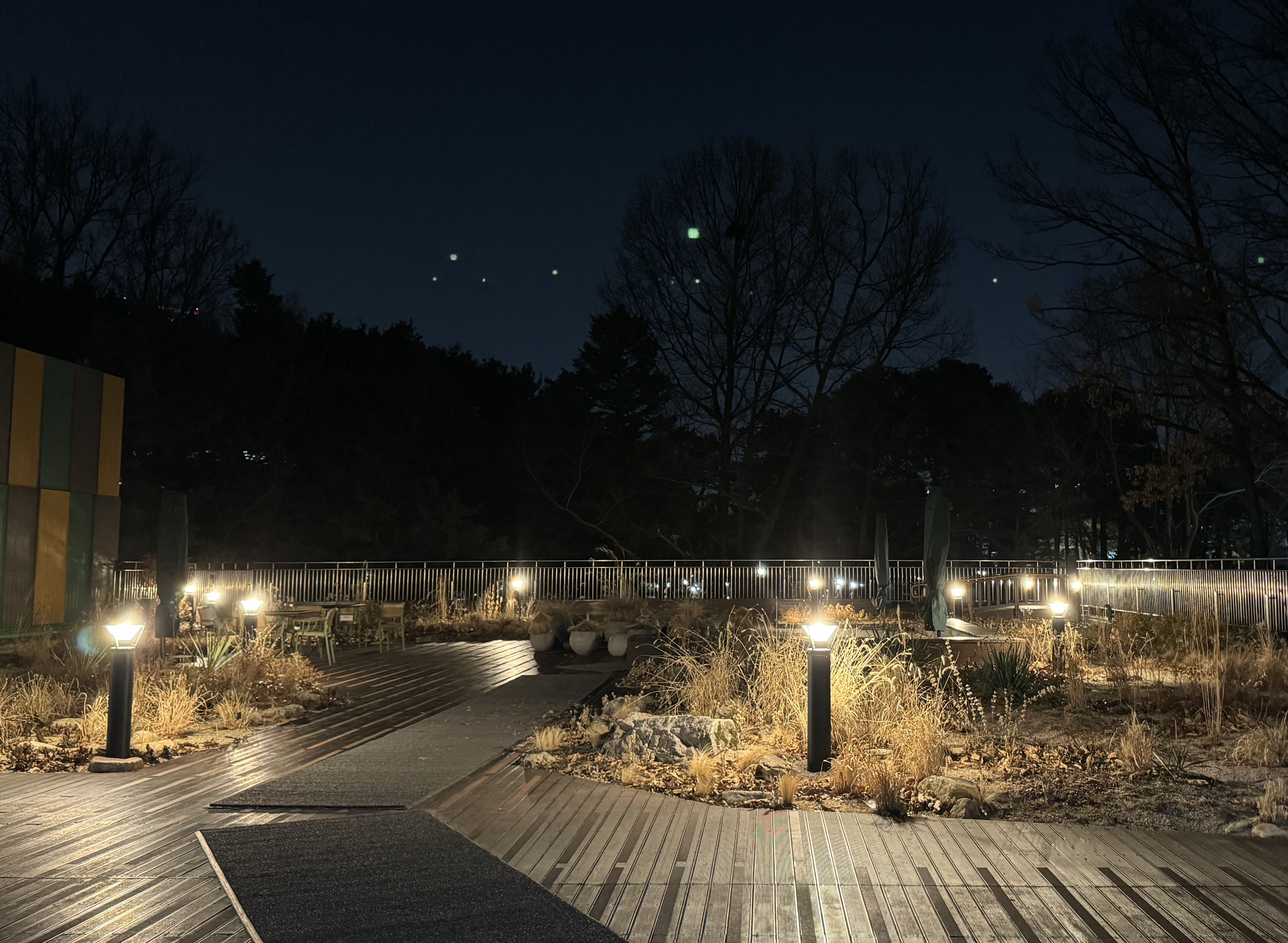 또 하나의 매력은 바로 루프탑이 마련되어 있다는 점 아닐까요? 건물 2층으로 계단을 따라 올라가면, 인조 잔디를 덮어 녹음이 짙은 루프탑을 만날 수 있습니다. 봄이 다가오며 새롭게 단장한 공간을 느껴 보세요. 살짝 보이는 사랑재의 처마와 저 멀리 보이는 한강이 야외로 피크닉을 나온 듯한 기분을 만끽하게 합니다.