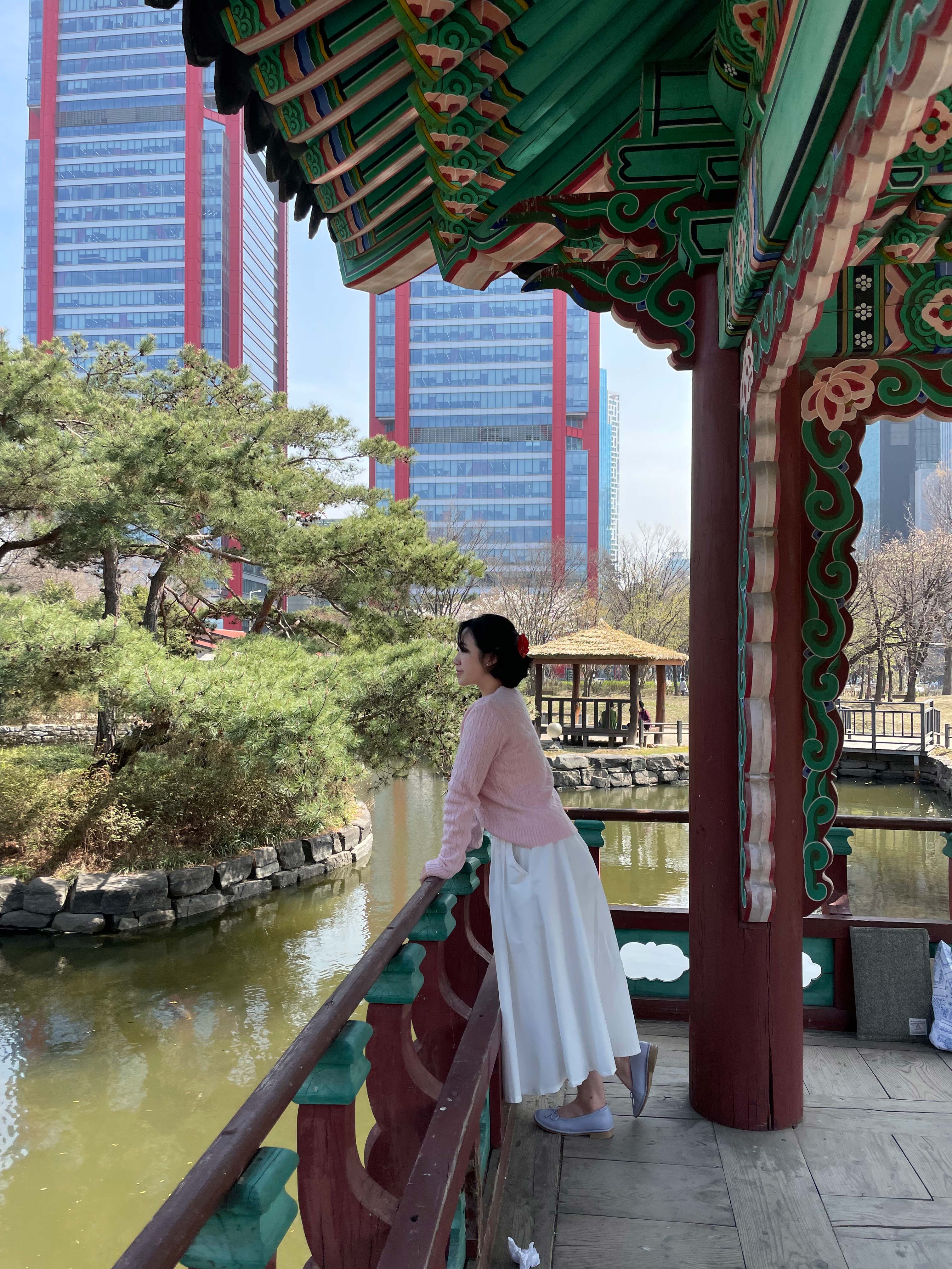 여의도에 벚꽃놀이와 강변서재를 즐기기 위해 방문하셨다면, 여의도 공원을 거닐며 힐링 되는 시간을 가져 보는 것도 좋을 것 같아요. 넓게 조성되어 있는 여의도 공원 전체를 걸어도 좋지만, 이 사진과 같이 사모정이 있는 스팟으로 가시면, 연못과 함께 봄바람을 느끼실 수 있습니다.