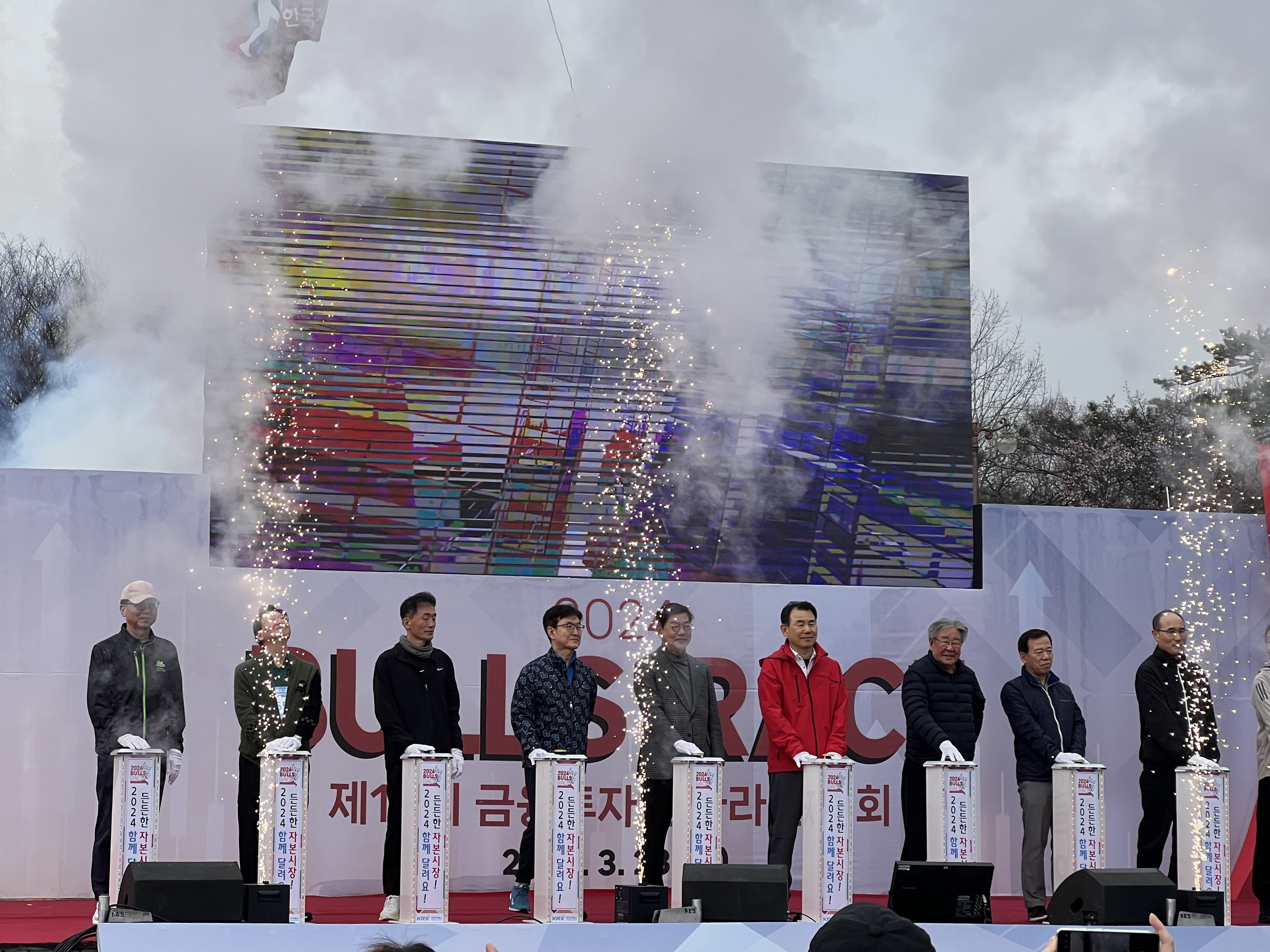 개막식은 내외빈이 무대에 올라 축포 버튼을 누르는 세러머니 순서에서 절정에 달했다. 흰색 축포가 터지는 가운데 ‘2024 함께 달려요! 든든한 자본시장!’ 현수막을 매단 커다란 애드벌룬이 행사장 하늘로 솟아오르자 참석자들의 박수가 쏟아졌다. 드디어 출발선으로 이동!