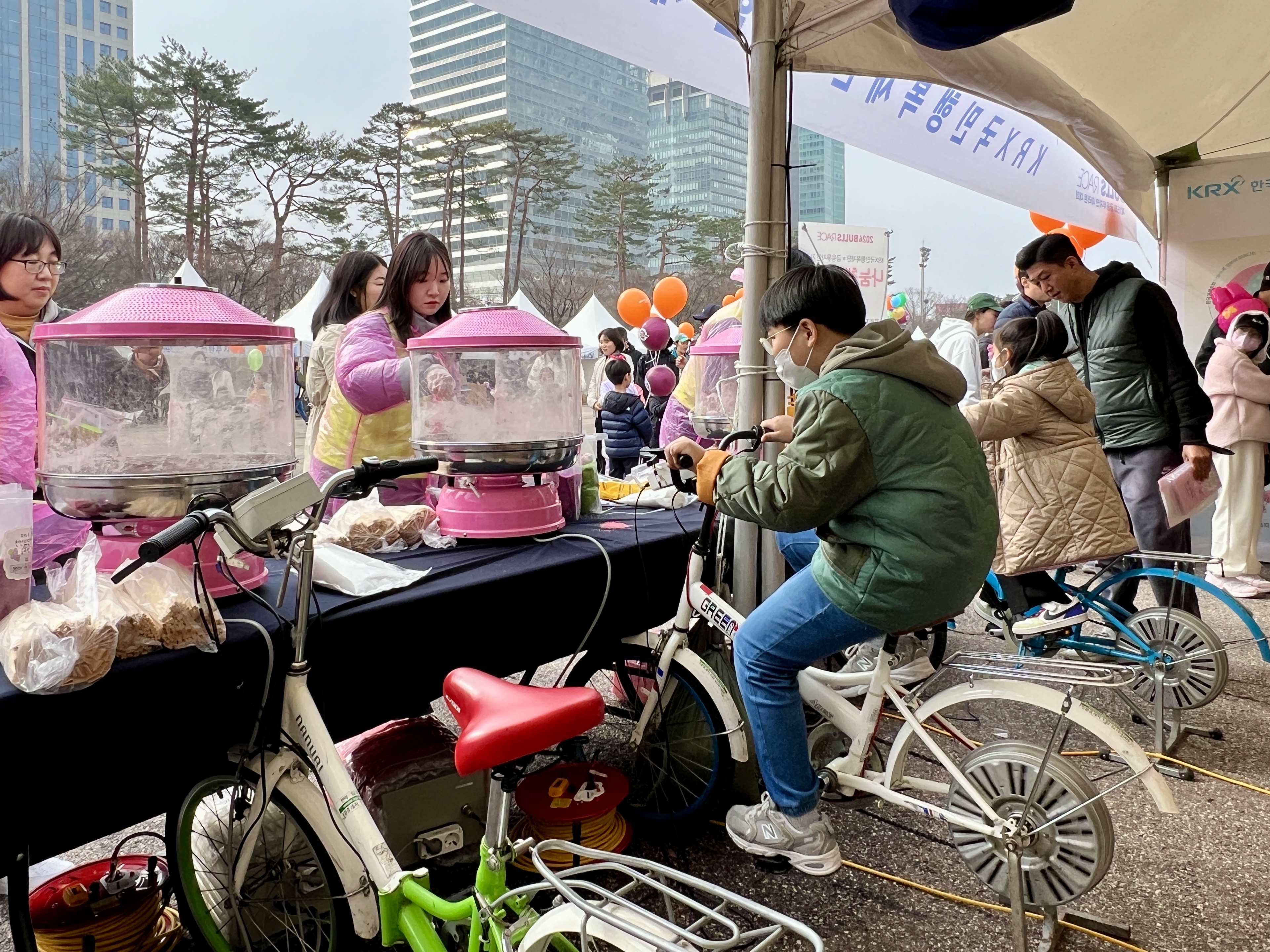 또 아이들은 레이스가 시작되기 전 페이스페인팅을 하고 문구류 세트를 선물로 받고, 체험존에서 민속 놀이를 즐기기도 했다. 옆에서는 전기 없이 친환경 솜사탕을 만들기 위해 자전거 발전기 페달을 힘껏 돌리는 아이들의 진지한 모습도 눈에 띄었다.