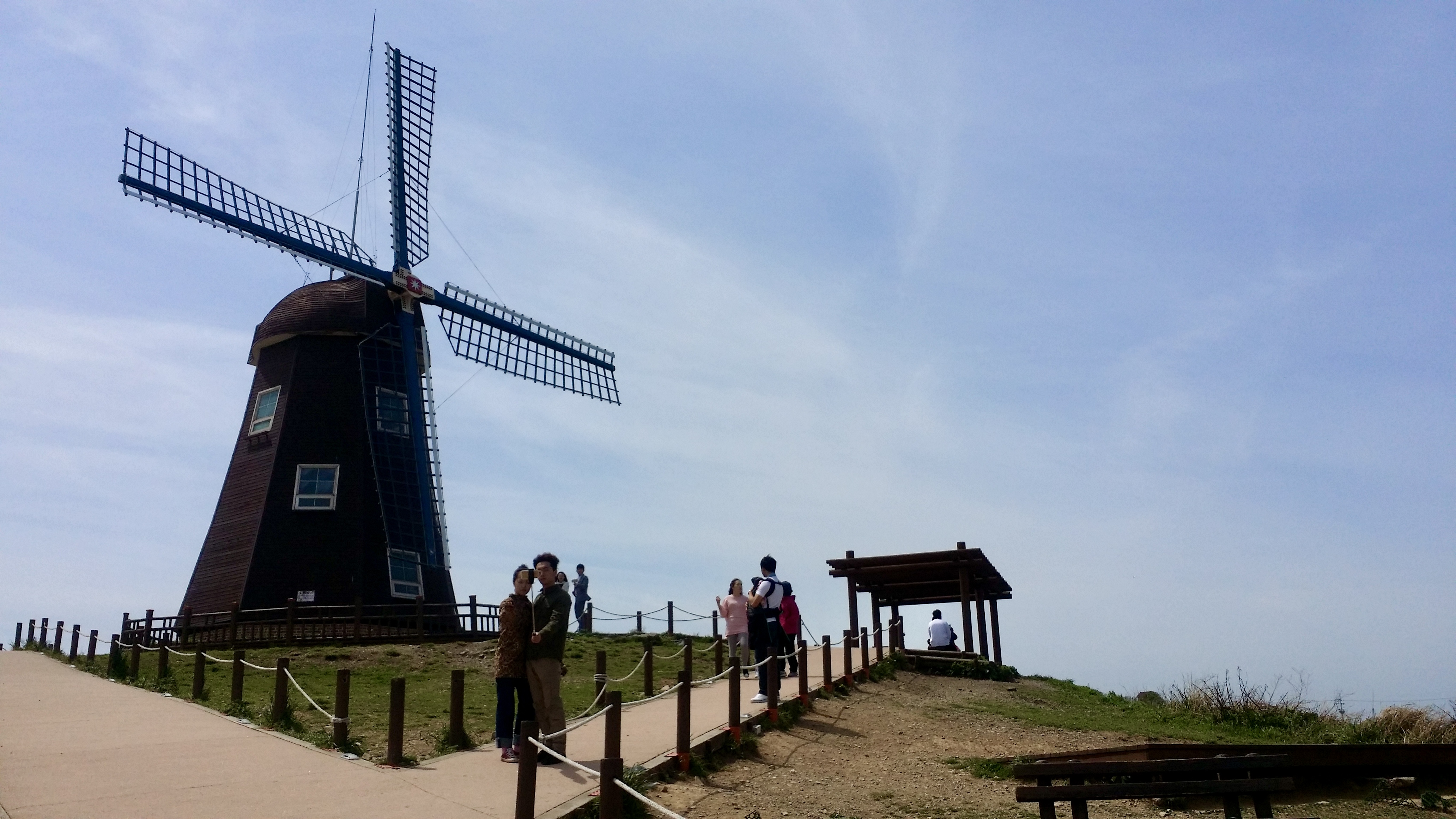 도장포 바다를 끼고 있는 언덕길을 5분 남짓 올라가면 커다란 풍차가 바닷바람을 맞고 서 있는 모습이 보여요.