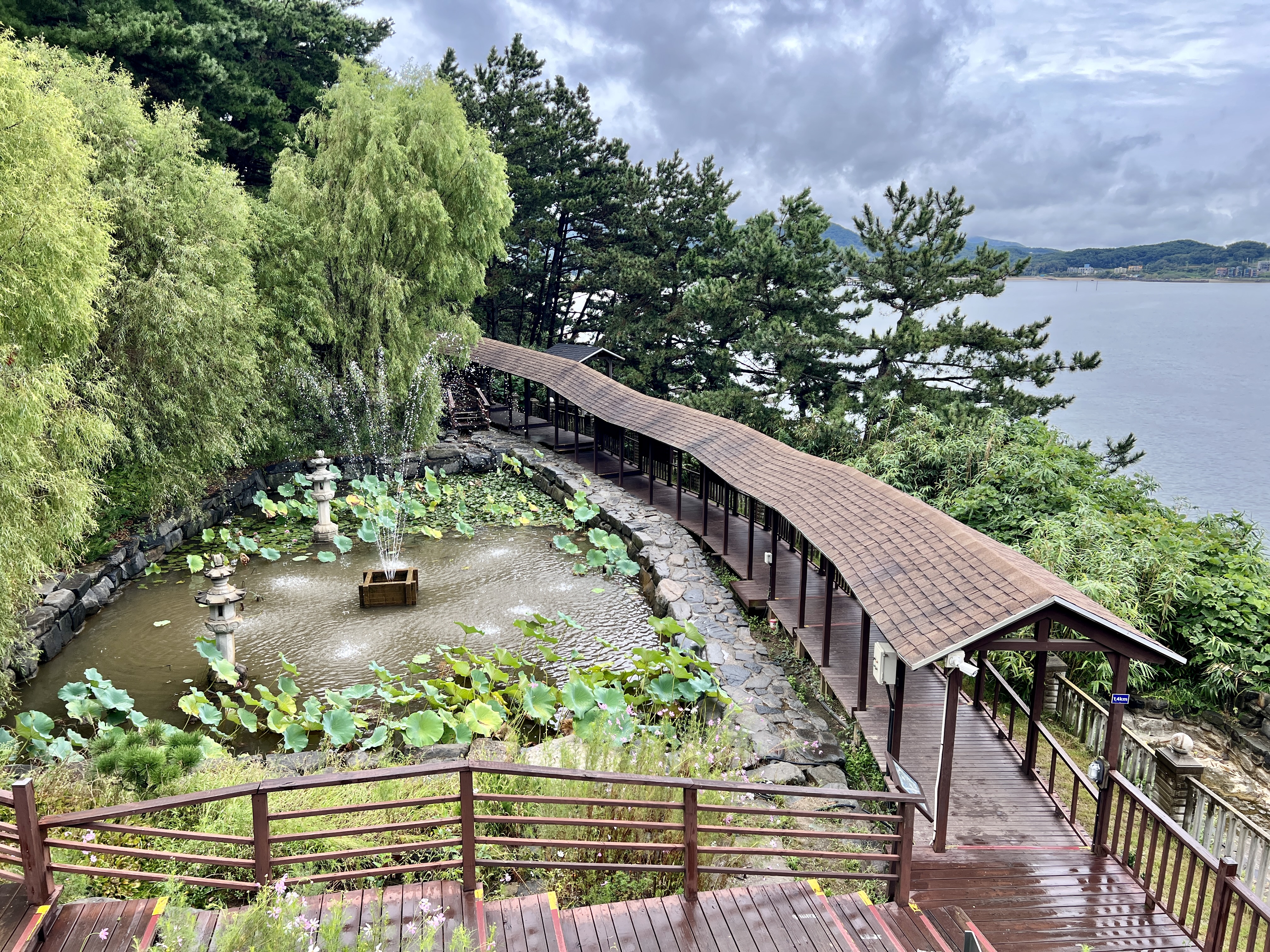 지붕 회랑을 따라 연못이 이어져요. 보통 바다를 낀 곳은 바다를 바라보는 조망에 집중하는데, 상화원은 섬 둘레 해안가를 따라 해변연못을 조성했어요.