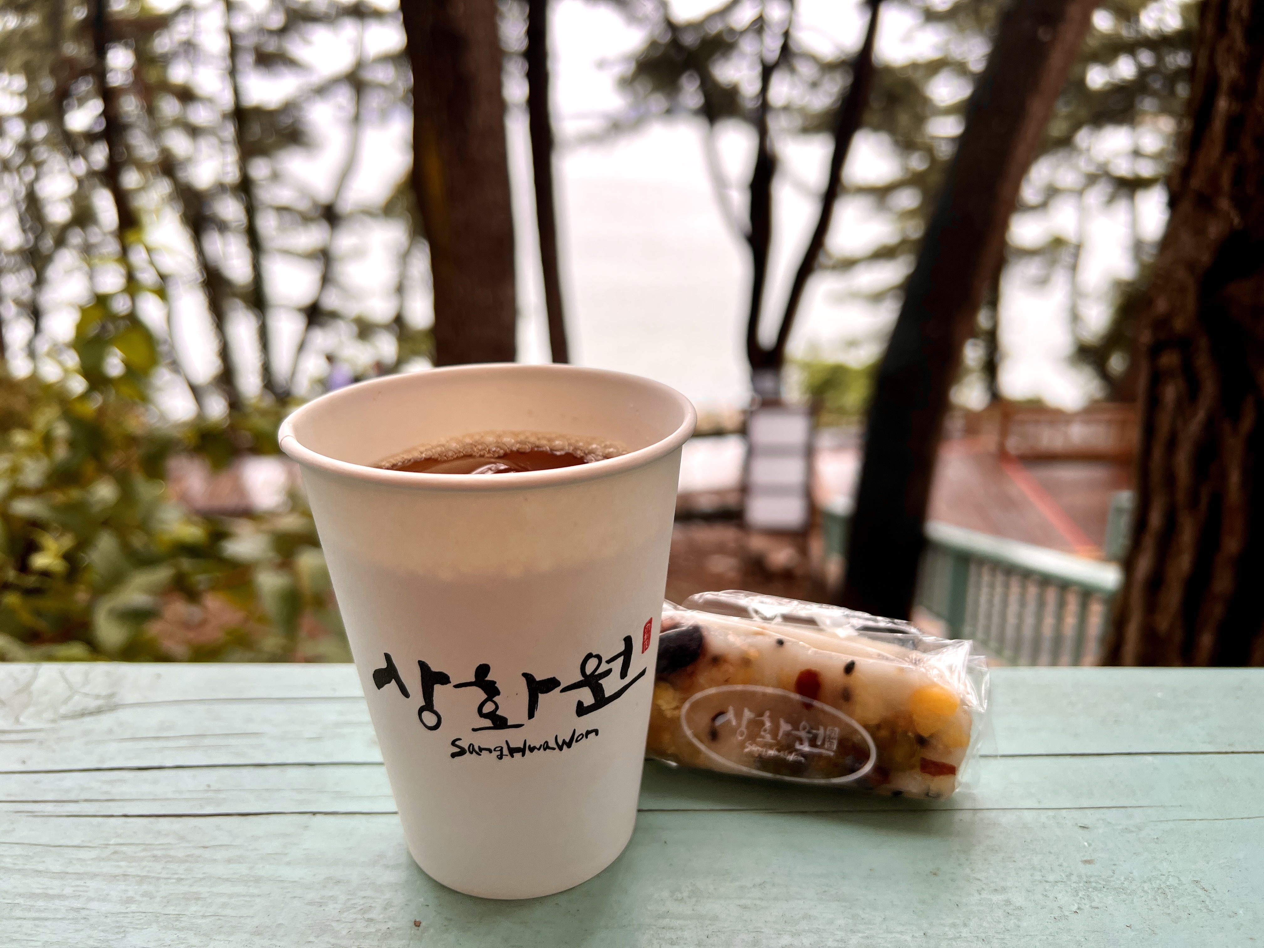 상화원에는 카페나 식당이 없고 식사는 외부 음식점을 이용하도록 권하고 있어요. 다만 ‘해송의숲’에 있는 방문객 센터에서 방문객에게 간단한 커피와 떡을 제공해요. 솔숲에는 바다를 바라보며 쉴 수 있는 테이블이 마련돼 있습니다.