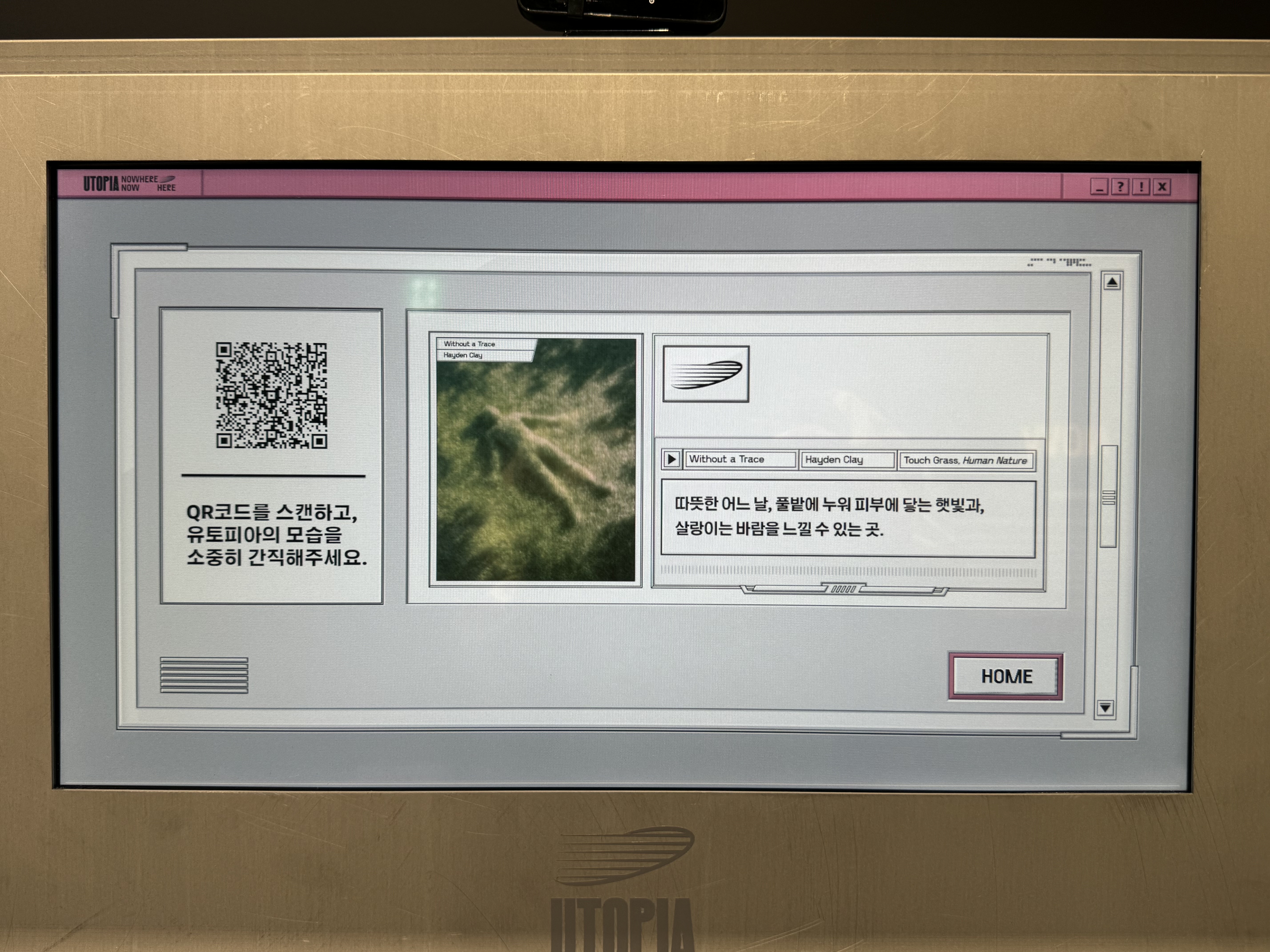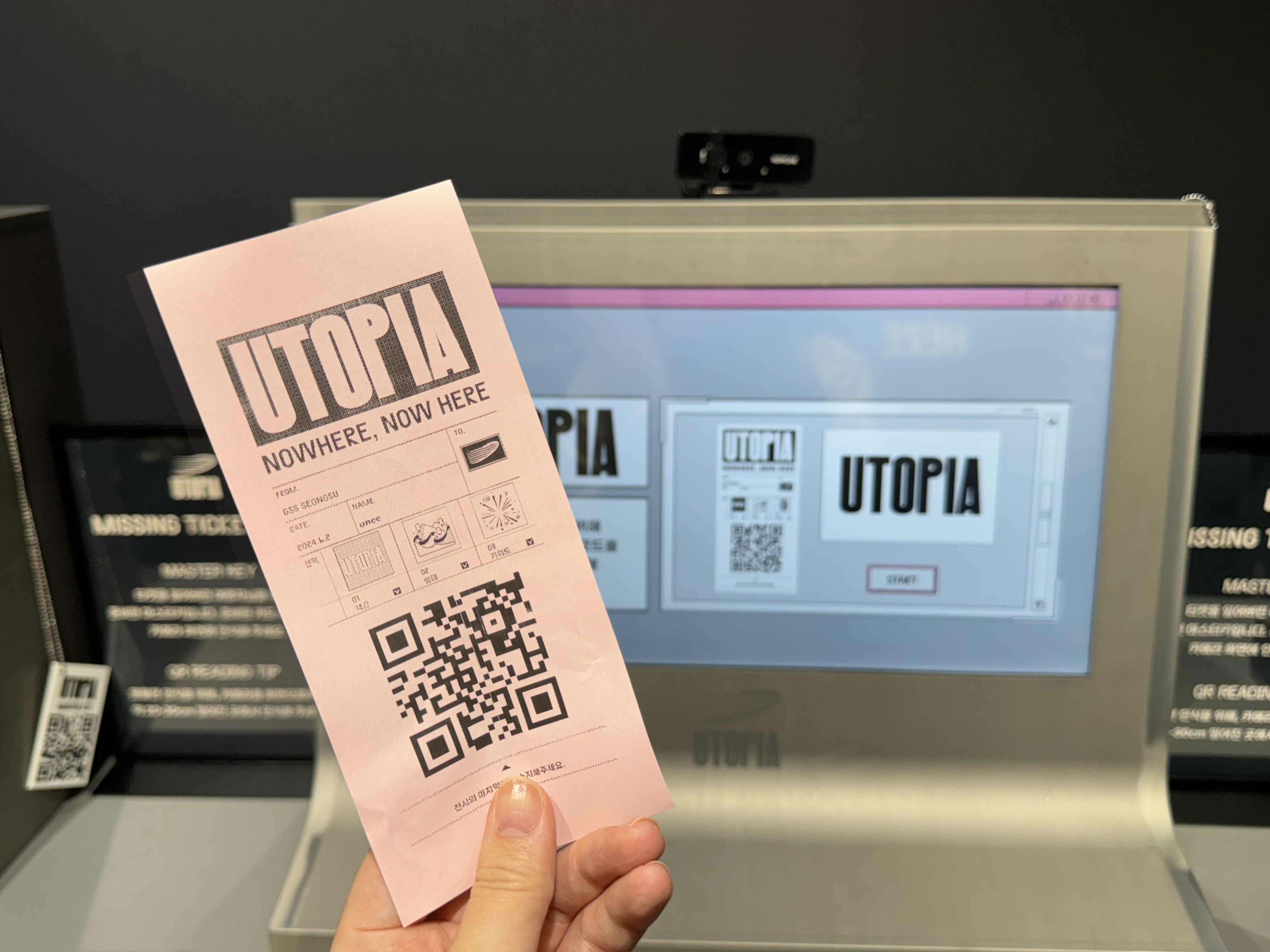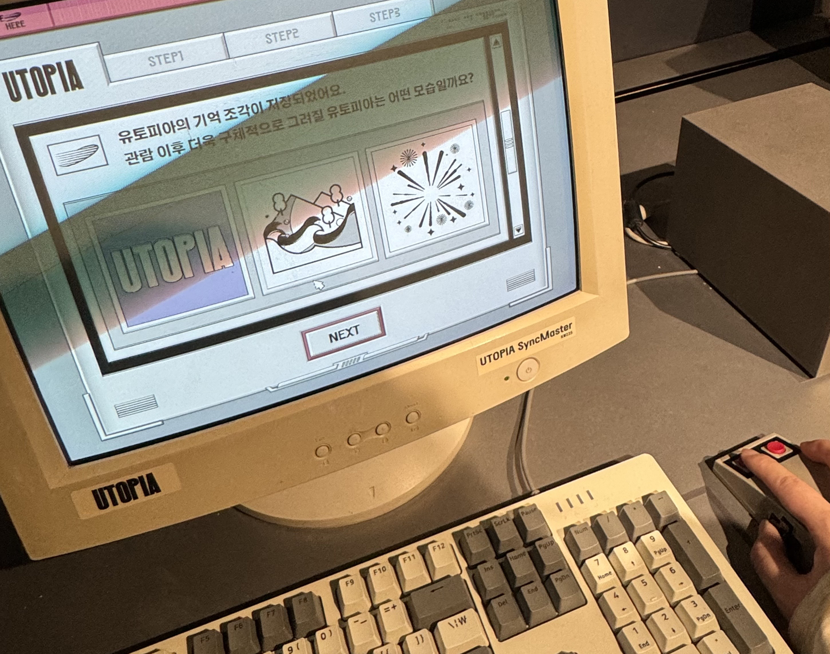 입장과 함께 보이는 것은 몇 대의 컴퓨터. 이곳에서 우리는 유토피아로 향하는 티켓을 먼저 끊은 후 전시 관람을 시작하게 됩니다. 내가 꿈꾸는 유토피아의 모습은 어떤 모습인지, 그곳은 내 기억 속에서 어떤 감정을 느끼게 하는지 먼저 떠올려 보세요. 내가 처음 떠올린 유토피아의 모습과 전시가 끝난 후에 내가 생각하는 유토피아를 비교할 수 있습니다.