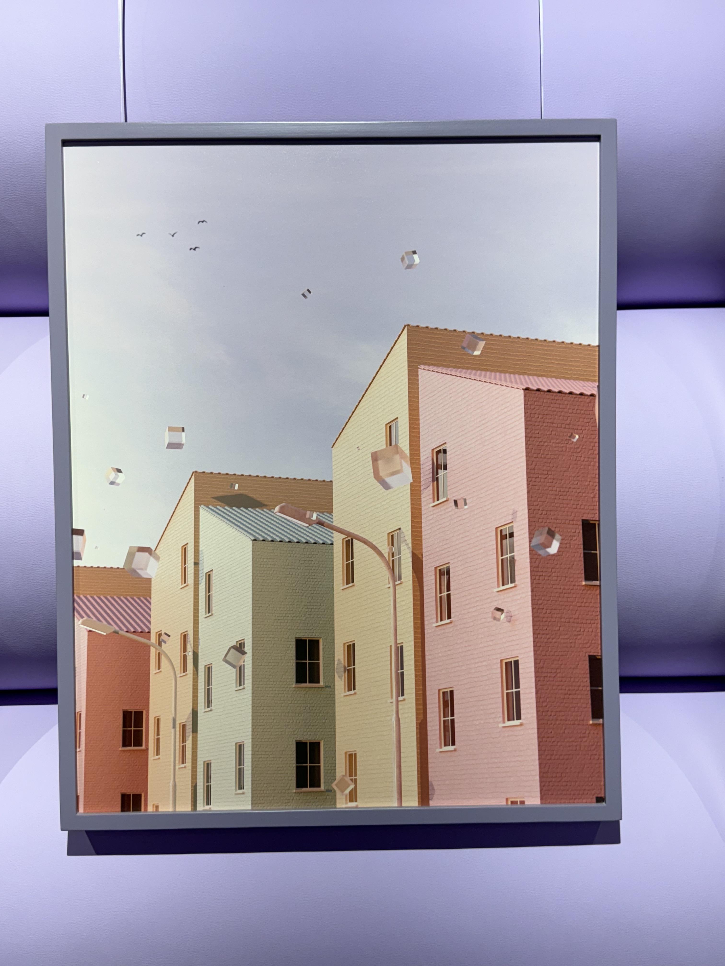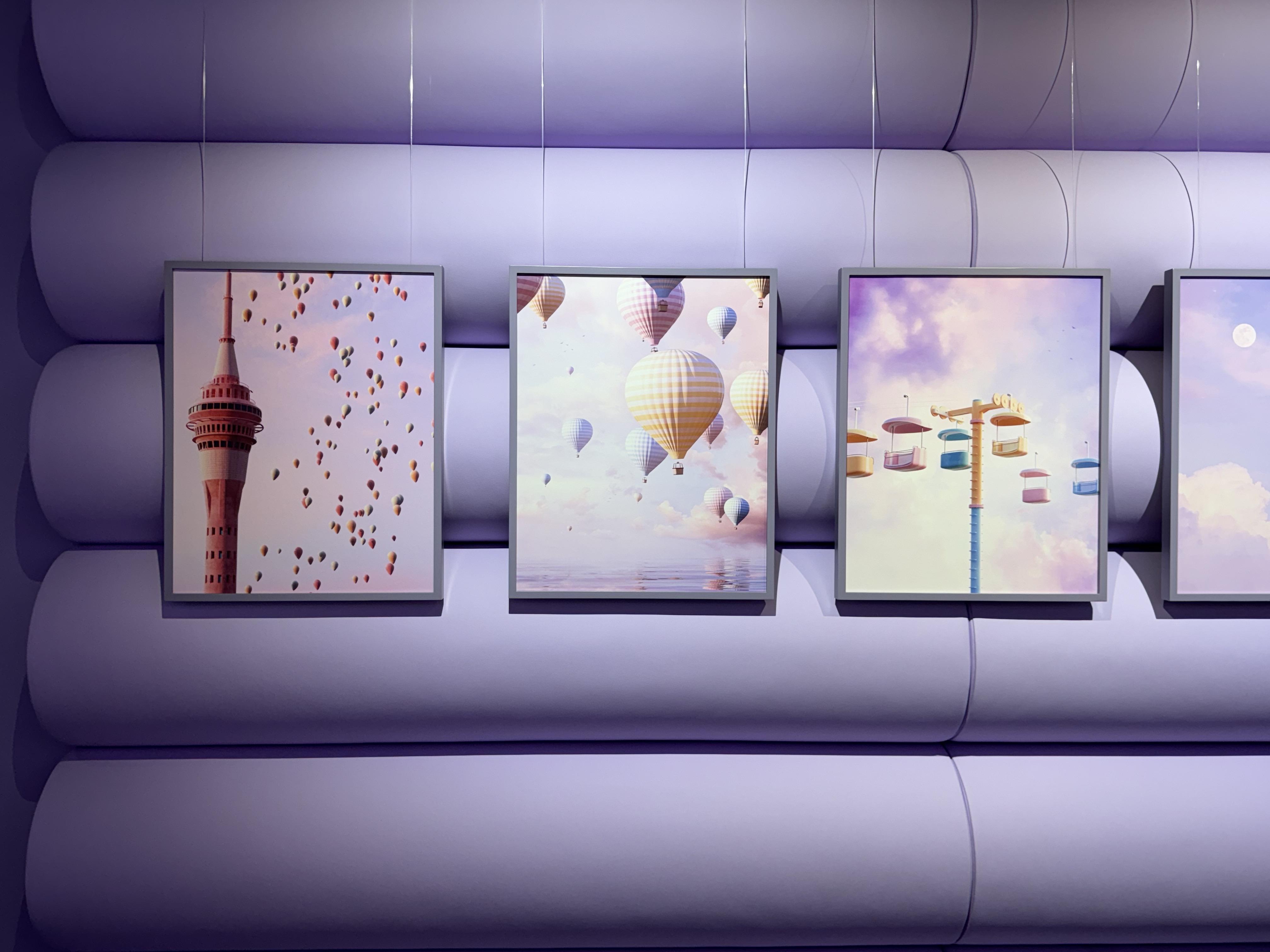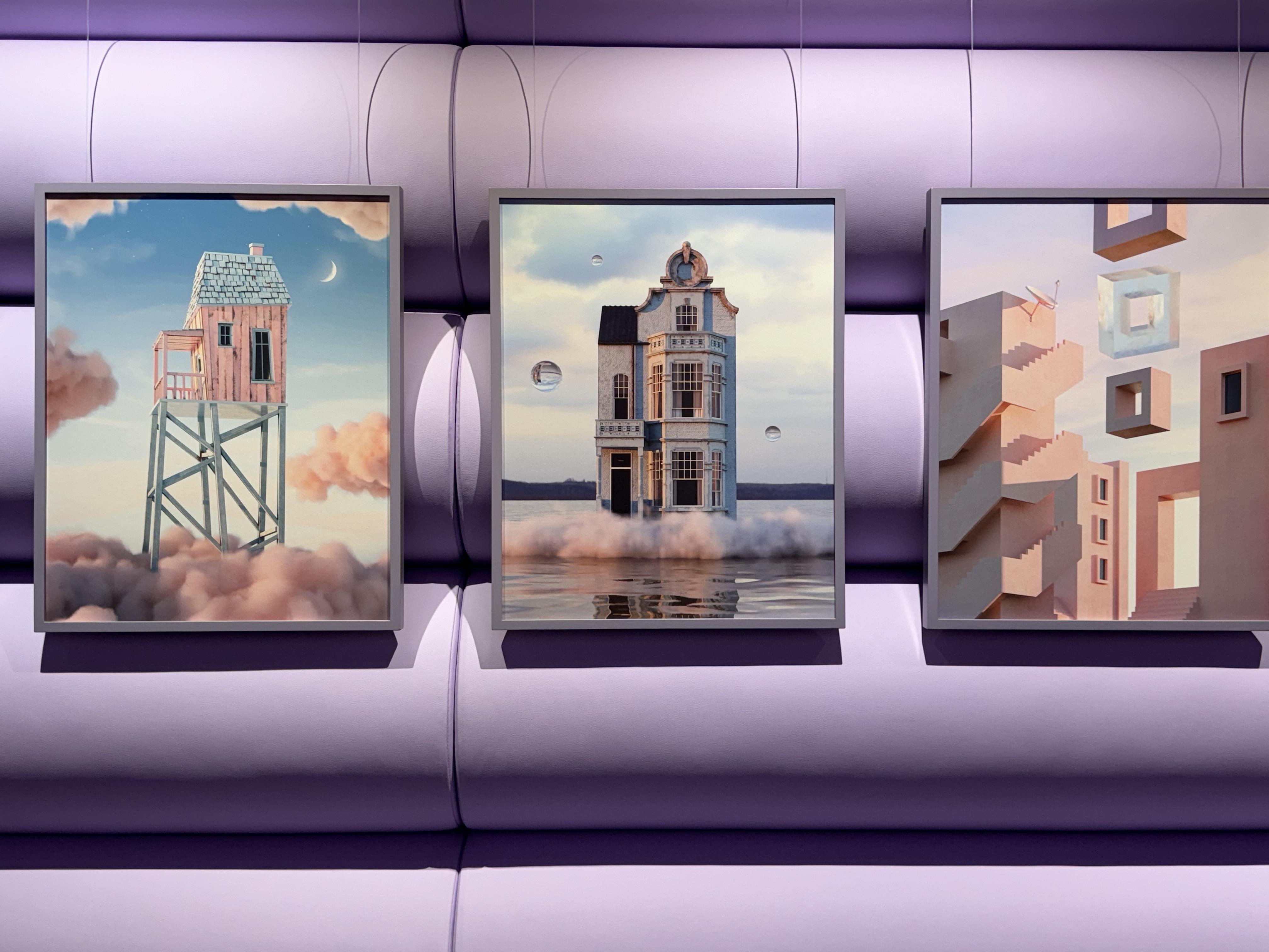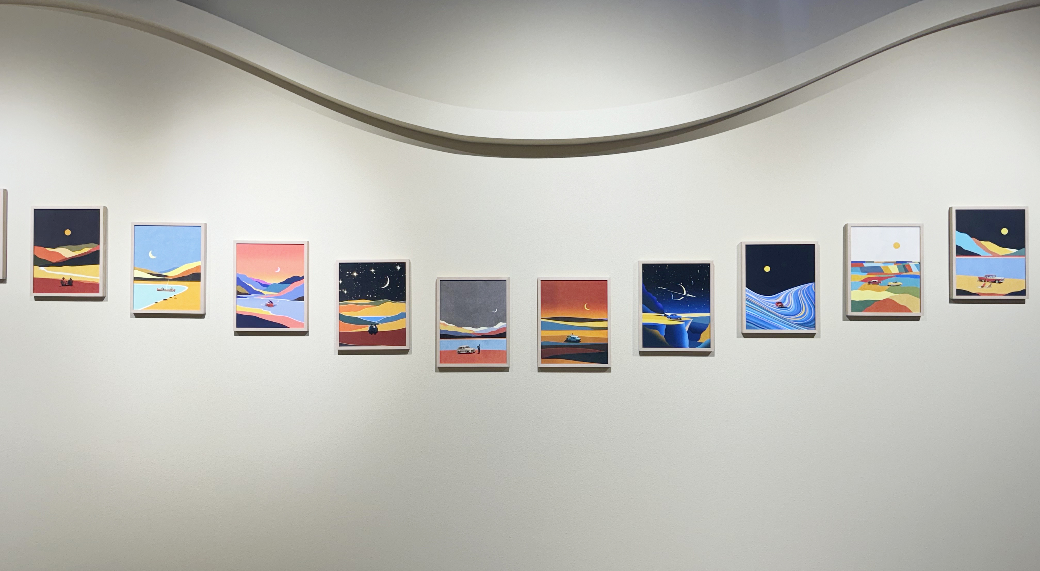작가의 작품에는 ‘구름’과 ‘달’이 빈번하게 등장하는데요. 이는 일출과 일몰의 아름다운 색감과 우주에 대한 평소의 관심을 반영합니다. 평소 일상에서 떠오르는 아이디어를 메모해 두고 차분하게 누워 깊이 생각해 보는 시간을 갖습니다. 대략적인 아이디어가 떠오르면 스케치를 하며 아이디어를 시각화하여 무드 보드를 만들죠. 전체 작품이 파스텔 색감으로 뒤덮여 지며 각각의 작품이 서로 연결된 듯하면서도 몽환적인 배경을 다양하게 표현되었는데요. 작품 속 집과 구조물에서 어떤 일들이 일어날 수 있을지 상상을 더해보세요.