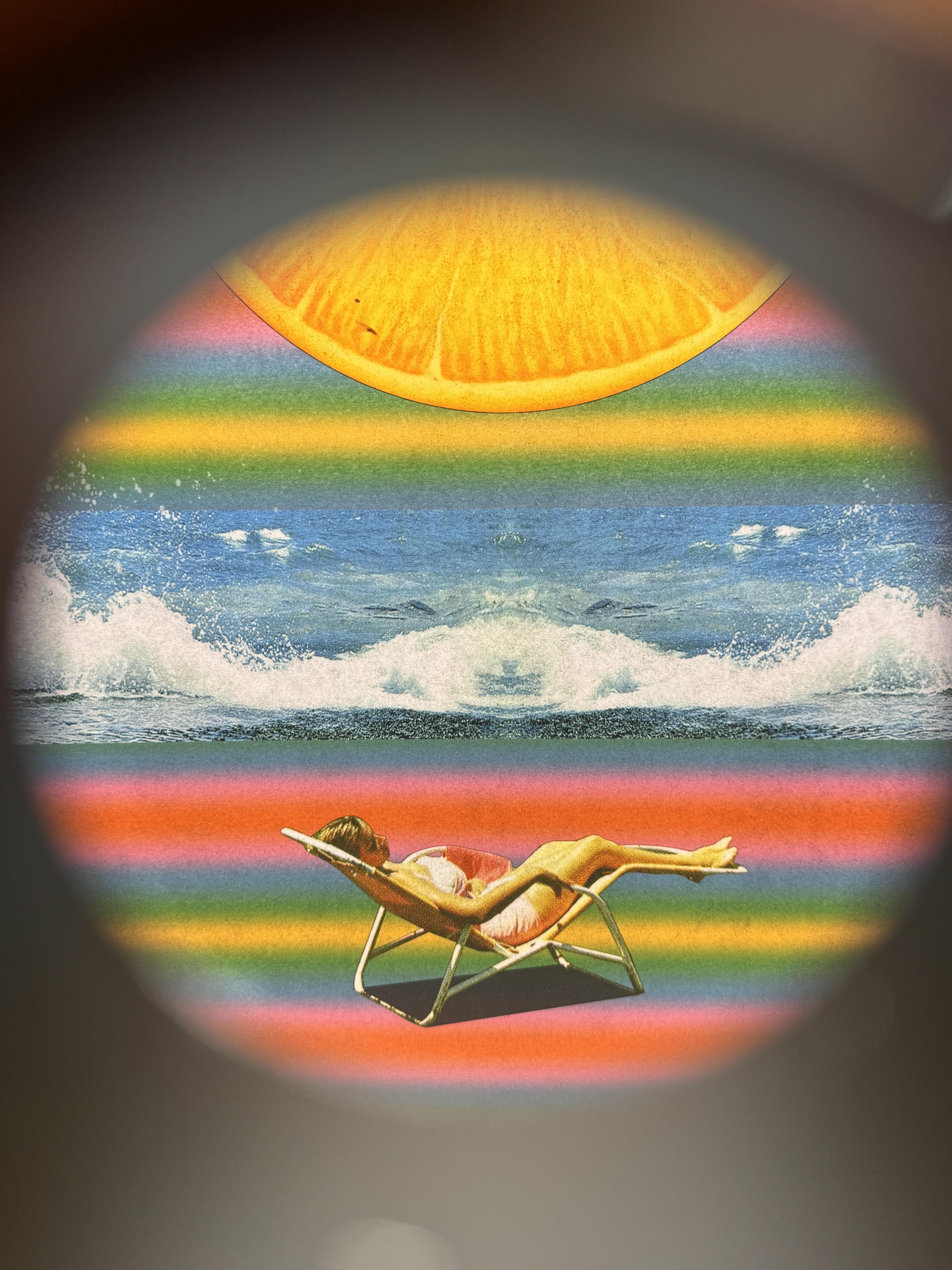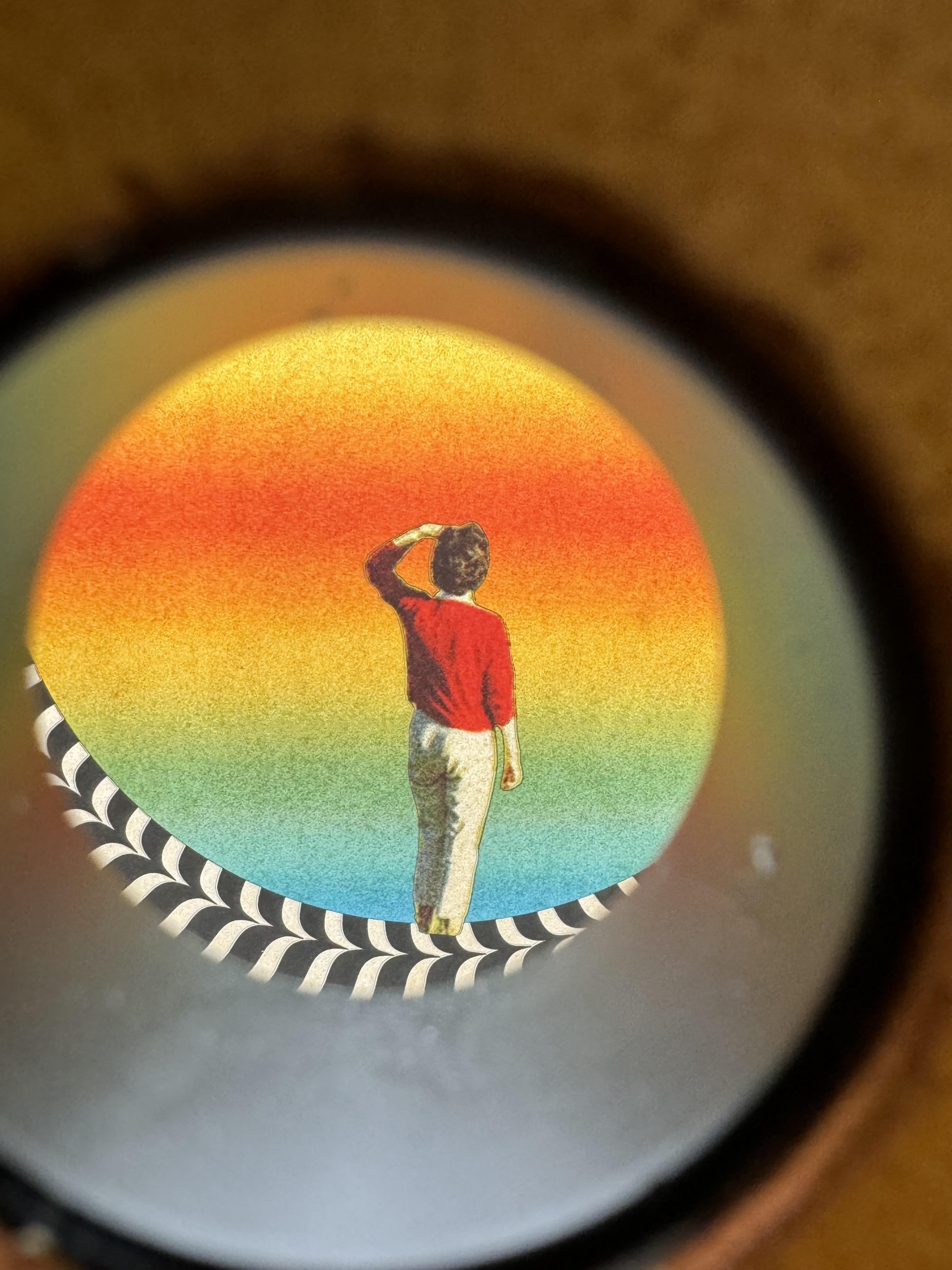 벽면에 설치된 작은 렌즈를 통해 마리아노 페치니티의 작품을 들여다볼 수 있습니다. 콜라주 작가이자 뮤지션인 마리아노 페치니티는 예술이 사람들로 하여금 주관적이고 깊이 사유하게 한다고 믿으며, 치유와 행복의 메시지를 작품에 담아냅니다. 작가의 작품에 자주 등장하는 소재, ‘무지개’를 통해 아름다움과 희망에 대한 상징성을 표현하는 것을 즐깁니다.