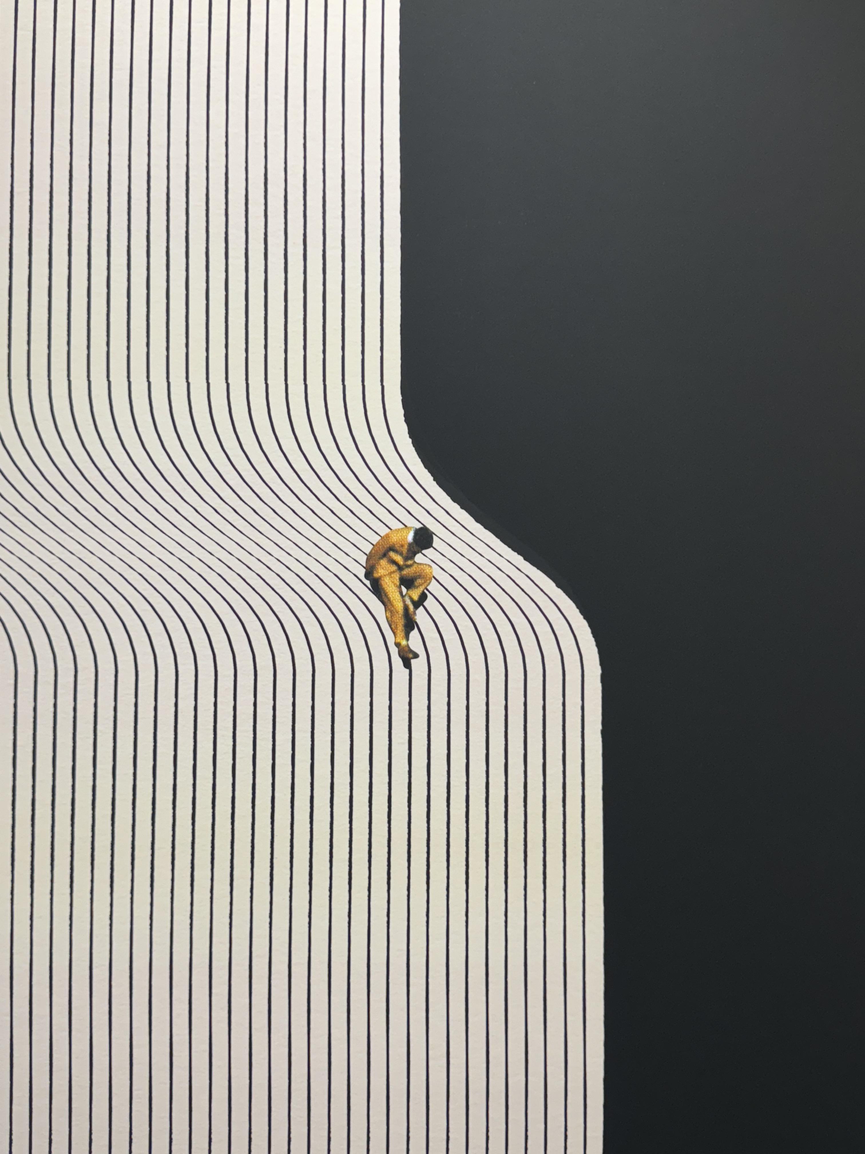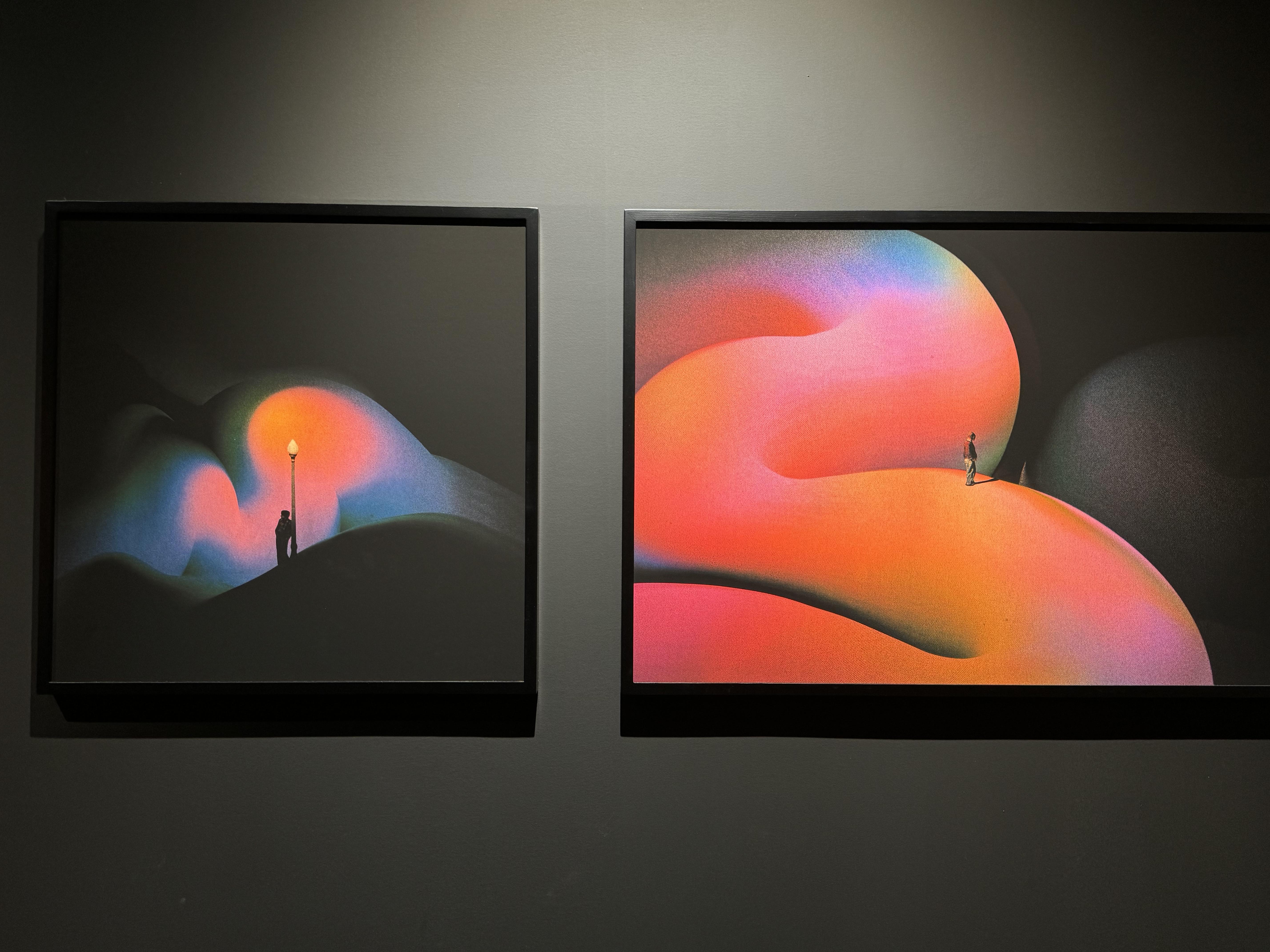 두 명의 작가가 콜라주한 [Lost in Psychedelia]는 두 가지의 시선으로 작품을 관람할 수 있습니다. 발렌틴 파바조의 작품 속에서는 광활한 초현실 세계에서 길을 잃어버린, 외로운 인물들과 그 시선을 따라 어두움과 밝음, 외로움과 안정감이 공존합니다. 작가는 낯선 곳에서 길은 잃은 것이 불안할지, 즐거울지는 생각하기에 따라 다른 것임을 이야기합니다.