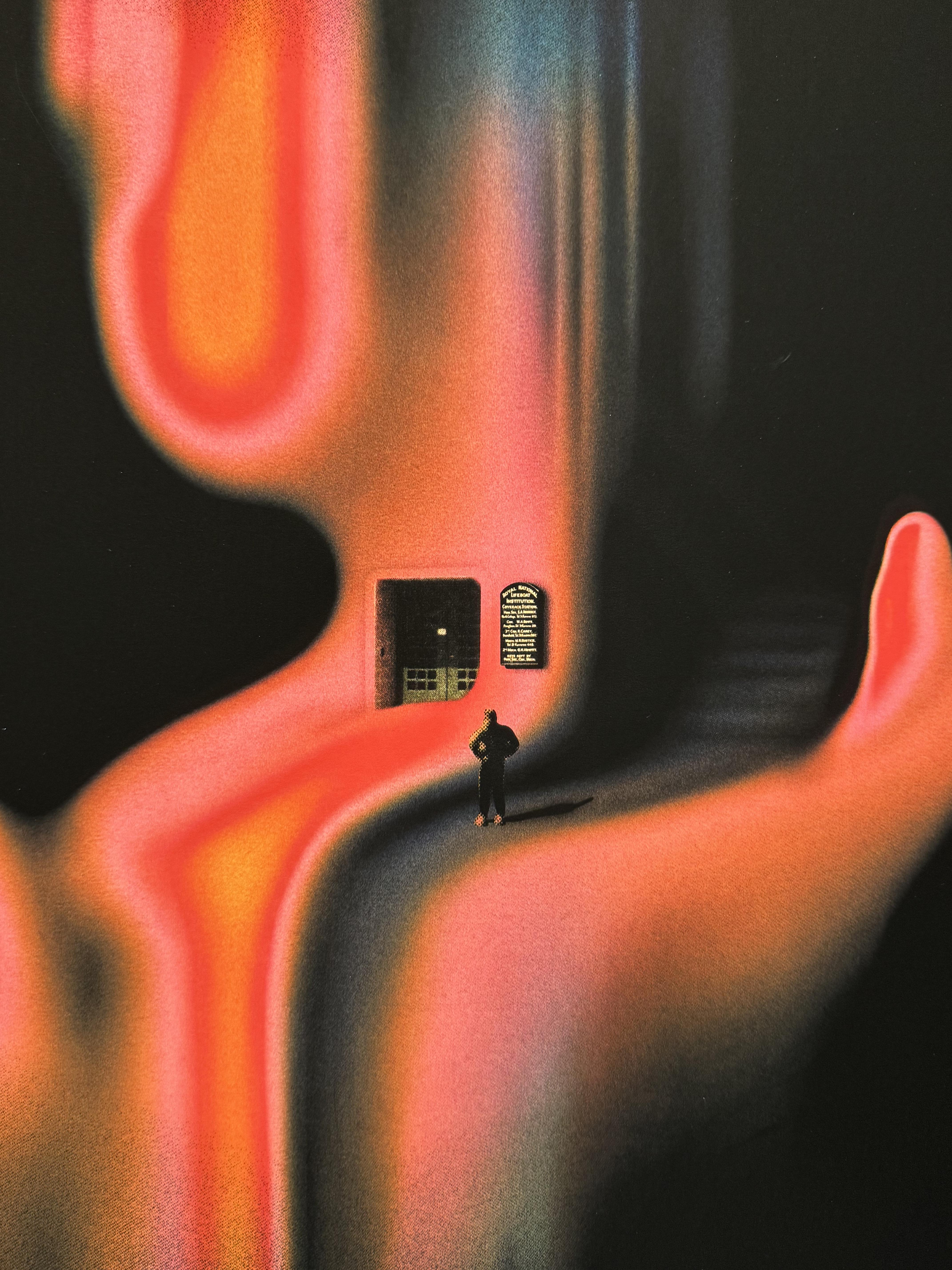 어두운 우주 한가운데 지상을 향하는 계단으로 다시 발을 내딛는 사람. 이는 내면의 공허함을 경험하면서도 결국 현실의 무게를 다시 받아들이는 과정을 나타낸다고 합니다.