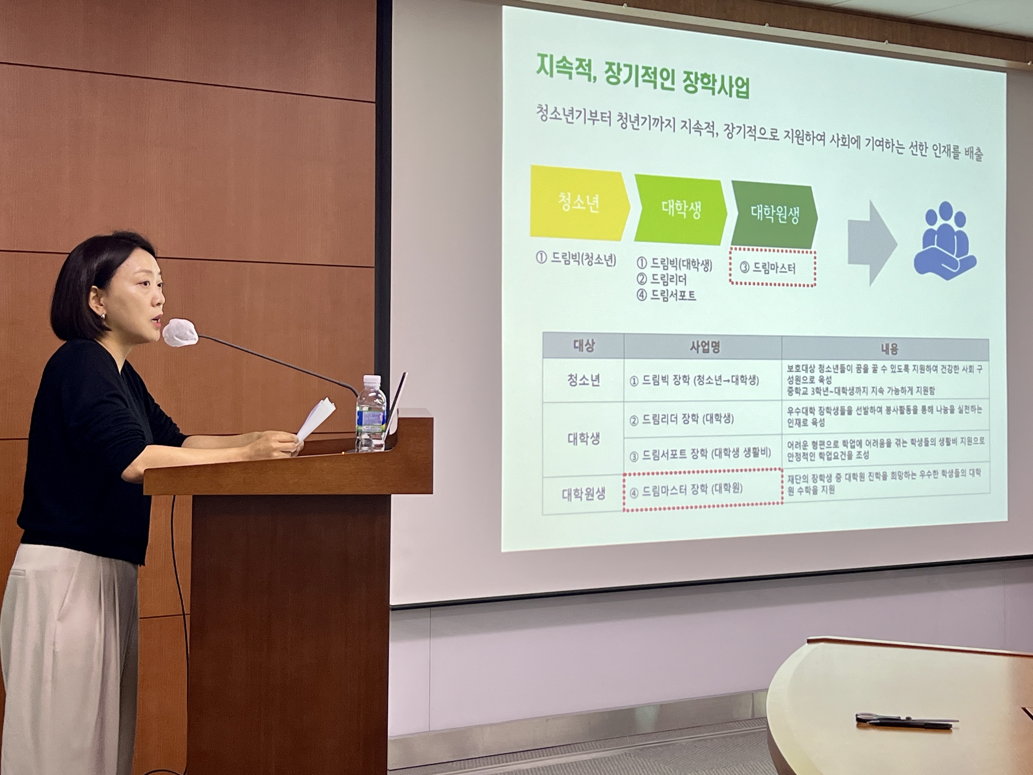 “장학사업이 일회성 수혜로 끝나는 것이 아니라 청소년기부터 청년기까지 지속적이고 장기적으로 지원해 사회에 기여하는 선한 인재로 성장할 수 있도록 청소년, 대학생, 대학원생에 이르는 단계별 프로그램으로 마련했습니다.”