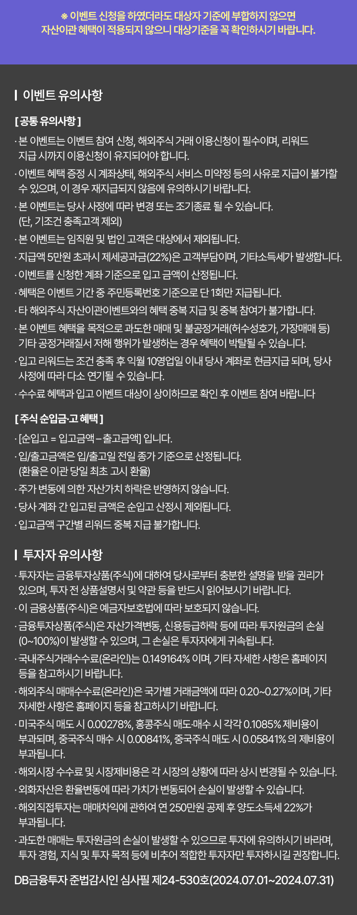 Home > 미국주식 자산이관 이벤트 2024. 7. 2. 09:00 이벤트 기간 2024.07.01 (월) ~ 2024.07.31 (수) 이벤트 대상 디지털(비대면/은행개설) 고객 (지점계좌 제외) 대상 중 이벤트 신청고객 이벤트 내용 미국주식 옮기면 최대 25만원 지급 (선착순 500명) 공유하기 게시글 관리 DB Story 저작자표시 비영리 변경금지 (새창열림)