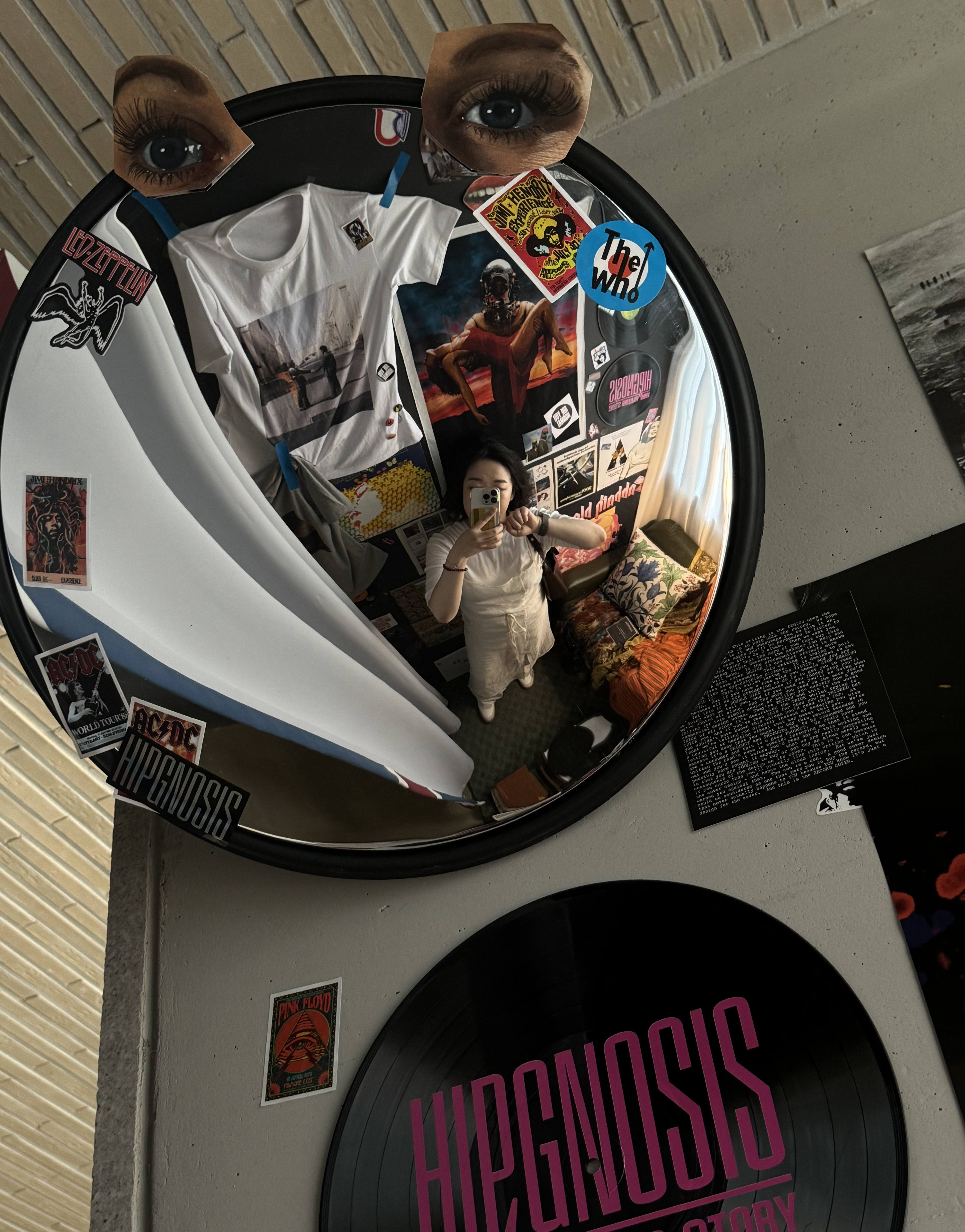 중간중간 재미있는 사진을 남길 수 있는 포토존들이 마련되어 있는데요. 전시를 모두 관람 후에 마주하는 힙노시스의 다양한 앨범 커버들을 배경으로 남길 수 있으니 이 공간에서 둘둘 말려 있는 포스터를 펼쳐 들고 재미있는 인증 사진을 남겨 보세요. 전시 관람을 마치고 내려가는 구석 한편에는 마치 힙노시스 스튜디오가 이런 모습이었을까? 상상할 수 있는 작은 공간이 있답니다. 사진에는 없지만, 4층까지 올라오며 지나친 전시 공간들에도 숨어 있는 포토존들을 만날 수 있는데요. 달 위에서 찍히는 듯한 신기한 스팟, 4층 야외 공간에 마련된 설치 작품도 놓치면 아쉬울 포토존이랍니다.