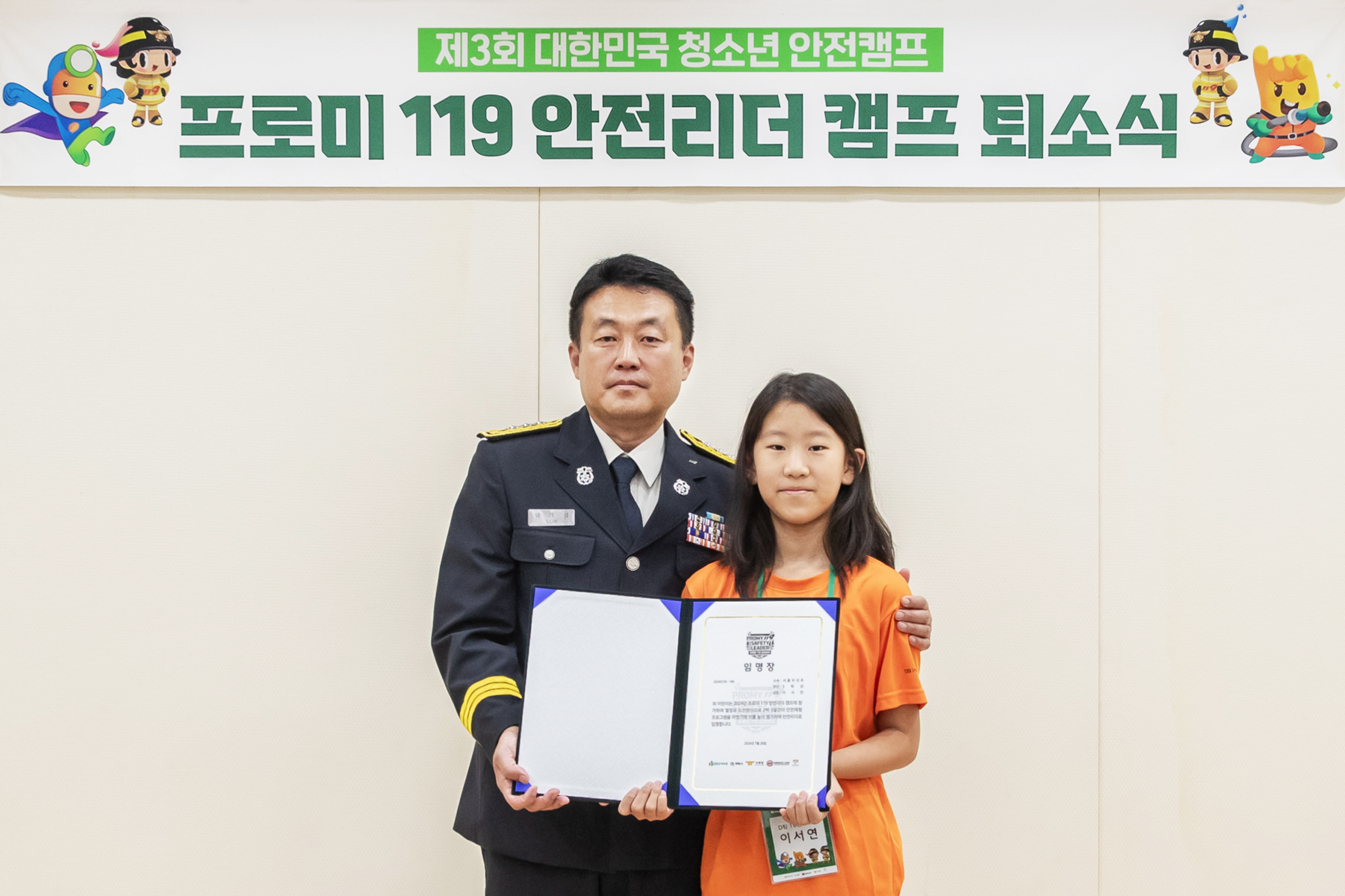 모든 안전리더들에게 임명장과 배지를 수여해 안전리더로서의 자긍심과 리더십을 되새긴 시간. 캠프 때 보여준 적극적이고 용감한 모습으로 미래 대한민국 안전리더가 될 친구들의 앞날을 응원한다.