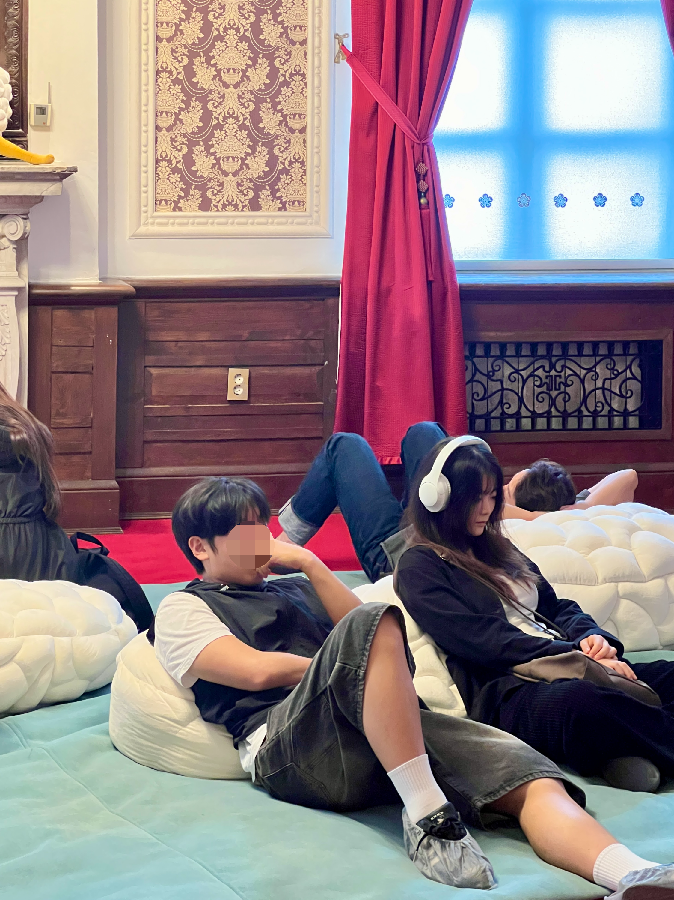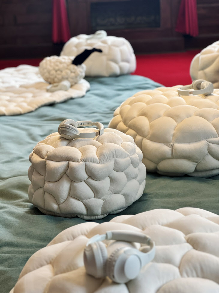 귀빈실에서는 한국 최초 ASMR 크리에이터 미니유와 섬유작가 인영혜의 협업으로 탄생한 〈Floating Mind〉(2024)를 만납니다. 이 작품은 소프트 스컬프처(Soft Sculpture)에 lo-fi ASMR 사운드를 더해 번잡하고 분주한 일상에서 벗어나 자아를 성찰하고 다시 연결되어 자신의 내면과 소통할 기회를 제공해요.